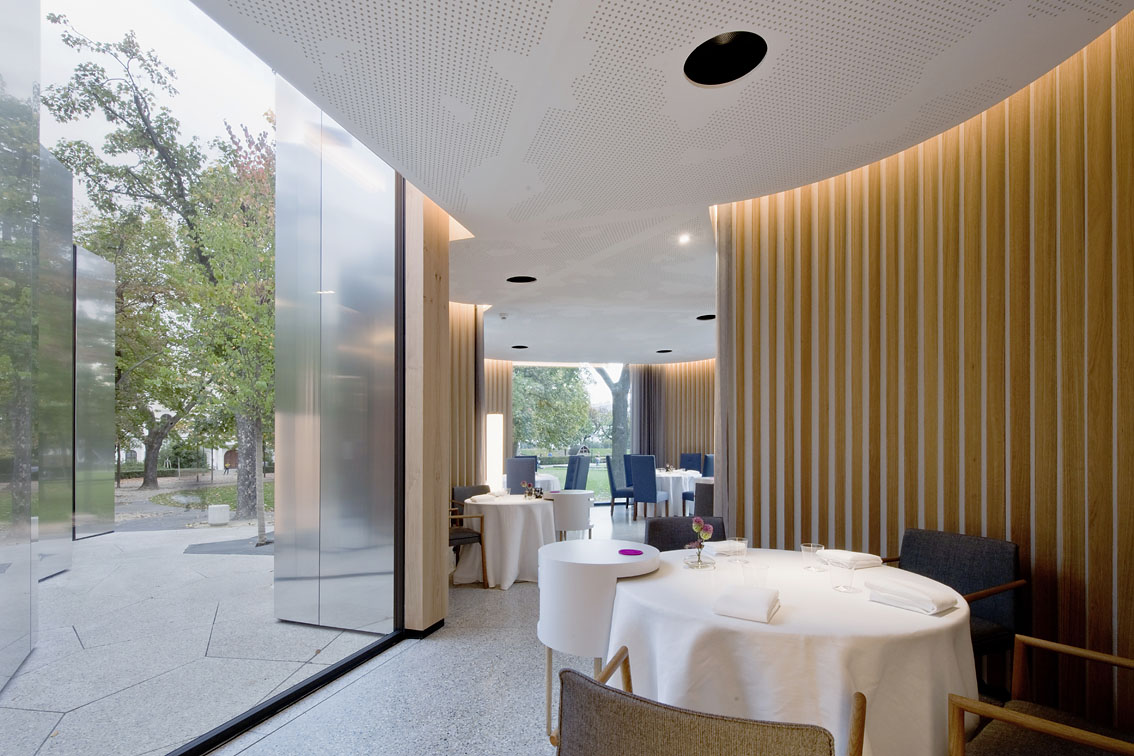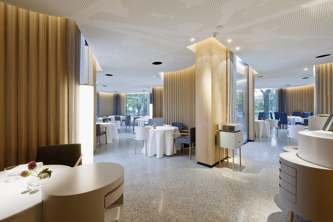Zugleich ist der `Tisch´ zentrales und essentielles Element des Entwurfes, um den Ansprüchen des Restaurants Steirereck gerecht zu werden. Denn das gesamte Service dreht sich um den Tisch. Dieser wird lediglich 1 x pro Abend vergeben. Die dafür angelegten Nischen sowie ihre individuellen Blickbeziehungen zum Stadtpark geben– bei höchsten akustischem und thermischem Komfort – dabei gleichermaßen das Gefühl, zuhause und im Freien zu verbringen.