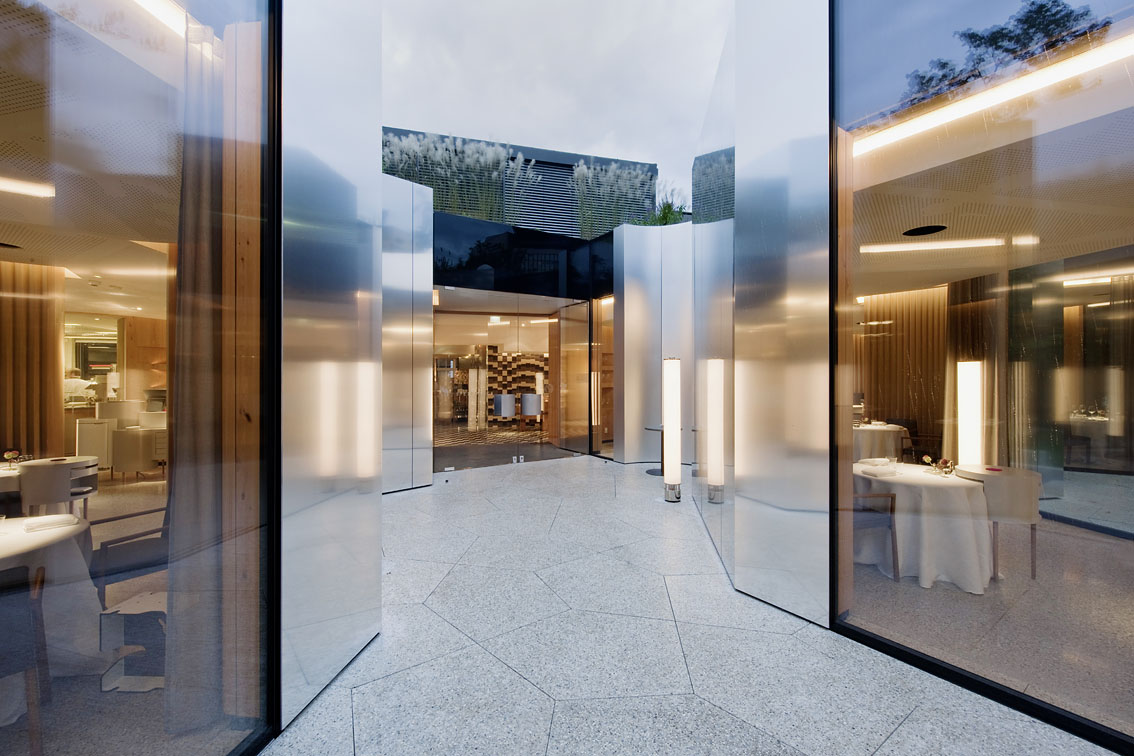 Der Mittelteil – zwischen bestehendem Gastraum und den neuen Pavillons – ist die Drehscheibe des Restaurants. Er ist Empfang und Kreuzungspunkt zwischen Gast- und Servicebereichen. Fern an Küche erinnernde Fliesenmuster und Vitrinen, gefüllt mit Zutaten für den täglichen Gebrauch in der Küche tragen zum Gefühl bei, dabei zu sein, im Zentrum des guten Essens.