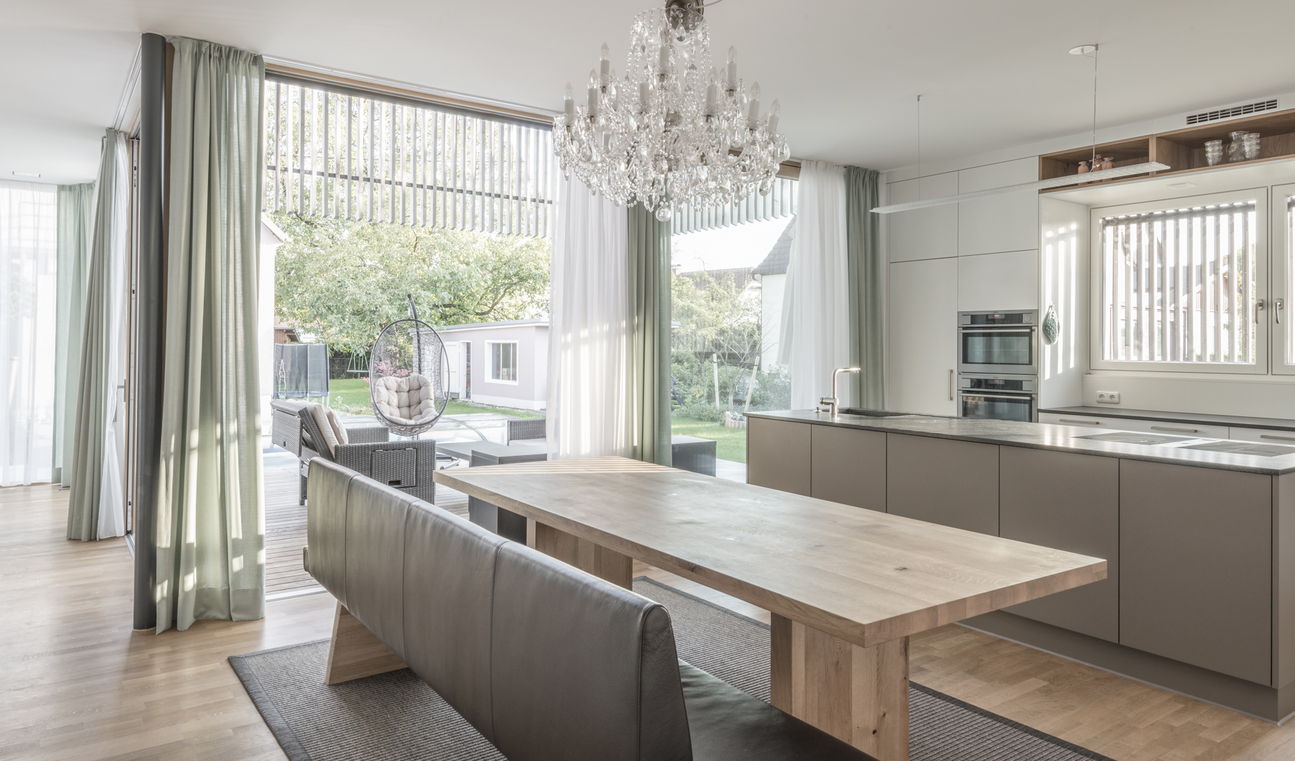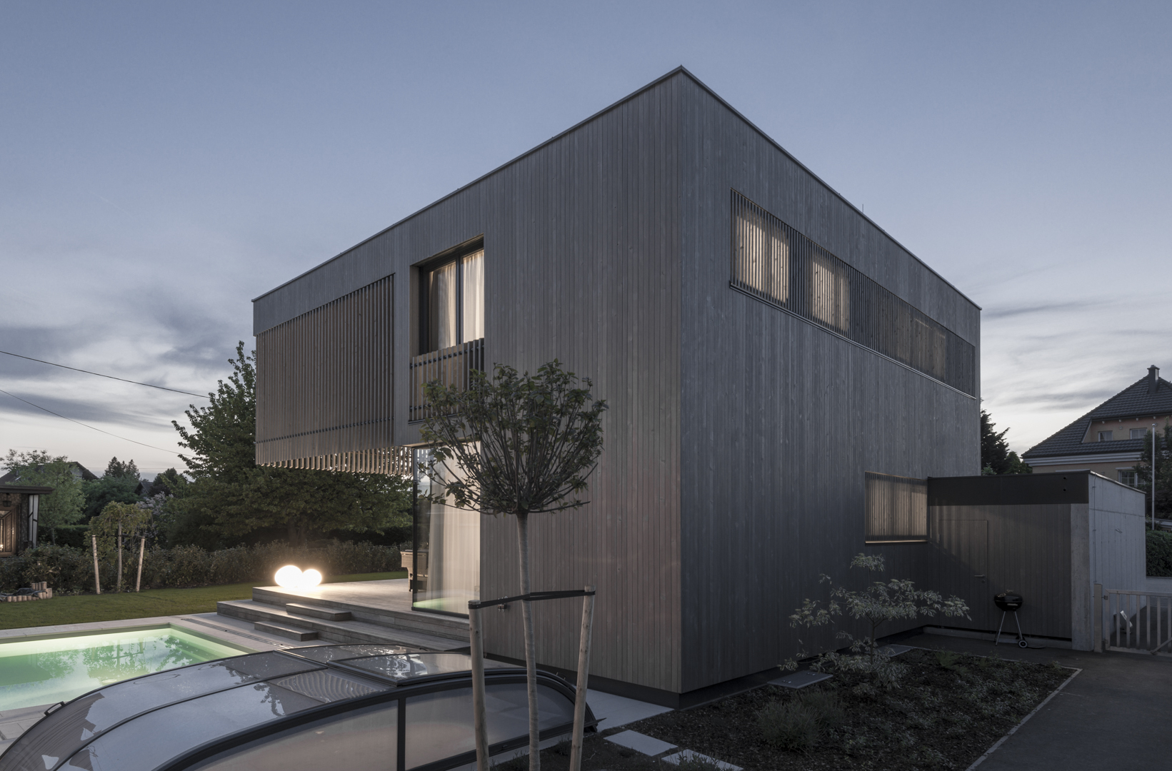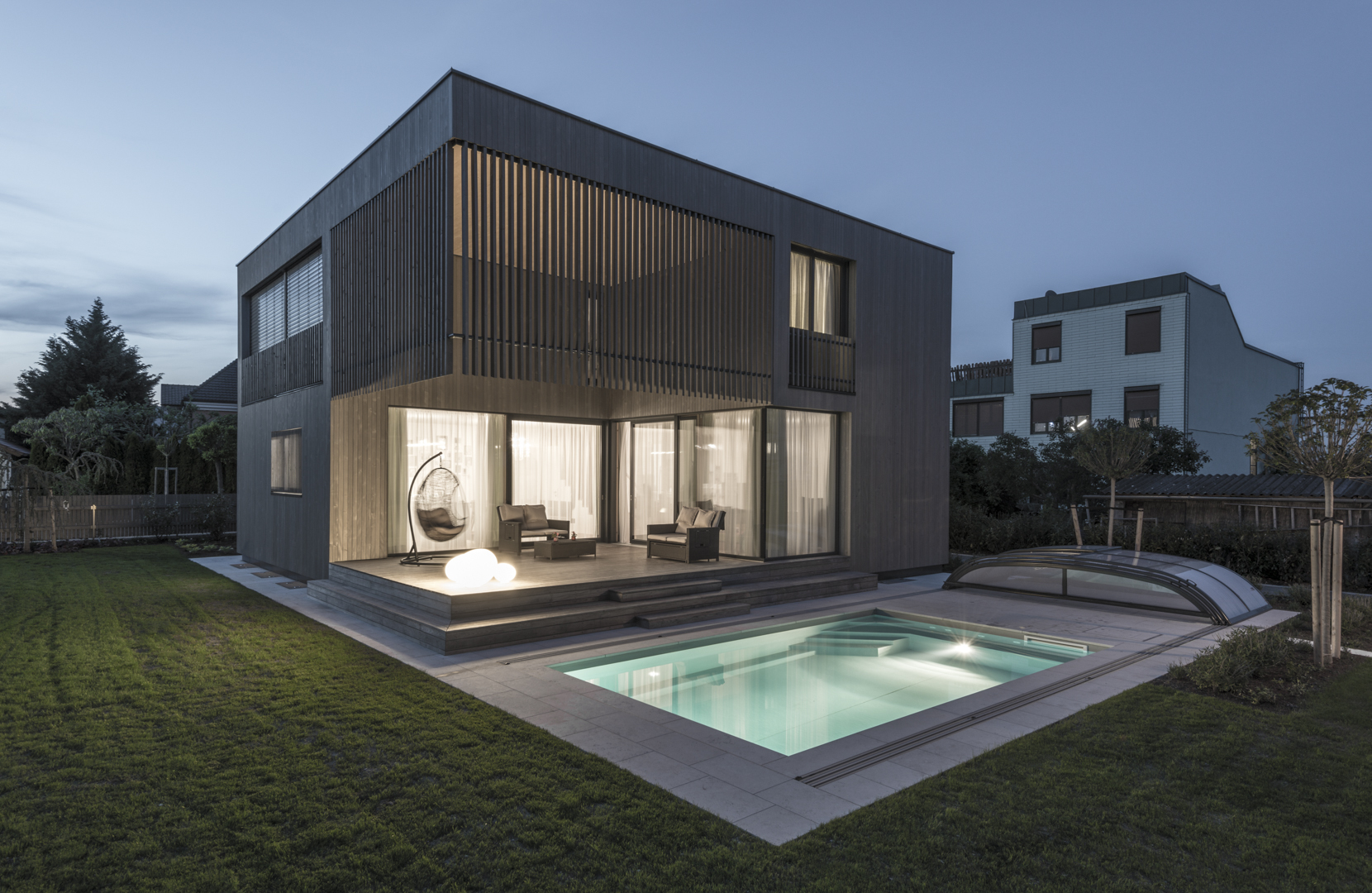 Die Holzterrasse wurde zum Mittelpunkt der Familie, sie dient als Kommunikations- und Rückzugsraum in einem. Ihr vorgelagert ist ein Pool, der mit seiner Gestaltung und der anschließenden Gartengestaltung das kleine Grundstück optimal bespielt.