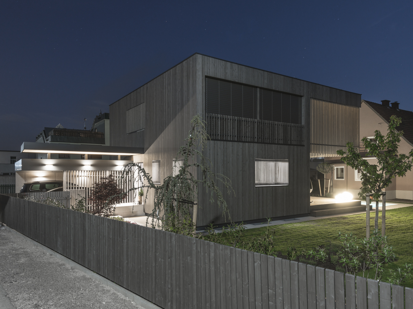Ein offenes Carport bestreitet den Raum zur Straße und beschützt mit seinem auskragenden Dach den Eingang, der für den Fall um einen Liftzubau erweiterbar ist. (Text: Architektin)