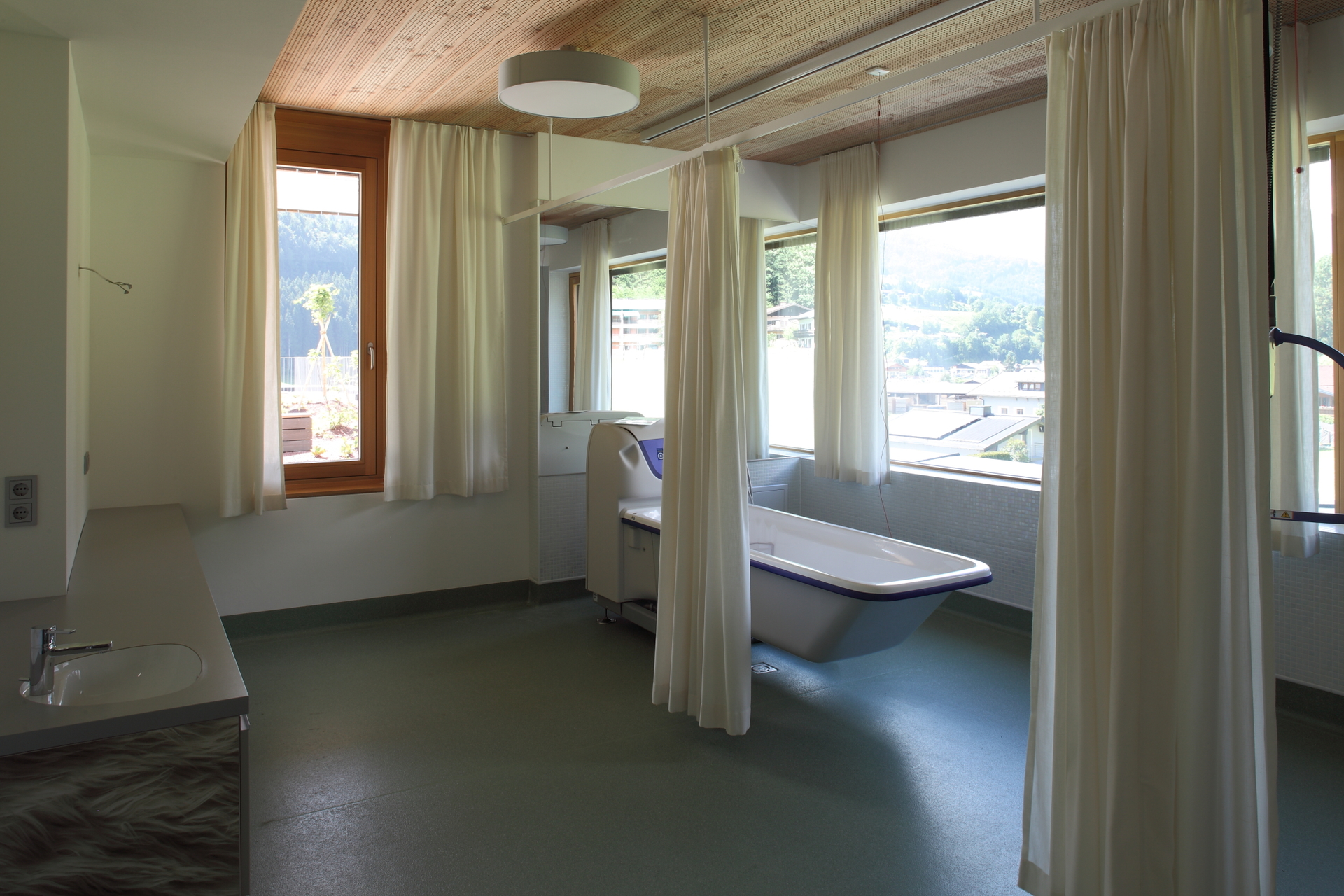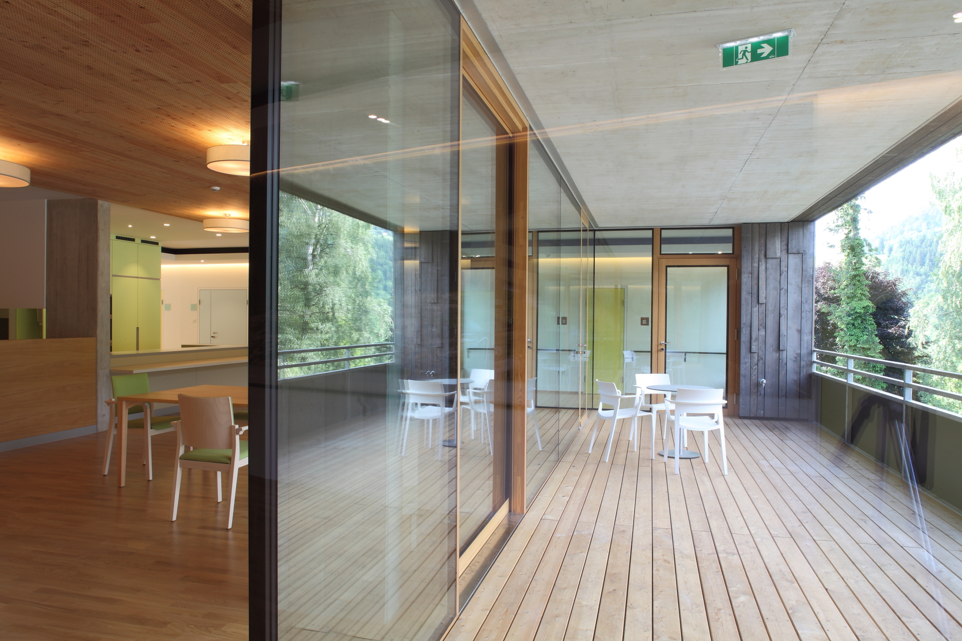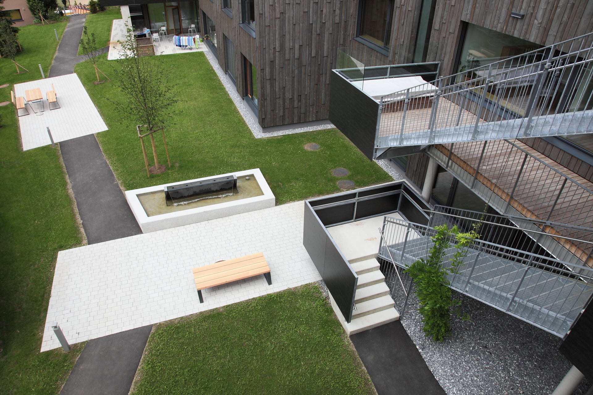 Die Aufenthaltsbereiche öffnen sich mit südorientierten Terrassen in den Garten. Ein Hochbeet je Wohnung ermöglicht die Selbstversorgung mit Kräutern und Blumen. Arbeits- und Essplätze in der Nähe der Kochgelegenheit erlauben den Bewohnern unter Anleitung des als Alltagsmanager bezeichneten Betreuers ein „Mitkochen“. Abgeschirmte Stuben, Sitz- und Fernsehbereiche laden zur Gruppenbildung ein und schaffen Aussicht auf die Bergwelt. Die Zimmer bieten zum üblichen Standard ein großzügiges Fensterelement das als Sitz- / Eckbank dient und somit trotz Pflegebett mehr Wohnzimmer denn Krankenzimmer ist.