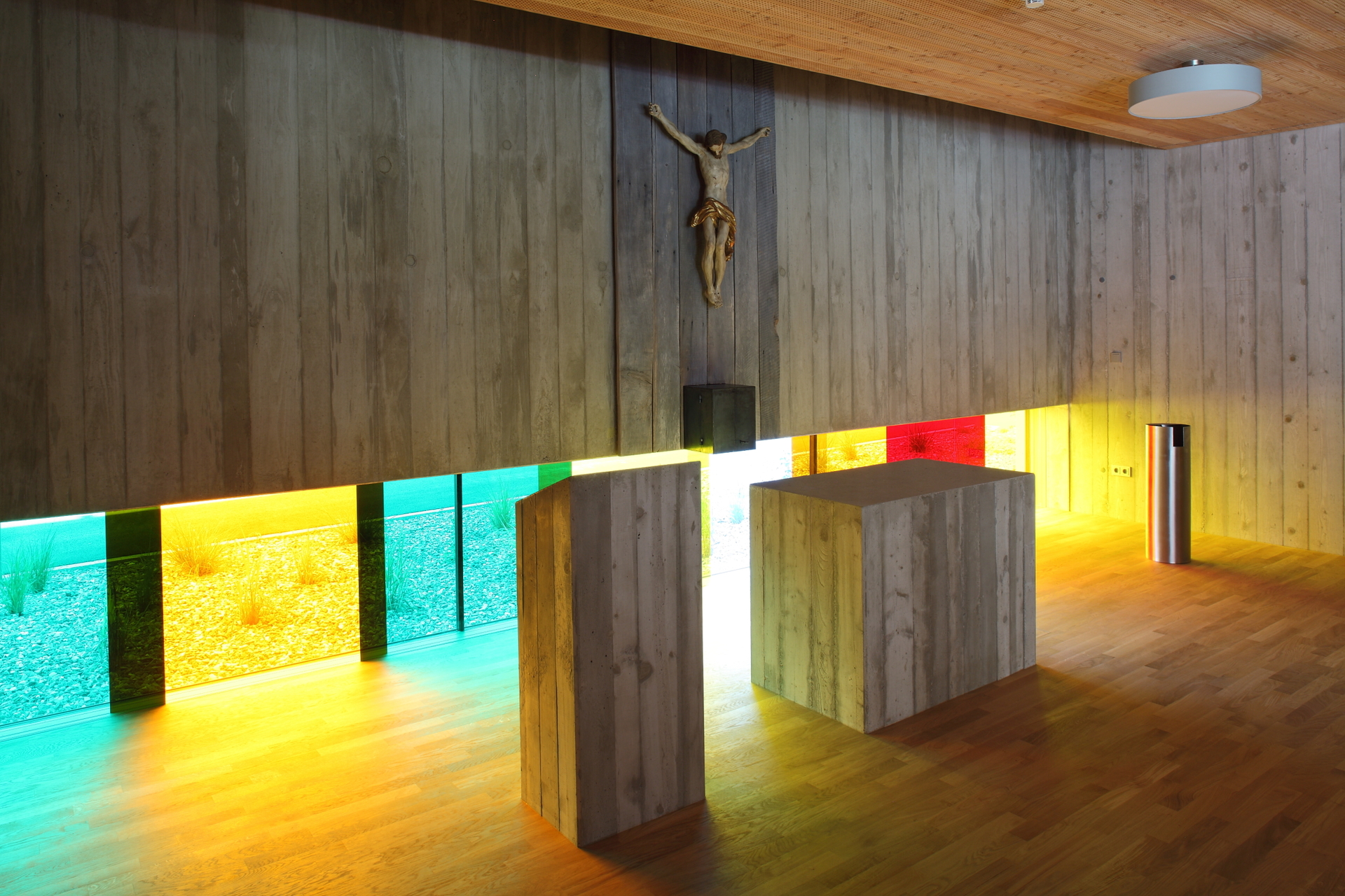 Das nach Süden orientierte Foyer ist der zentrale Empfangs-, Aufenthalts- und Festbereich, von aus dem die kleine Hauskapelle direkt erschlossen wird. Sie kann entweder getrennt oder durch Öffnen der Schiebewände zum Foyer als Großraum genutzt werden Der Zugangsbereich mit seinem teilweise überdachten Vorplatz schafft eine Zone, in der der Außen- und der Innenraum ineinander übergehen.