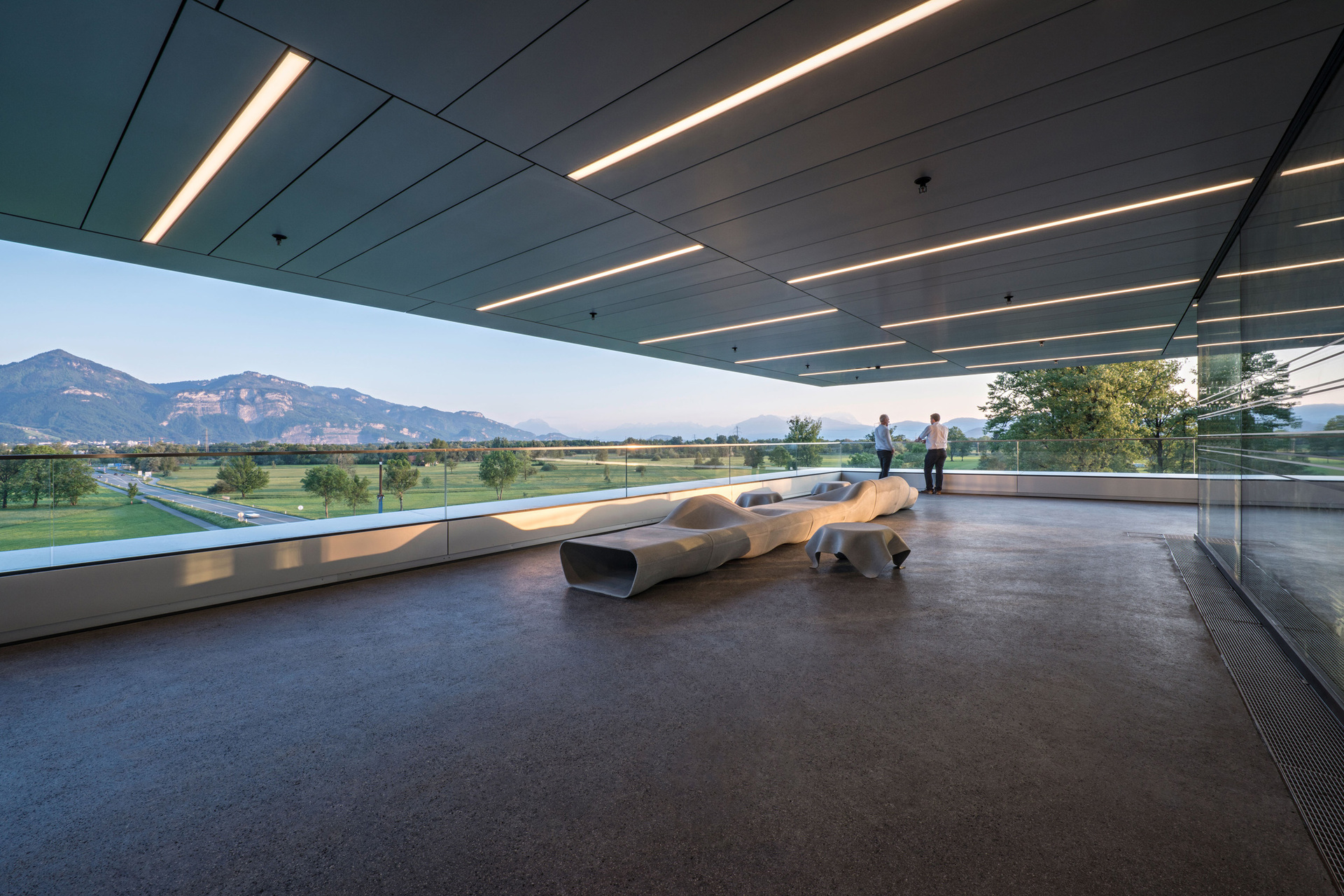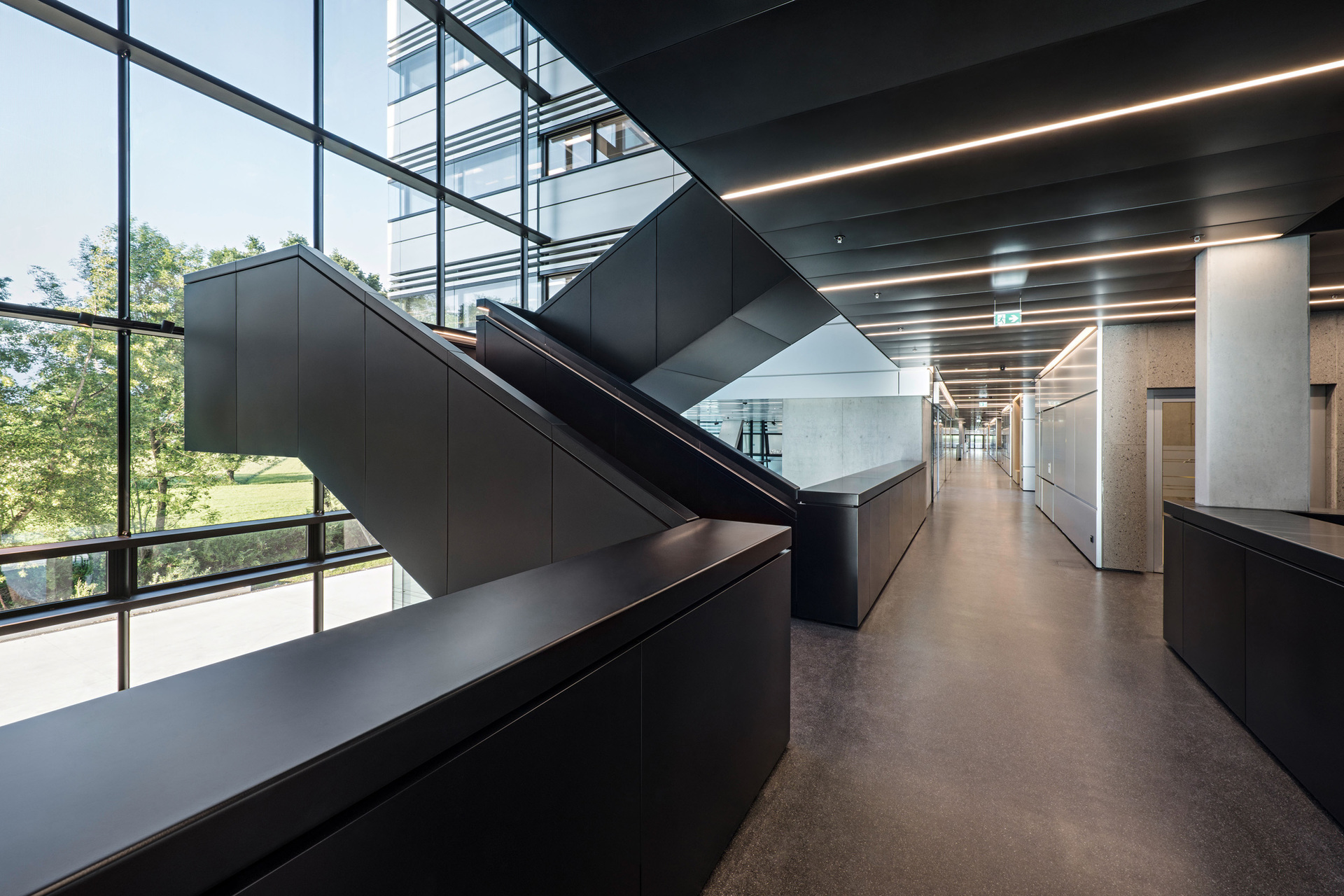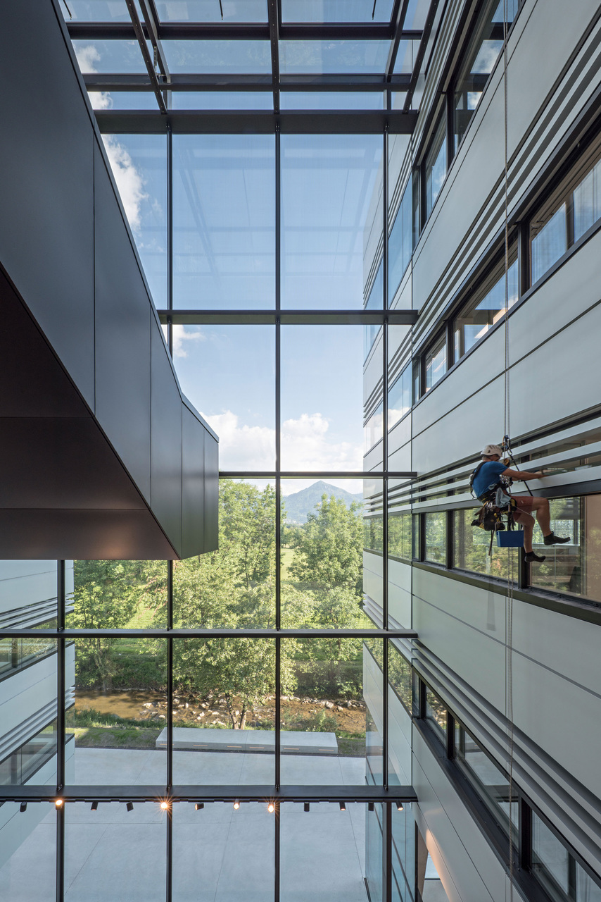 Der Bau unterstreicht Eigenschaften wie Präzision, Innovation und technische Avanciertheit, für die das Vorarlberger Unternehmen steht, gleichzeitig rücken die Mitarbeiter:innen, die hier arbeiten, in den Mittelpunkt. (Text: Architekt:innen)