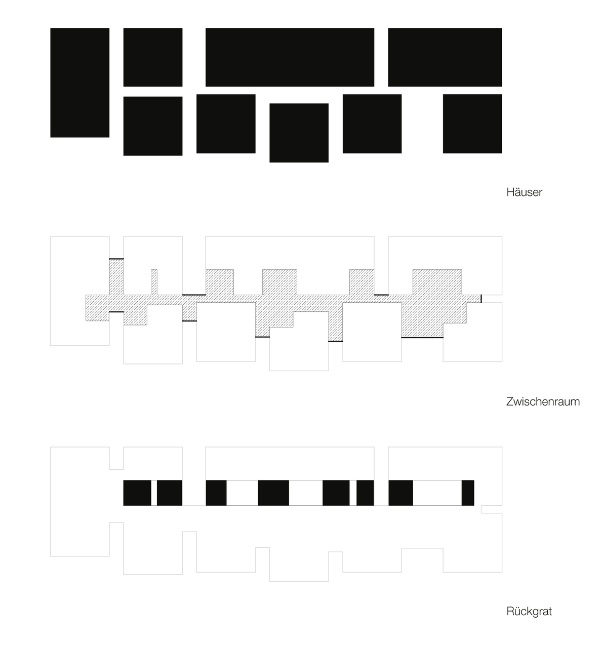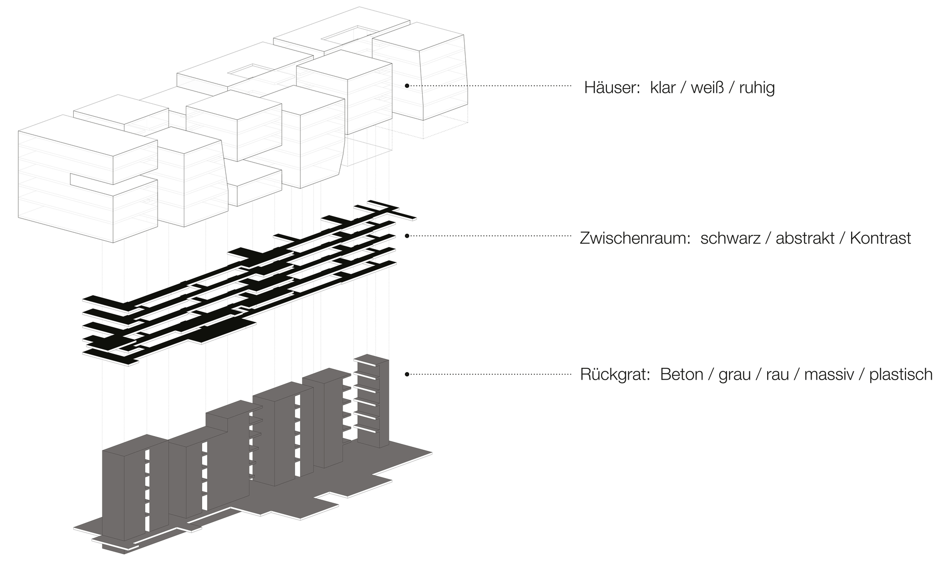 Der räumliche Erlebniswert dieser Erschließungszone mit seinen Ein-, Aus- und Durchblicken ist von hoher räumlicher Qualität und stellt die Besonderheit des Entwurfes dar. Kommunikation, interner Austausch und das Miteinander werden in den Vordergrund gestellt, gleichzeitig ist Konzentration und ruhiges Arbeiten möglich.