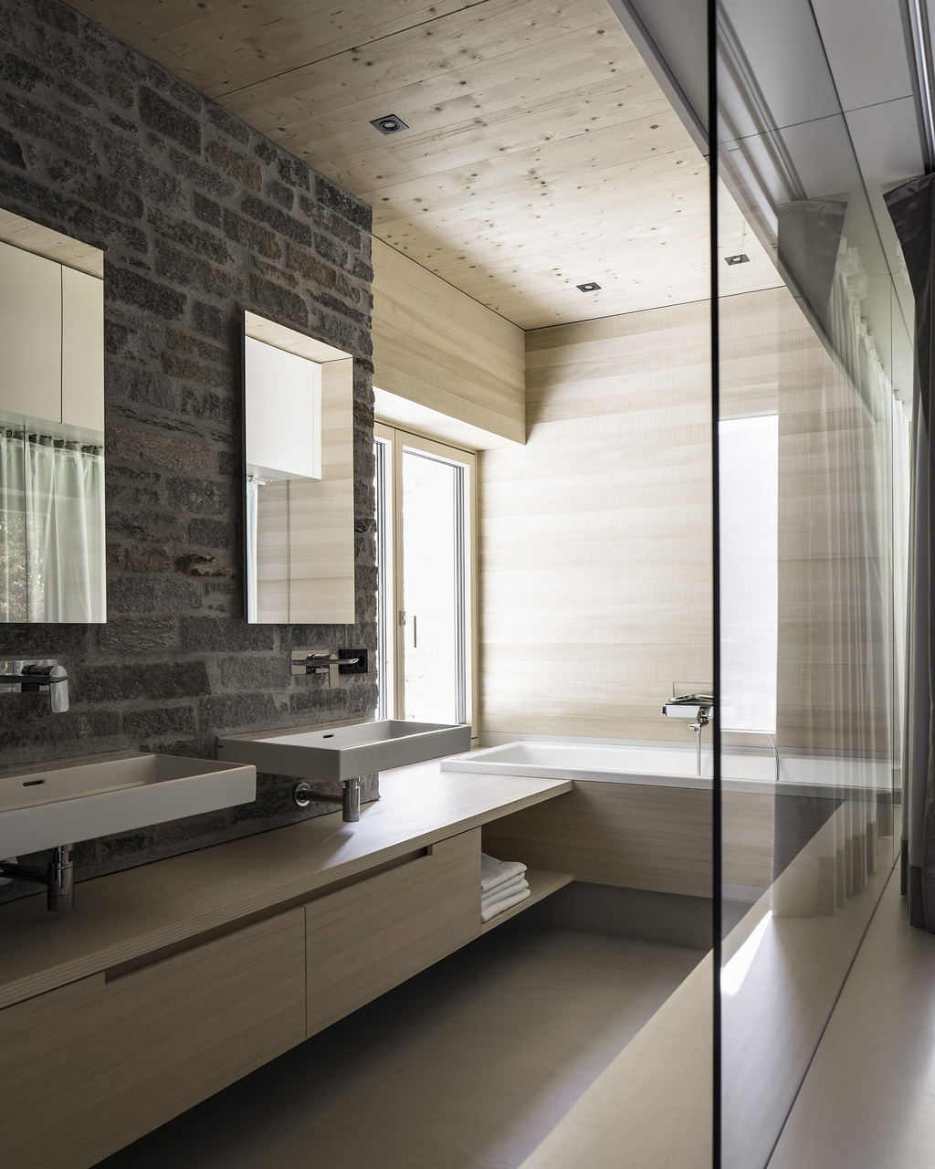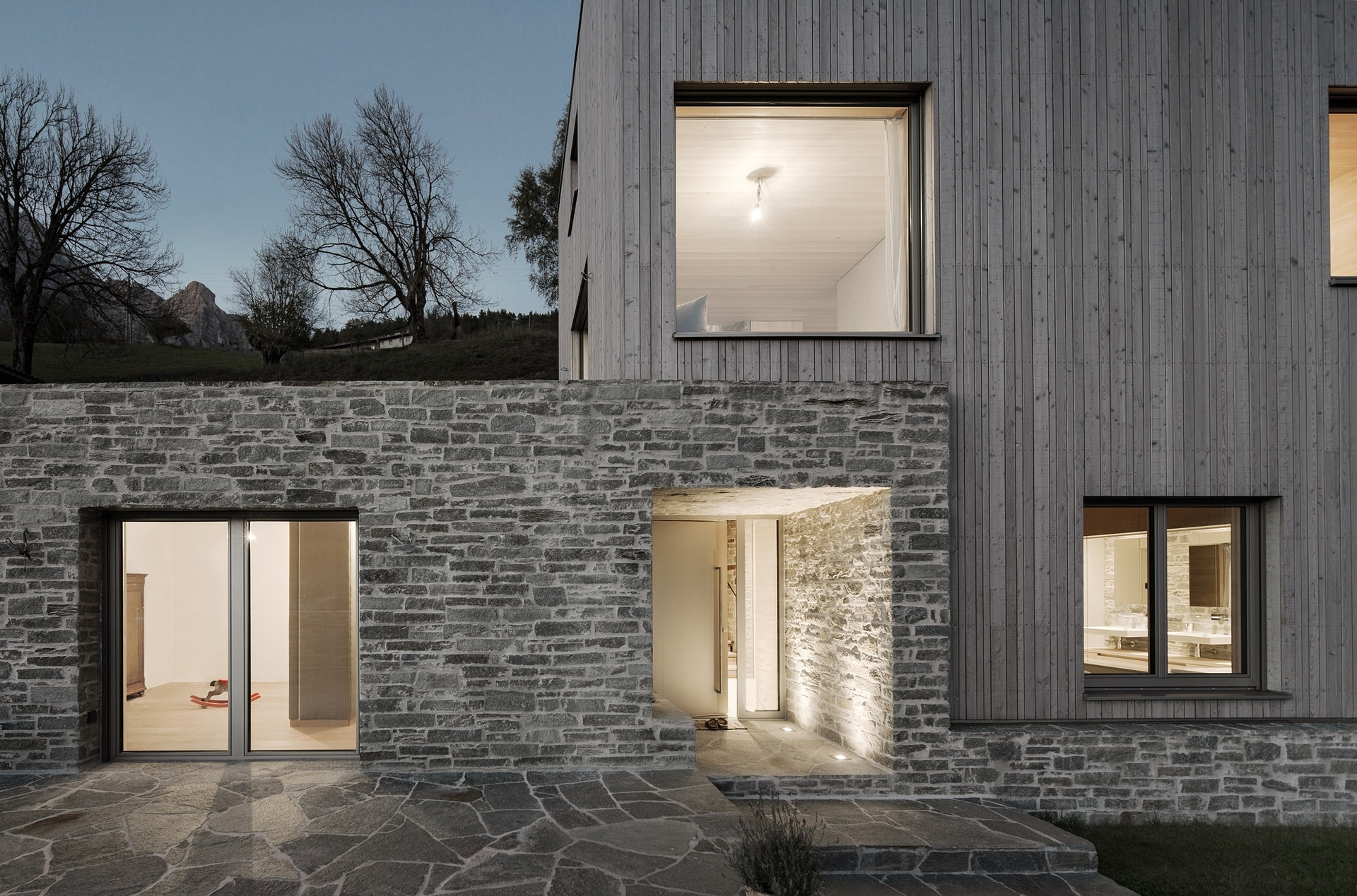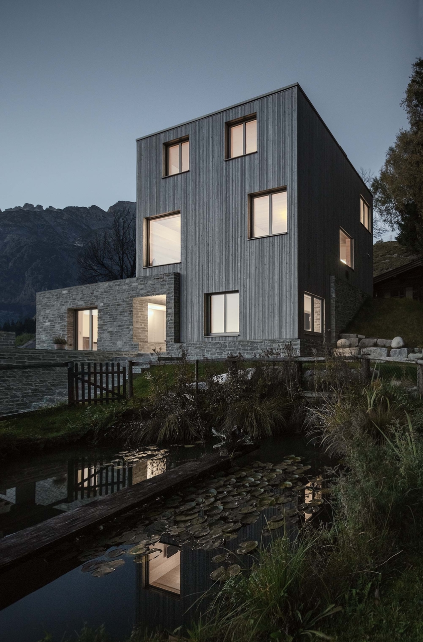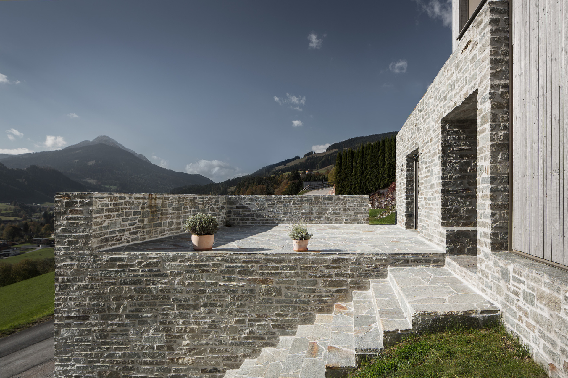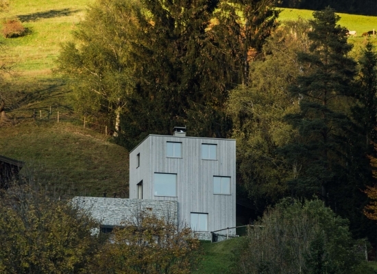 Der Baukörper ist in zwei Teile gegliedert, einen massiven Sockel aus Stein und einen darauf seitlich versetzten Holzbaukörper. Der aus der Hanglage entwickelte Sockel bildet dabei die Basis des Gebäudes und leistet den konstruktiven Holzschutz, indem er den oberen Baukörper vom Gelände löst. Der Überhang des Sockels bildet im Untergeschoss die Nebenräume und im Erdgeschoß die Terrasse.