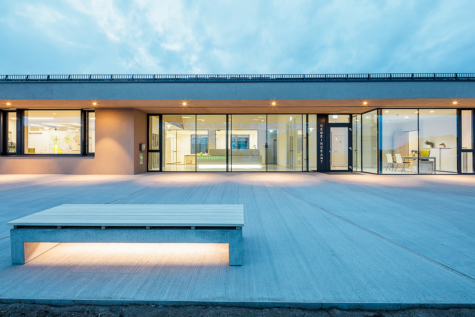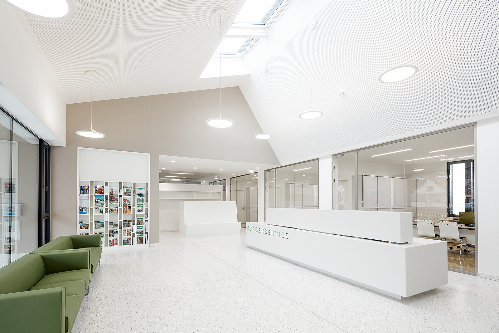 Über den zentralen Windfang gelangt man in das großzügige Foyer mit Bürgerservice und Wartebereichen. An diesen mit einer besonderen Raumhöhe ausgestatteten Zentralraum gliedern sich die einzelnen Büros im Norden und das Bauamt mit Archiv im Süden an. Glaswände verbinden räumlich Büros und Bürgerservice, erleichtern die Kommunikation und schaffen eine offene und freundliche Atmosphäre. Der im östlichen Gebäudeabschluss platzierte Sitzungssaal bildet den Kopf des Raumgefüges. Die Sonderstellung dieser auch als Mehrzweckraum benutzbaren Fläche wird durch eine bis in die Dachschrägen reichende Decke und spezielle Öffnungen artikuliert. Ein aus der Ostfassade heraustretendes großes Fenster dient als Sitznische und stellt die optische Verbindung zum Rüsthaus mit Kultursaal her. Je nach Nutzung kann der Sitzungssaal zum Vorplatz hin geöffnet werden.