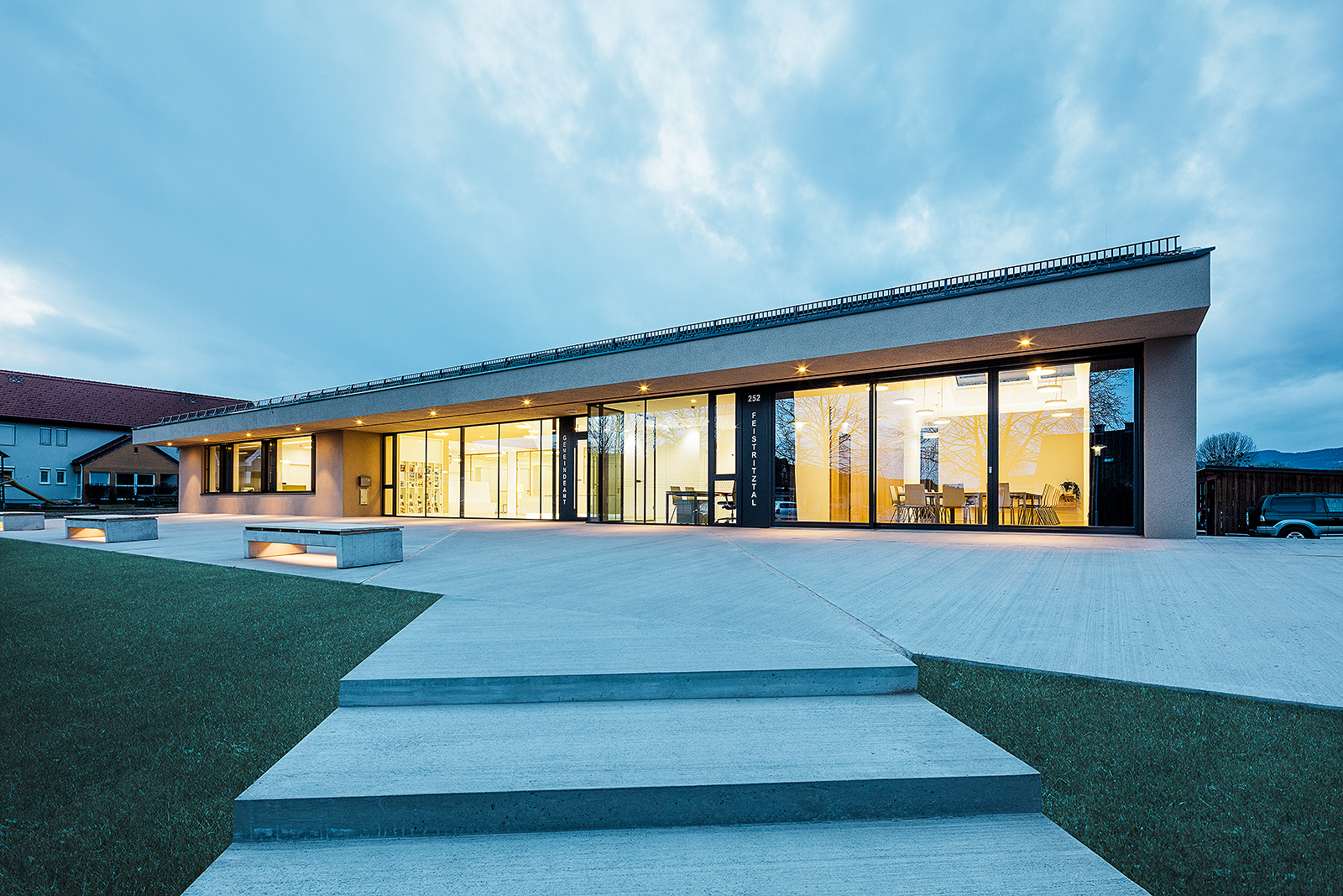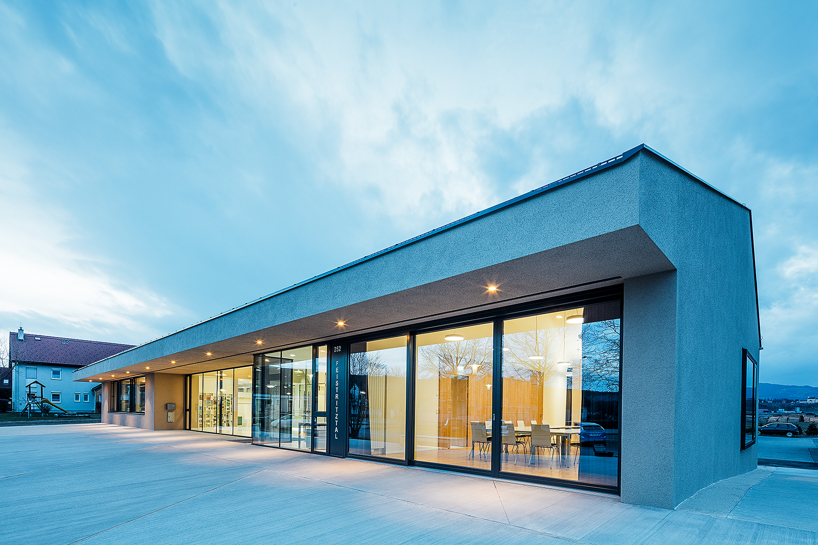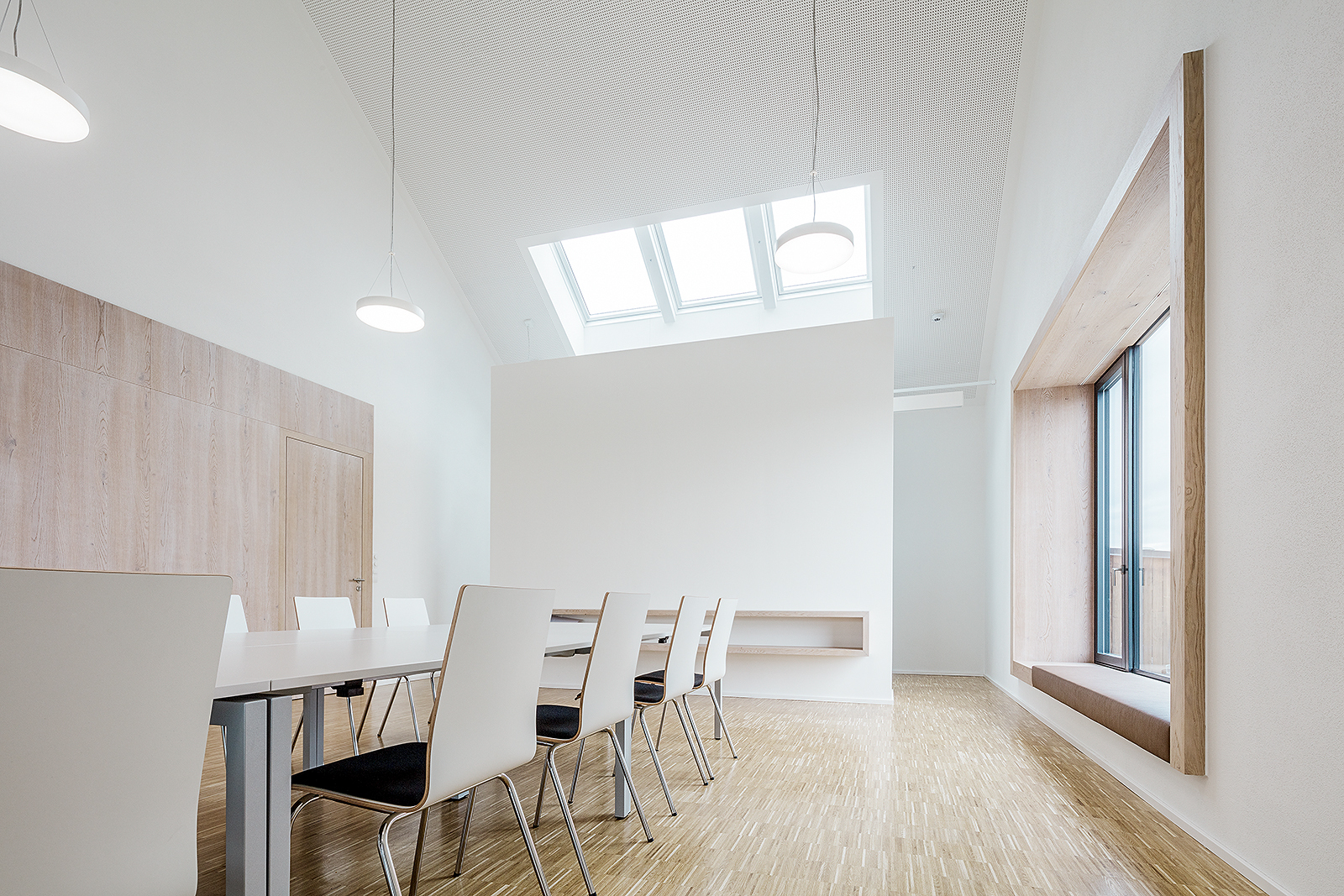 Die Architektur nimmt das Thema des Satteldachs auf und betont die sich daraus ergebenden innenräumlichen Qualitäten durch spezielle Deckenausbildungen, Raumhöhen, Lichtführungen und Öffnungen. In der Außenwand wechseln großflächige Fixverglasungen mit tief in der Leibung positionierten Lüftungsflügeln. Der größeren nach Süden asymmetrisch konzipierten Dachfläche liegt die Idee einer optimierten Solarnutzung (PV) zugrunde.