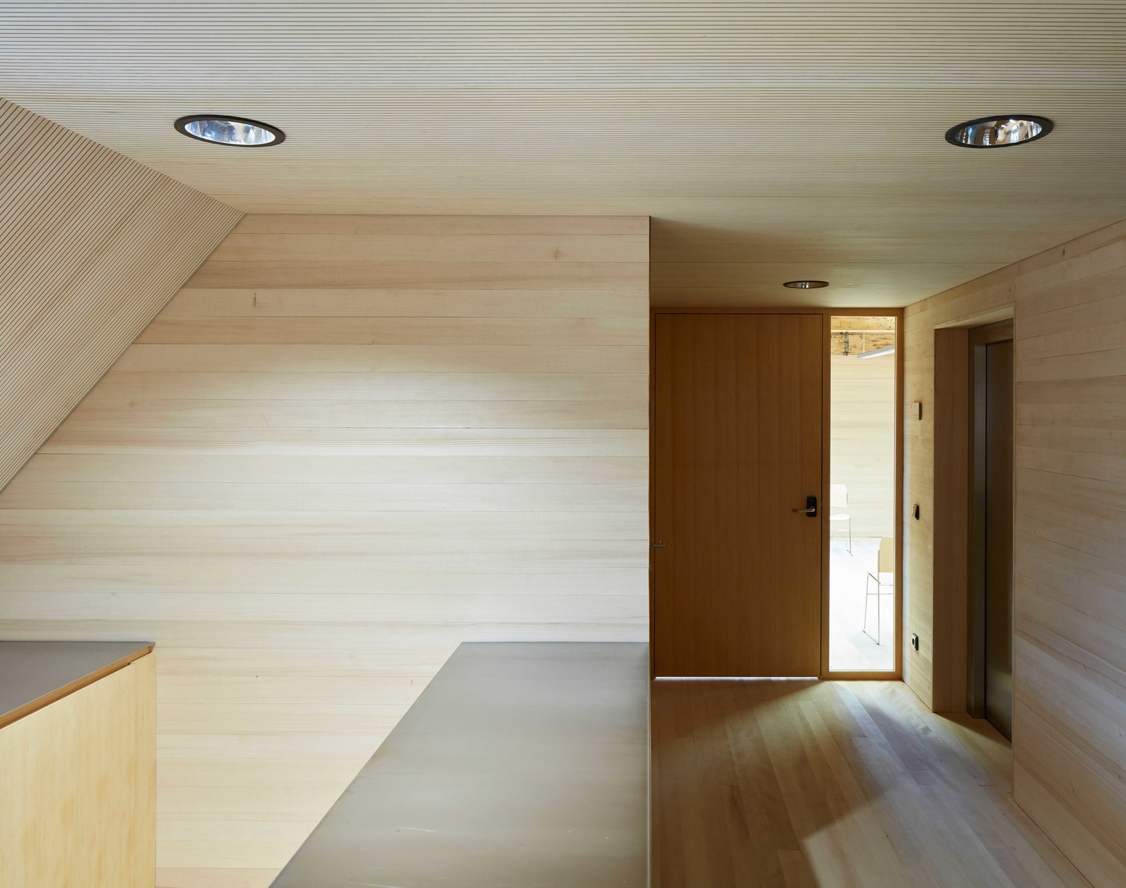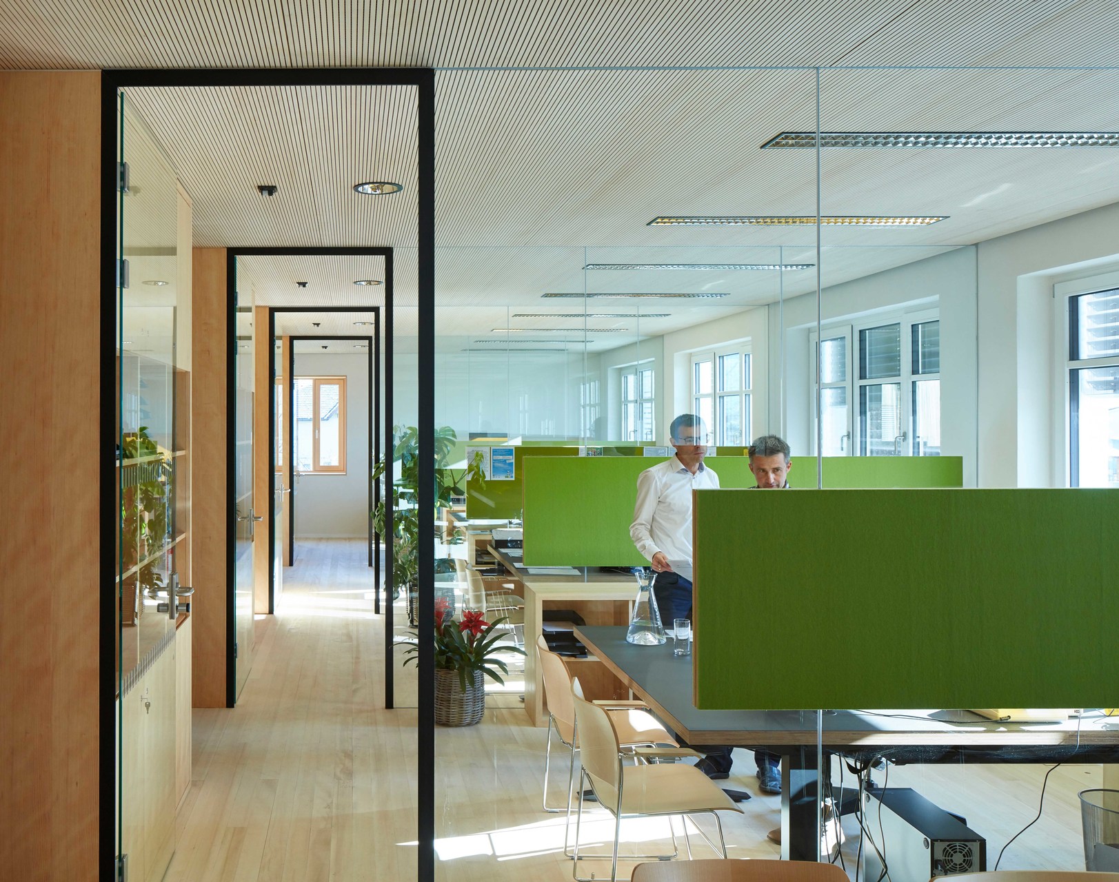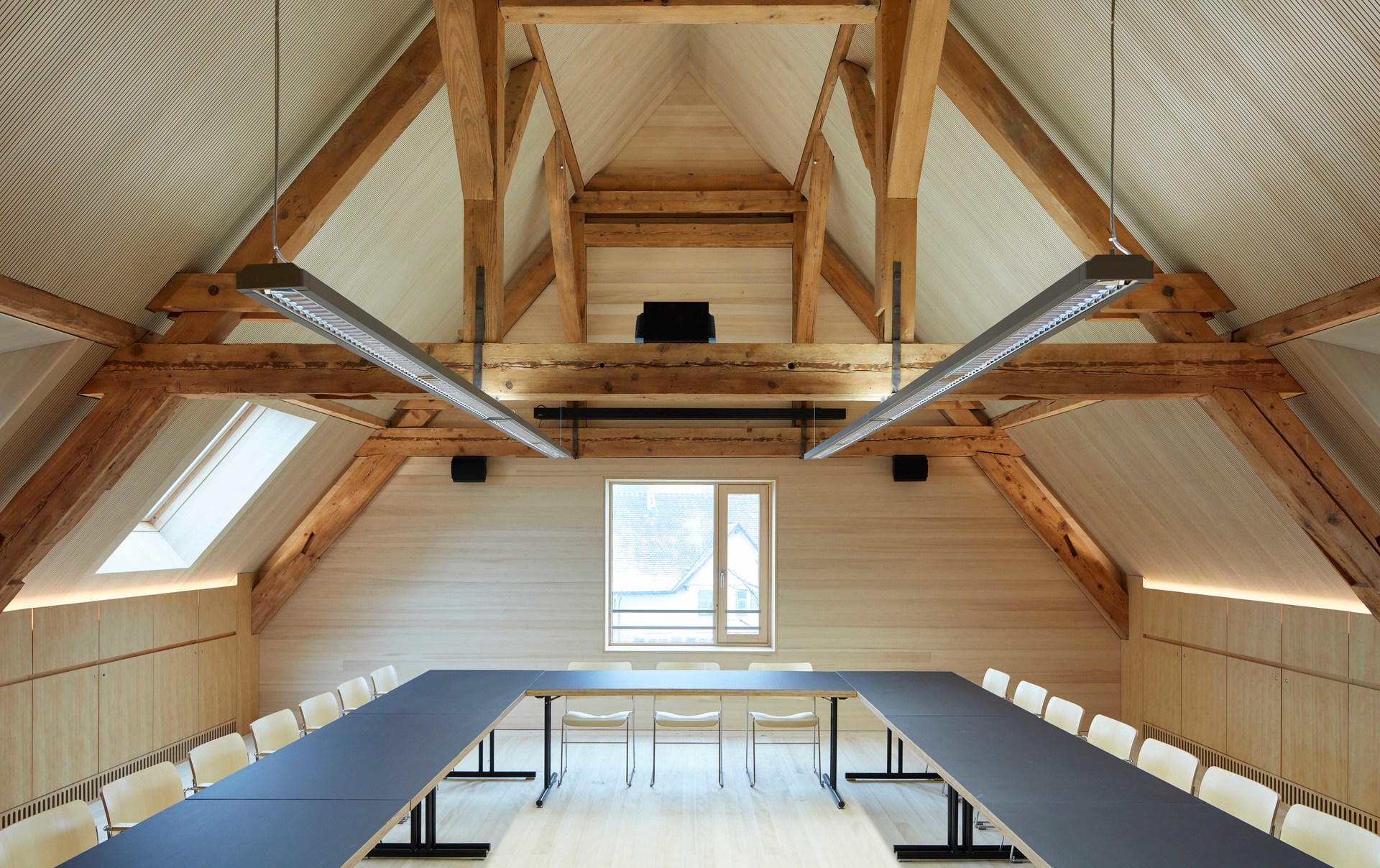 Ein wesentlicher Eingriff war die Absenkung des Erdgeschoßes vom Hochparterre auf Straßenniveau. So wurde ein großzügiges, barrierefreies Bürgerzentrum geschaffen, das sich transparent und einladend präsentiert. Im oberen Stock wichen die vormals zahlreichen Zwischenwände einer offenen, mit Glaswänden und Regalen flexibel zonierbaren Bürostruktur. Im Dachgeschoß, früher von Kindergarten und Männerchor genutzt, entstanden Sitzungssaal und Probelokal. Durch ein Foyer mit Bar eignet sich diese Ebene als Infrastruktur für Veranstaltungen verschiedenster Art, während Archiv, Lager und Technik im Keller unterkamen. Die Fassaden blieben beinah unverändert. Das macht das Sanierungskonzept der Außenwände möglich, die auf der Innenseite gedämmt und mit Lehm verputzt wurden.