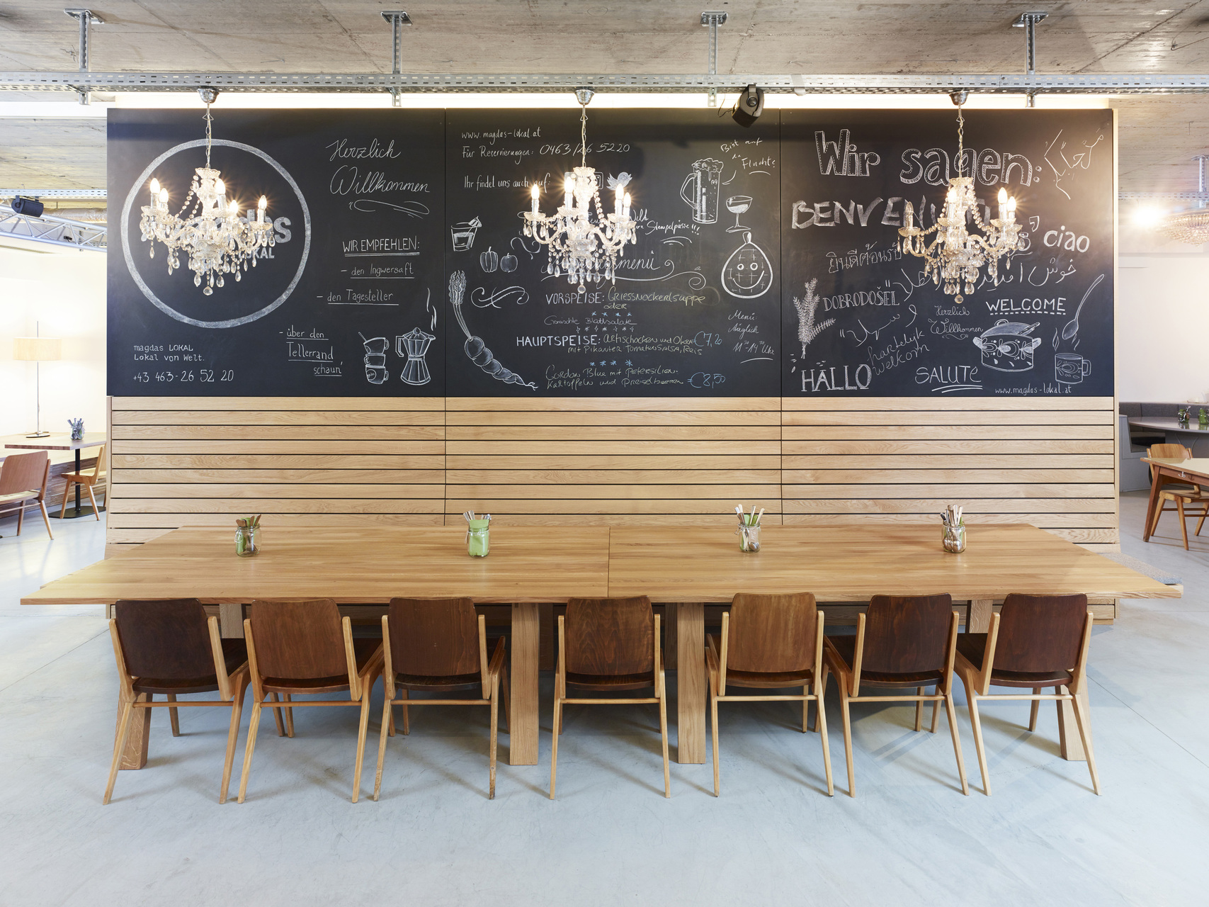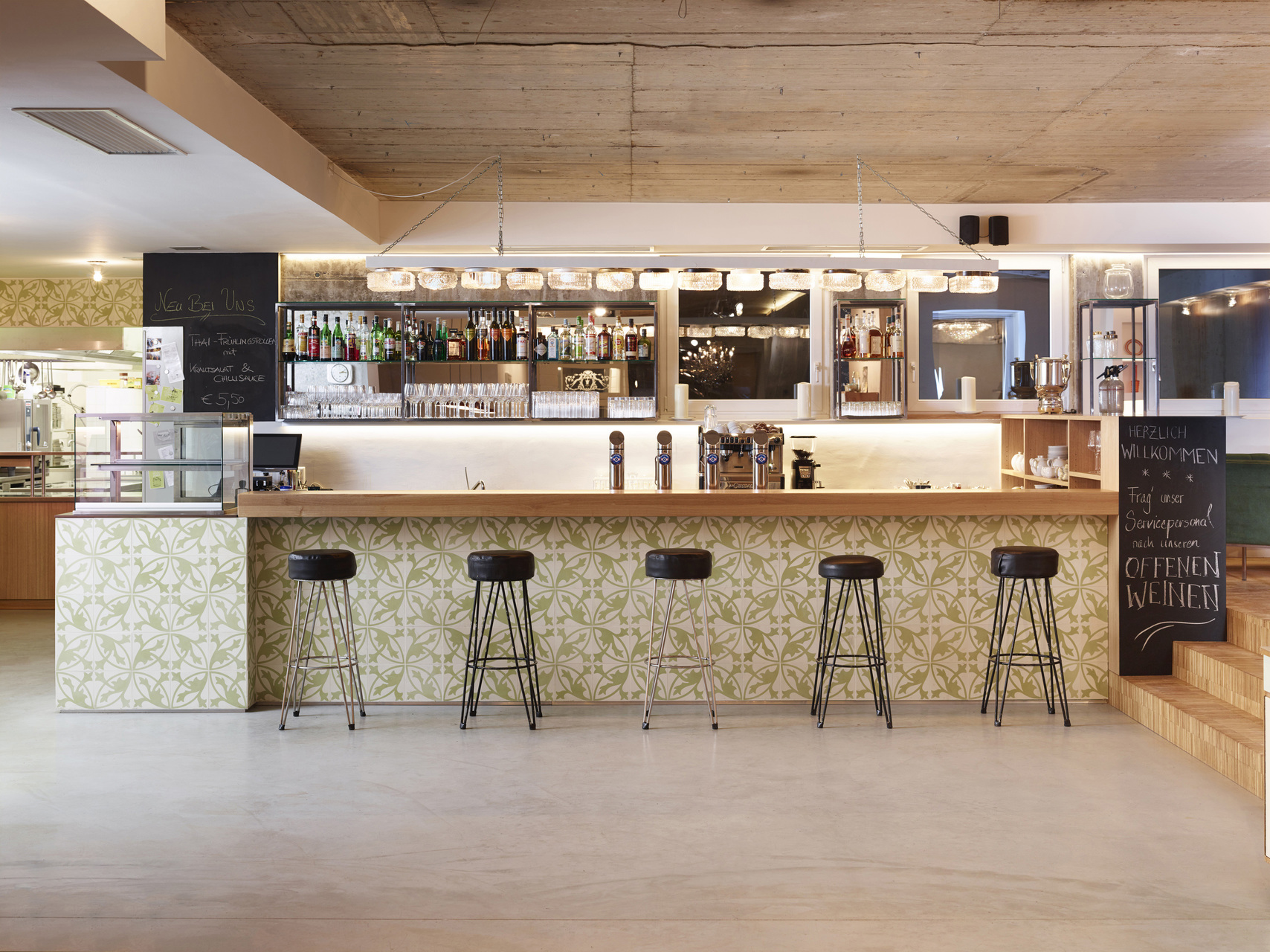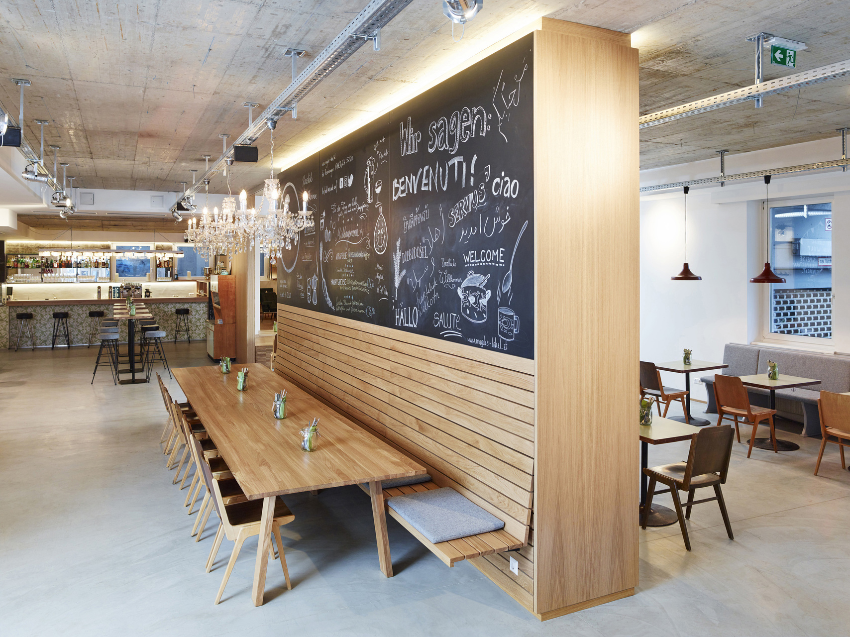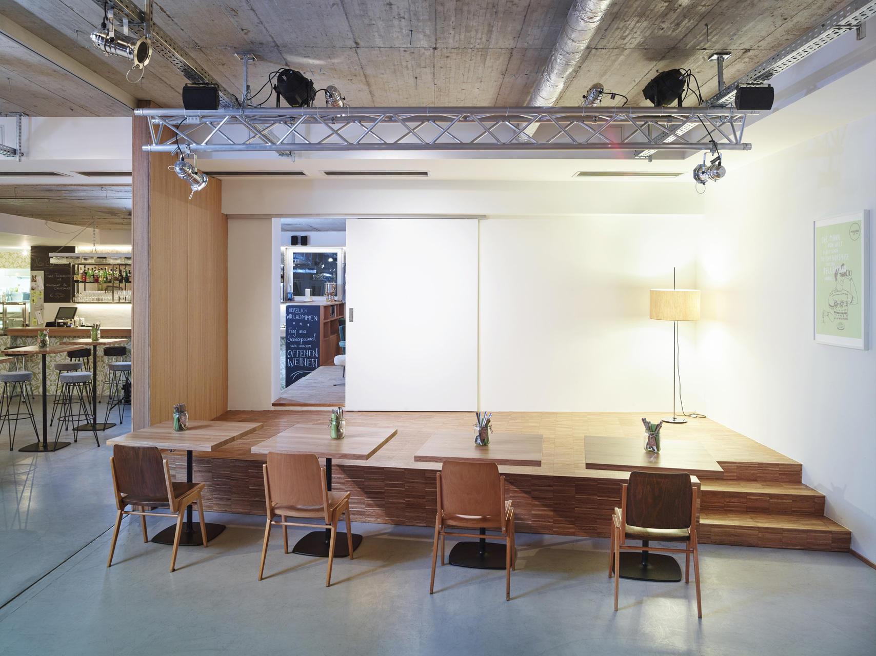 Den hallenartigen Charakter des Lokals versuchte der letzte Pächter durch griechische Säulen, Verzierungspaneele und jede Menge verbauter Sitzecken Herr zu werden. Da von Anfang an feststand, dass möglichst viel vom Bestand in upgecycelter Form verwendet werden sollte, galt es in einer Bestandsaufnahme das Verwertbare herauszuschälen und die Räume von überflüssigem Ziergut zu befreien. Puristisch und unter Verwendung einiger weniger Materialien und Farben wurde das Lokal in verschiedene Bereiche zoniert. Der weitläufige Raum wurde durch eine zentrale Holzwand geteilt, die als Rückenteil für eine lange Sitzbank einerseits und als Bücherregal andererseits dient. Zwei große Eichentische sind vor dem Raumteiler positioniert und bieten großen Gruppen Platz bieten, ermöglichen es aber auch, dass hier einzelne Gäste ins Gespräch kommen. Auf der großen Tafelfläche darüber ist das tägliche Mittagsmenü und auch sonst so einiges angeschrieben. Die Rückseite wird zu einem überdimensionalen Wohnzimmerregal voller Bücher. Hier lässt es sich schmökern und stöbern. Für Veranstaltungen kann aus der Holzwand eine raumhohe Schiebetür geschoben werden und der Gastraum in einen Zuschauerraum verwandelt werden. Das Bühnenpodest kann bei normalem Betrieb zum Sitzen verwendet werden. Über Eck wird er zu einem Loungebereich mit gemütlichen Sofas. Bestandseckbänke wurden neu tapeziert und gestrichen und bilden nun gemütliche Sitznischen. Weitere Sitzbereiche sind als Inseln in den Raum gestellt. Der Barbereich ist durch Zementfliesen und ungenutzte Stiegenhausbeleuchtungskörper charakterisiert.
