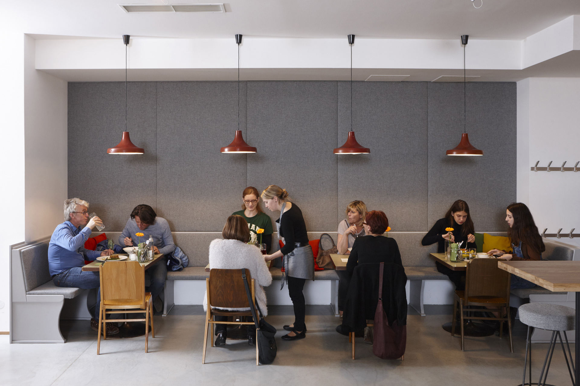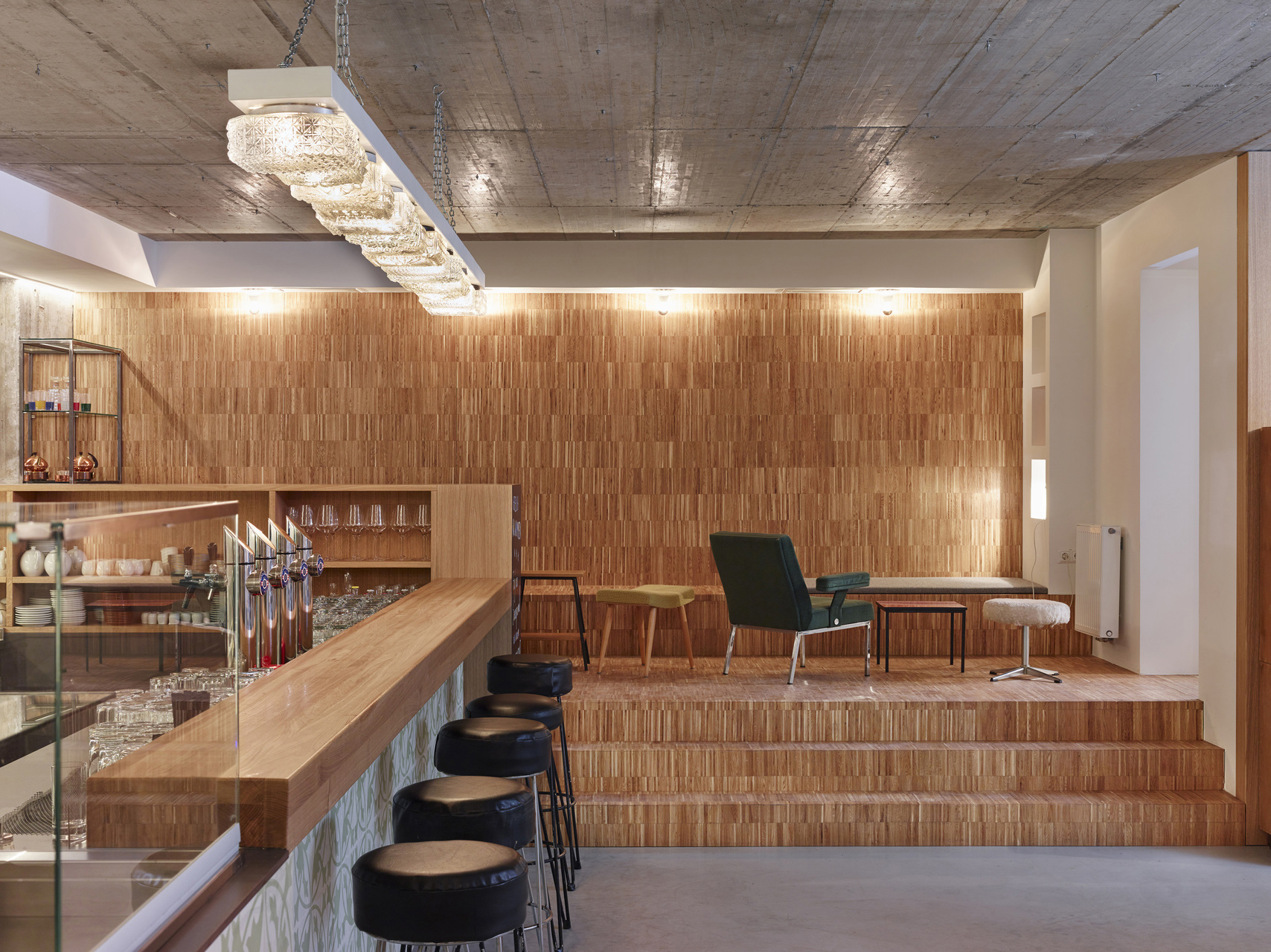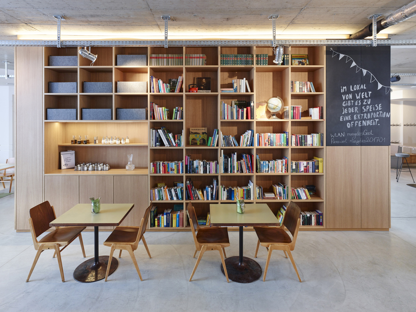 Den hallenartigen Charakter des Lokals versuchte der letzte Pächter durch griechische Säulen, Verzierungspaneele und jede Menge verbauter Sitzecken Herr zu werden. Da von Anfang an feststand, dass möglichst viel vom Bestand in upgecycelter Form verwendet werden sollte, galt es in einer Bestandsaufnahme das Verwertbare herauszuschälen und die Räume von überflüssigem Ziergut zu befreien. Puristisch und unter Verwendung einiger weniger Materialien und Farben wurde das Lokal in verschiedene Bereiche zoniert. Der weitläufige Raum wurde durch eine zentrale Holzwand geteilt, die als Rückenteil für eine lange Sitzbank einerseits und als Bücherregal andererseits dient. Zwei große Eichentische sind vor dem Raumteiler positioniert und bieten großen Gruppen Platz bieten, ermöglichen es aber auch, dass hier einzelne Gäste ins Gespräch kommen. Auf der großen Tafelfläche darüber ist das tägliche Mittagsmenü und auch sonst so einiges angeschrieben. Die Rückseite wird zu einem überdimensionalen Wohnzimmerregal voller Bücher. Hier lässt es sich schmökern und stöbern. Für Veranstaltungen kann aus der Holzwand eine raumhohe Schiebetür geschoben werden und der Gastraum in einen Zuschauerraum verwandelt werden. Das Bühnenpodest kann bei normalem Betrieb zum Sitzen verwendet werden. Über Eck wird er zu einem Loungebereich mit gemütlichen Sofas. Bestandseckbänke wurden neu tapeziert und gestrichen und bilden nun gemütliche Sitznischen. Weitere Sitzbereiche sind als Inseln in den Raum gestellt. Der Barbereich ist durch Zementfliesen und ungenutzte Stiegenhausbeleuchtungskörper charakterisiert.
