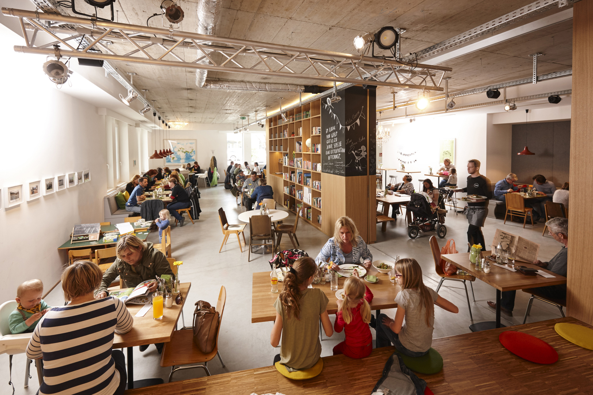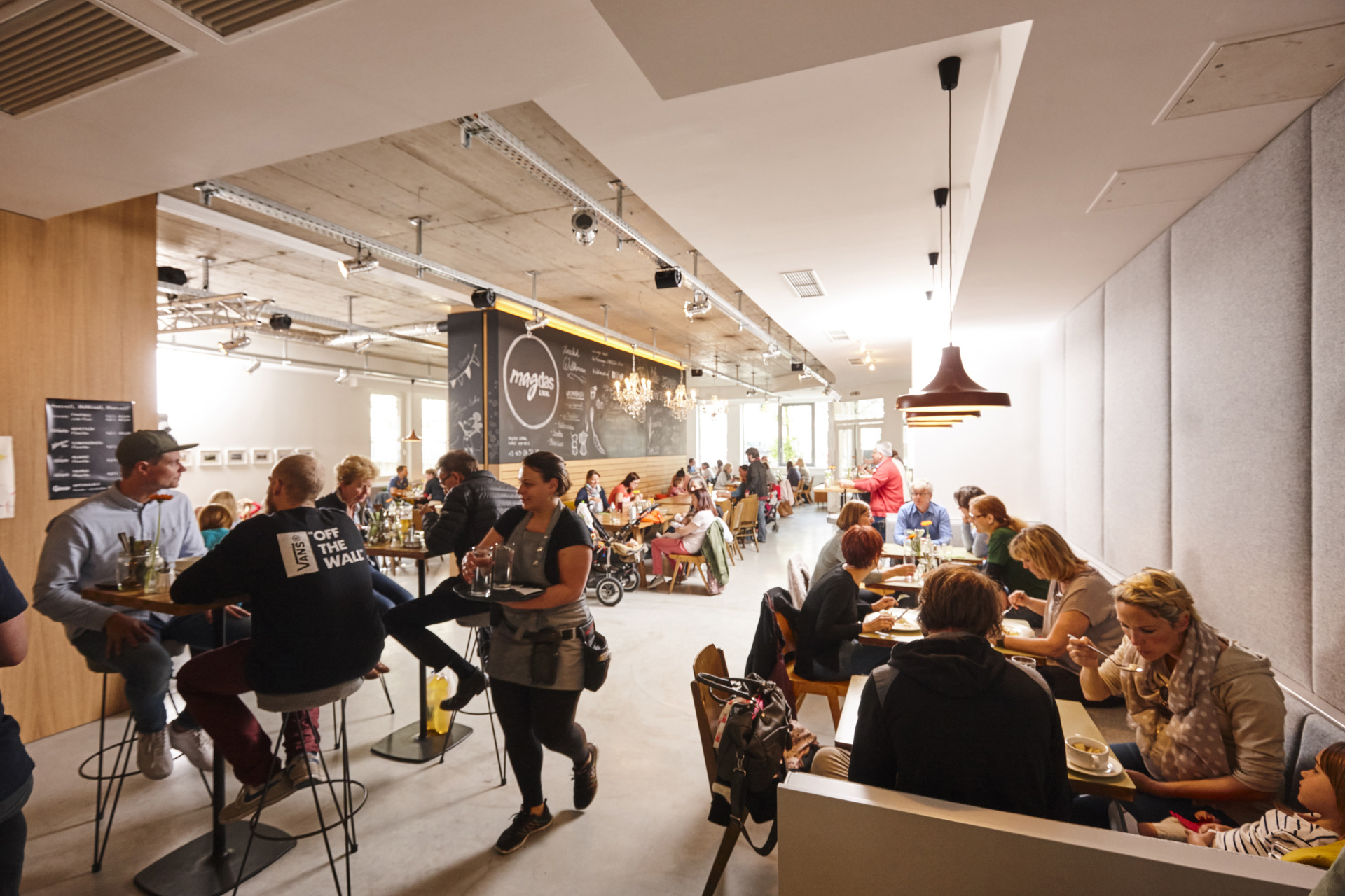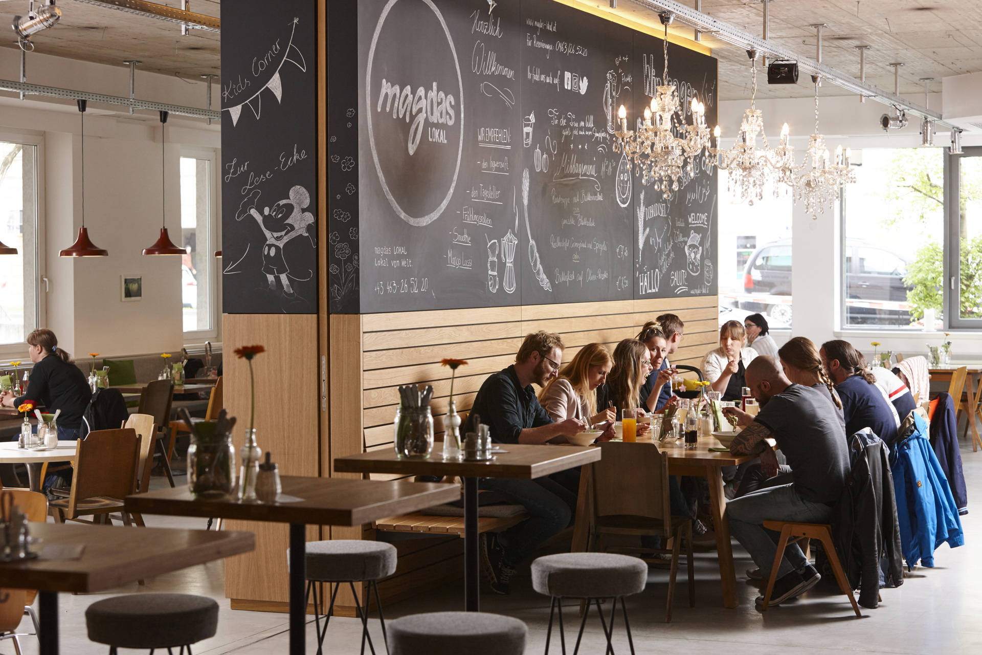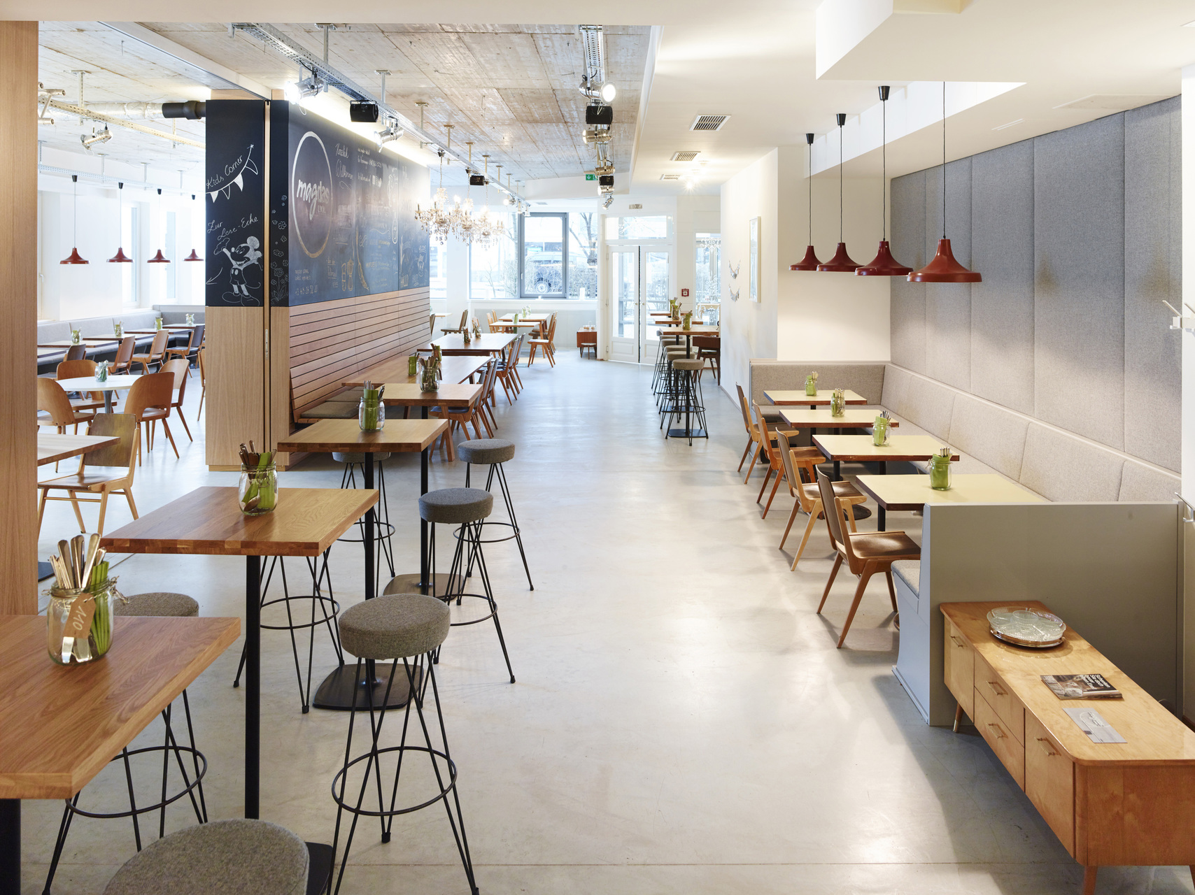 Den hallenartigen Charakter des Lokals versuchte der letzte Pächter durch griechische Säulen, Verzierungspaneele und jede Menge verbauter Sitzecken Herr zu werden. Da von Anfang an feststand, dass möglichst viel vom Bestand in upgecycelter Form verwendet werden sollte, galt es in einer Bestandsaufnahme das Verwertbare herauszuschälen und die Räume von überflüssigem Ziergut zu befreien. Puristisch und unter Verwendung einiger weniger Materialien und Farben wurde das Lokal in verschiedene Bereiche zoniert. Der weitläufige Raum wurde durch eine zentrale Holzwand geteilt, die als Rückenteil für eine lange Sitzbank einerseits und als Bücherregal andererseits dient. Zwei große Eichentische sind vor dem Raumteiler positioniert und bieten großen Gruppen Platz bieten, ermöglichen es aber auch, dass hier einzelne Gäste ins Gespräch kommen. Auf der großen Tafelfläche darüber ist das tägliche Mittagsmenü und auch sonst so einiges angeschrieben. Die Rückseite wird zu einem überdimensionalen Wohnzimmerregal voller Bücher. Hier lässt es sich schmökern und stöbern. Für Veranstaltungen kann aus der Holzwand eine raumhohe Schiebetür geschoben werden und der Gastraum in einen Zuschauerraum verwandelt werden. Das Bühnenpodest kann bei normalem Betrieb zum Sitzen verwendet werden. Über Eck wird er zu einem Loungebereich mit gemütlichen Sofas. Bestandseckbänke wurden neu tapeziert und gestrichen und bilden nun gemütliche Sitznischen. Weitere Sitzbereiche sind als Inseln in den Raum gestellt. Der Barbereich ist durch Zementfliesen und ungenutzte Stiegenhausbeleuchtungskörper charakterisiert.