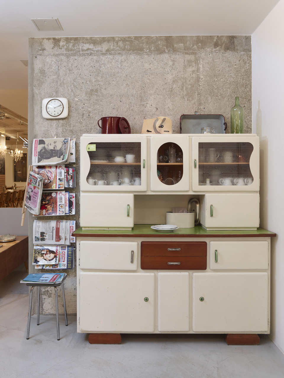 Das aus Caritas Beständen und vielen anderer Quellen zusammengetragene 60 er Jahre Mobiliar wurde in den Tageswerkstätten der Caritas liebevoll restauriert, luftig im Raum positioniert und durch zahlreiche Flohmarktfundstücke ergänzt.