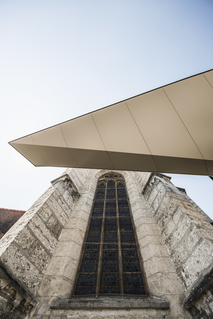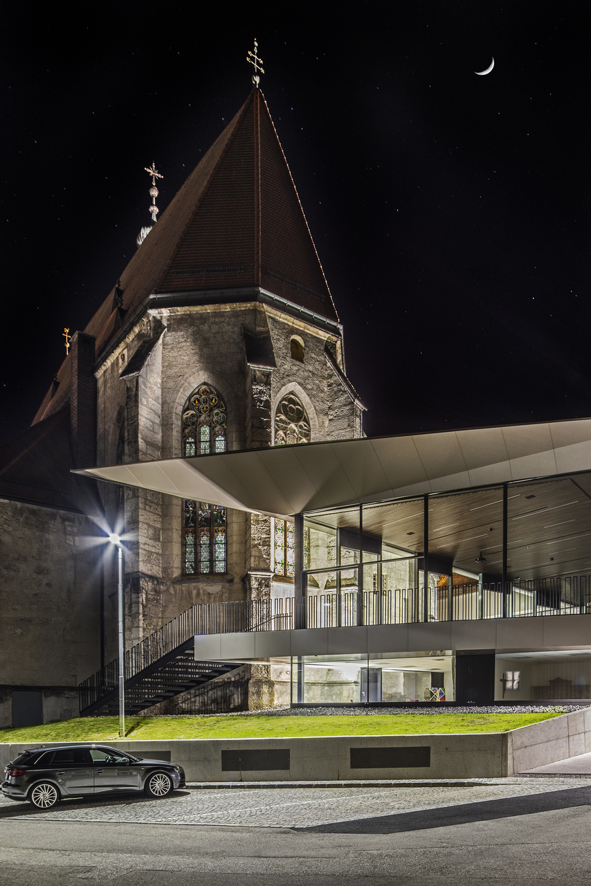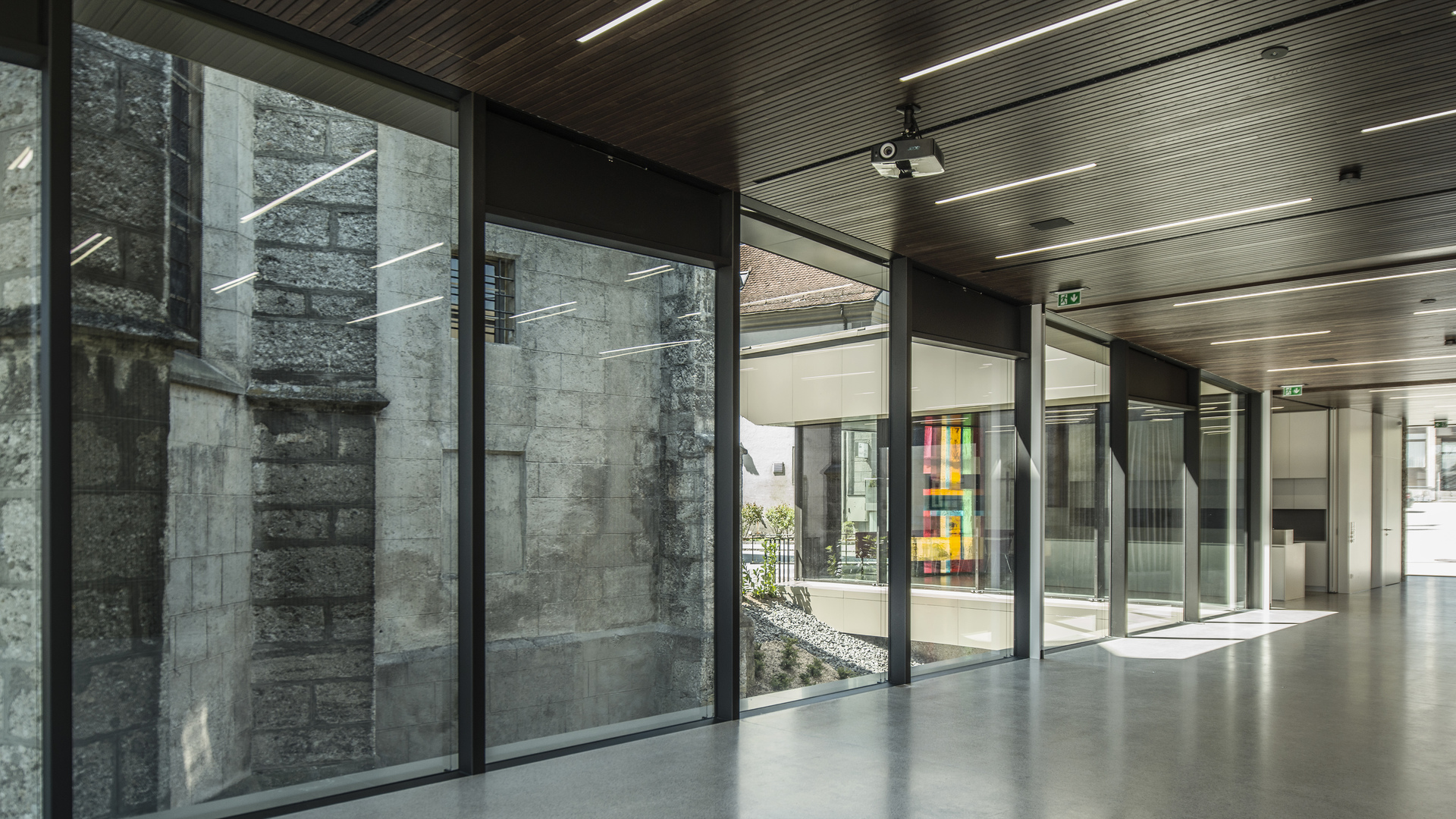 ie erweist sich aber insgesamt als wirksam, mit den beengten Verhältnissen am Bauplatz räumlich umzugehen. Äußerst nah rückt das großflächig verglaste Objekt an die Kirche aus Steyrtaler Konglomerat heran. Das in Teilen über tausend Jahre alte Baudenkmal wird zum integralen Teil des Raumerlebnisses im Pfarrsaal. Die Farbe der Metallfassade, der verwendete Stein, bewusst gesetzte Blickachsen und auch die künstlerische Glasarbeit an der Nordostfassade bringen Ort, Kirche und Pfarrheim in Dialog – ohne Anbiederung, selbstbewusst, aber mit Respekt.