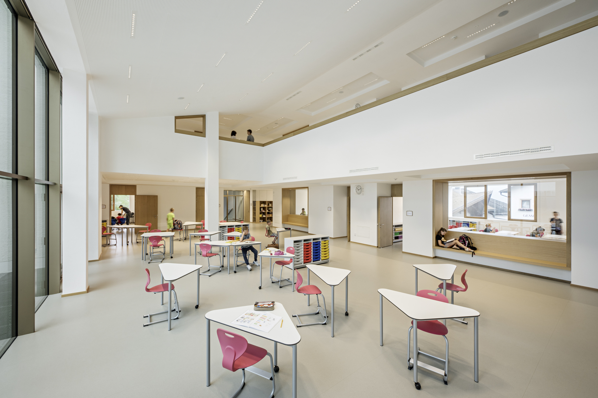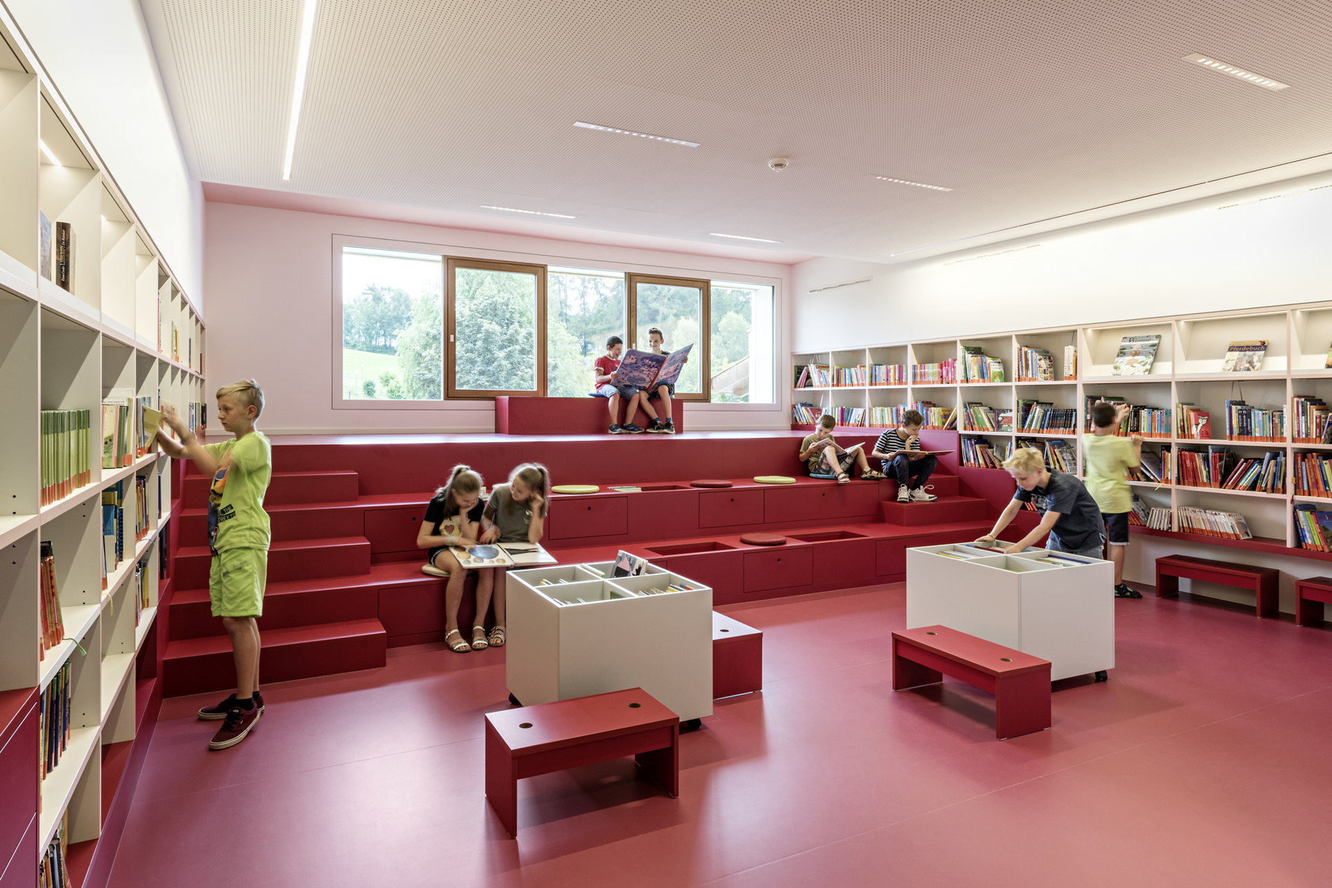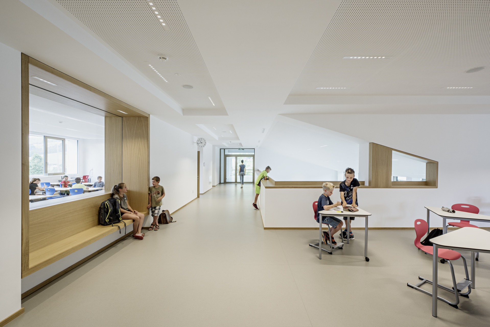 Das Untergeschoss der Grundschule öffnet sich durch die abfallende Topographie zum Spielplatz hin und enthält neben der Mensa auch eine öffentliche Bibliothek. In verschiedene kleinräumliche Situationen unterteilt, umfasst diese auf einem einfachen Konzept basierend neben den Medienbereichen auch Lesenischen. Die beiden darüber liegenden Stockwerke sind durch einen großzügigen Luftraum mit der Aula verbunden. Die ehemalige Erschließung wird zu einer Lernlandschaft aktiviert, um welche sich Klassenzimmer, Ausweichräume, Zentralgarderobe, Lehrerzimmer und Nassräume gruppieren. Großzügige Verglasung nach außen sowie zwischen Aula und Klassenräumen sorgen für spannende Sichtbeziehungen und Durchblicke auf das umgebende Gebirge. Jedem Klassenzimmer ist eine Fensternische zugeordnet, die ausreichend Stauraum bietet und in der Aula als Sitzbank dient. Die neuen Öffnungen verwandeln die vorherige kleinteilige Raumstruktur in ein großes Ganzes. Somit entstehen unterschiedliche Orte des Lernens auch außerhalb des Klassenzimmers.