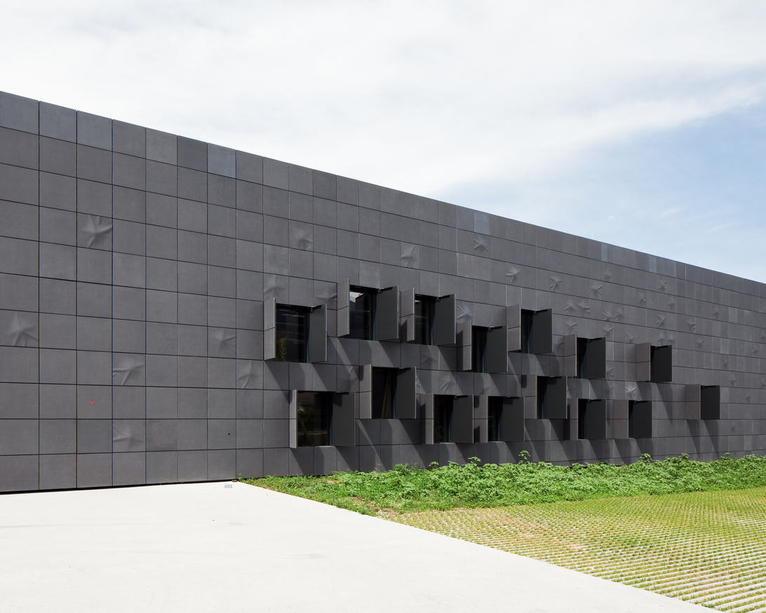 Die Gebäudehülle verfügt nur über wenige reduzierte Perforierungen: Das Tor für die LKW-Schleuse, Lüftungsschlitze, die Fenster zur Tischlerei oder der Haupteingang durchbrechen die panzerartige Haut. Während der Arbeitstage ist das Tor geöffnet, dessen Innenseiten rot im schwarzen, solitären Baukörper leuchten.