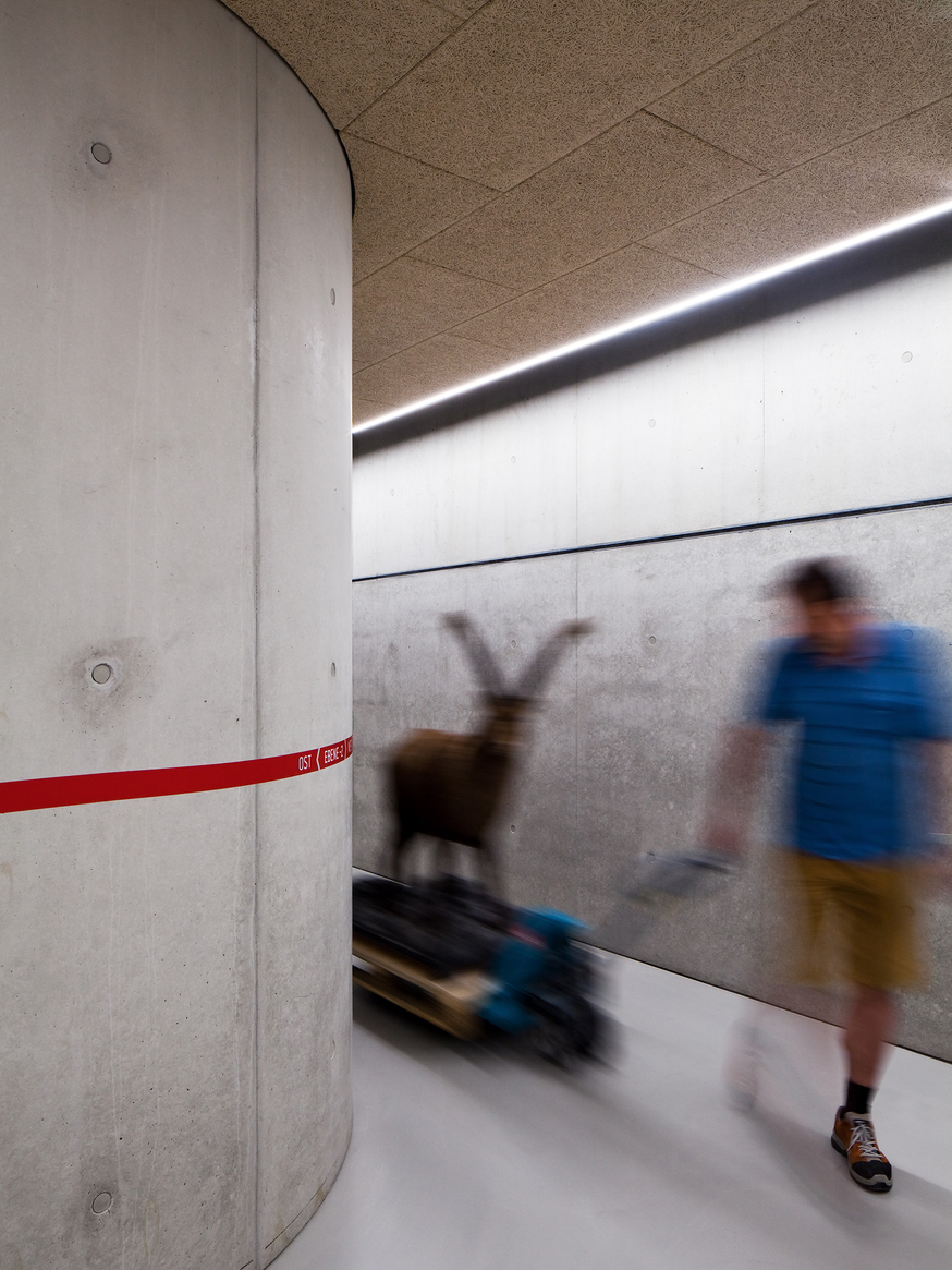 Eine der zentralen Aufgaben der Planer:innen war es, für das etwa 7.800m² große Depot ein konstantes Raumklima herzustellen und den Anteil konventioneller Technik möglichst gering zu halten. Zwei der drei Geschosse sind in der Erde versenkt und nützen die gleichbleibende Umgebungstemperatur. Ohne aufwendige Klimatechnik konnten für den klimatisch sensiblen Depotbereich somit optimale Temperatur- und Luftfeuchtigkeitsverhältnisse geschaffen werden. Darüber hinaus verfügt das Gebäude über eine Photovoltaikanlage mit einem Ertrag im Ausmaß des Stromverbrauchs von 25 Haushalten. In der gesamten Projektabwicklung wurde ein besonderes Augenmerk auf Ressourcenschonung und den Einsatz bauökologischer Materialien gelegt.