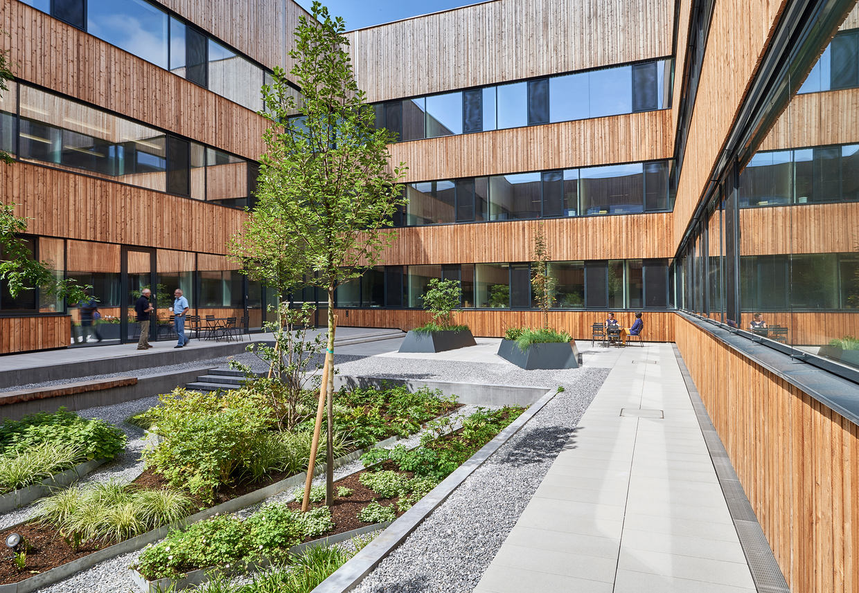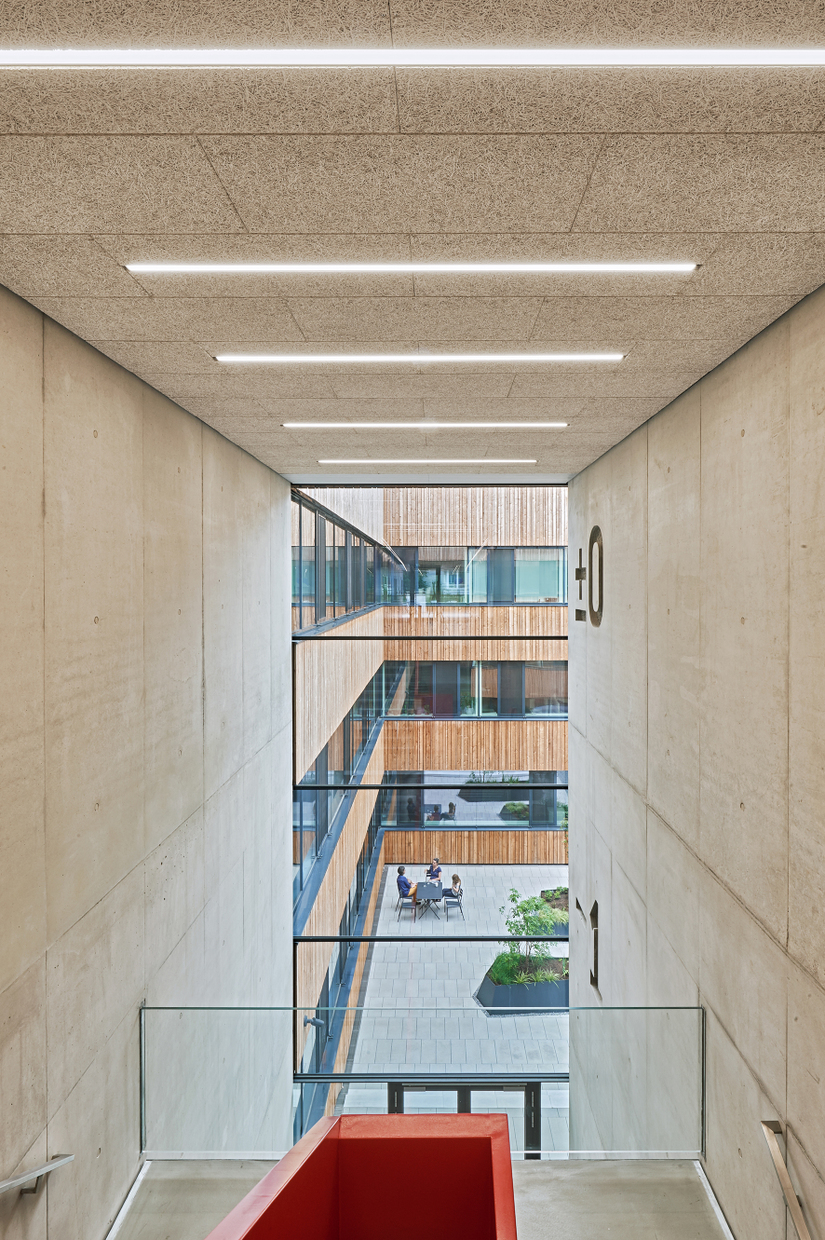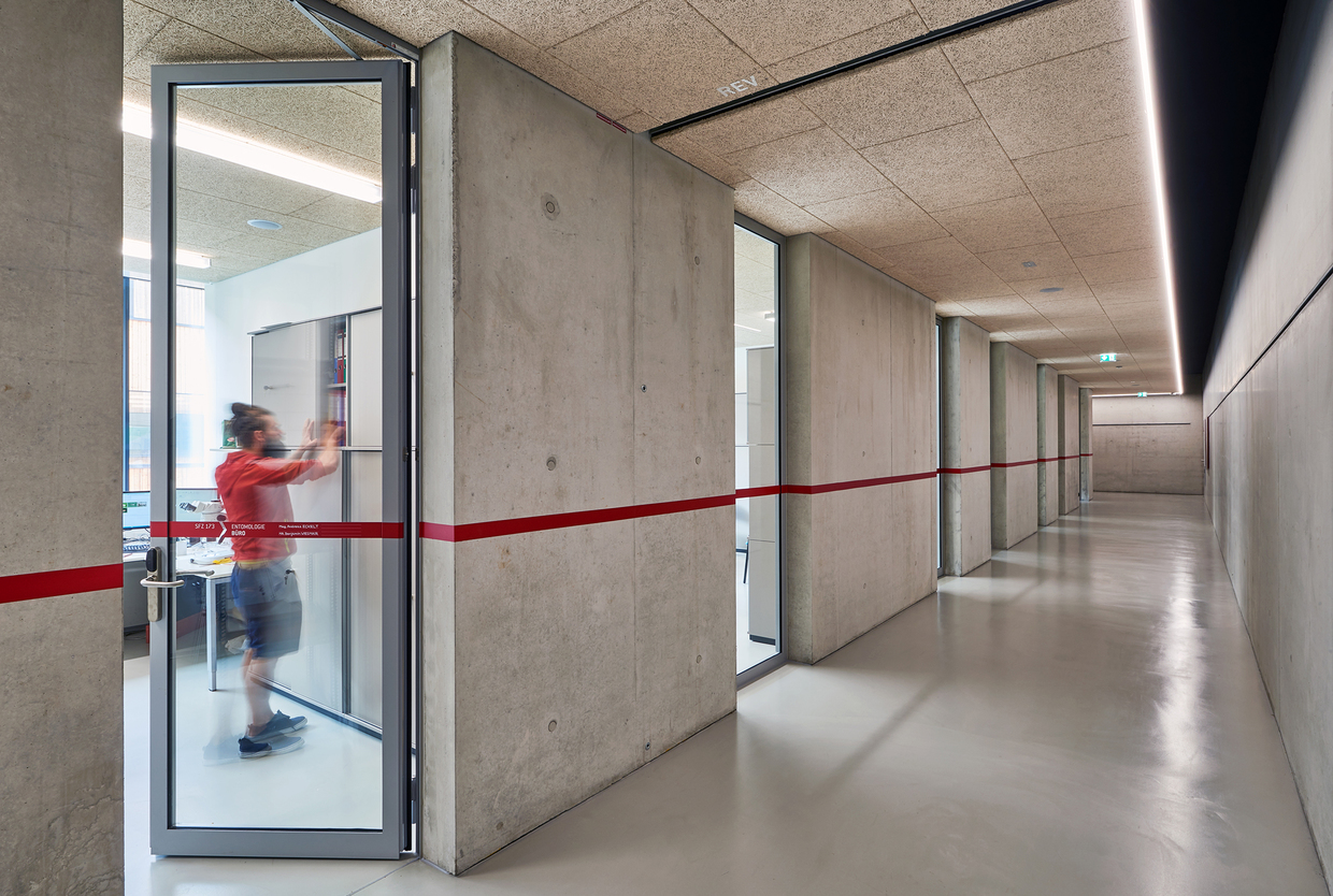 Die vielfältigen Anforderungen an das räumliche Konzept setzten die Architekten mittels eines einfachen Prinzips um: Vergleichbar mit den Schichten einer Zwiebel wurden Räume mit ähnlichen Funktionen von außen nach innen angeordnet. Im äußersten Ring befinden sich die Depotflächen, danach folgt ein Gang- bzw. Erschließungsring und im Kern gruppieren sich Arbeits- und Atelierräume für die ca. 40 Mitarbeiter:innen des SFZ, die sich rund um ein introvertiertes begrüntes Atrium legen. Der Entwurf von Franz&Sue überzeugte, weil durch die „klare Konzeption sowie die aufgezeigte Einfachheit“ dargelegt wurde, „wie selbstverständlich die Entwurfsaufgabe lösbar sein kann“ – so die Jury. Durch seine unbehandelte Holzfassade sowie großzügige Fensterbänder bildet das Atrium außerdem einen Gegenpol zur harten Hülle der geschlossenen Außenhaut und bietet damit ein hochwertiges Arbeitsumfeld.