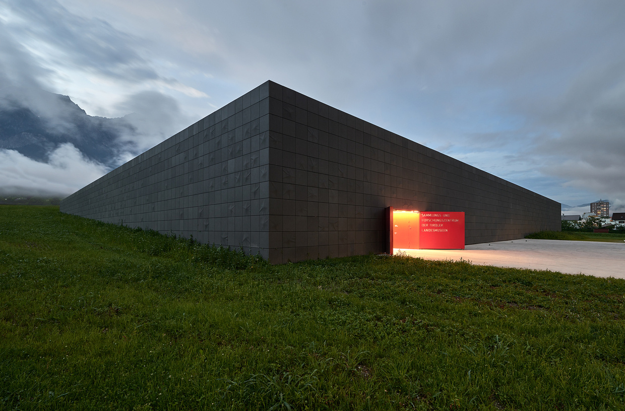 Das Gebäude gleicht einer Schatzkiste, die sich in annähernd quadratischer Form wie ein flacher Monolith in die Landschaft am Ortsrand von Hall fügt. In die Hanglage eingeschnitten, ragt nur ein Drittel des Gebäudes aus dem Erdreich hervor, sodass es an der Rückseite lediglich eine Höhe von zwei Metern erreicht. Die mit grauen, glasfaserverstärkten Betonplatten verkleidete Fassade gibt sich nach außen hin hermetisch. Unregelmäßig verteilte Ausbuchtungen wurden einem Faustkeil aus dem 7. – 8. Jahrtausend v. Chr. nachempfunden, dem ältesten von Menschen erzeugte Werkzeug in der Sammlung. Die Anordnung der Platten an der Fassade nimmt Bezug auf die Verteilung der Fundorte in Tirol. Durch die Verwendung des modernen Baumaterials (Fibre C) wird altes Handwerk mit zeitgenössischen technologischen Entwicklungen kombiniert. Das Exponat wird in der Fassade quasi konserviert.
