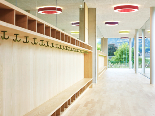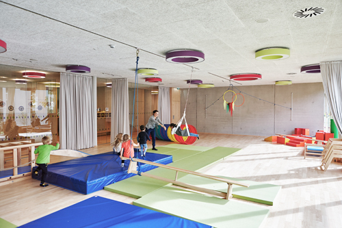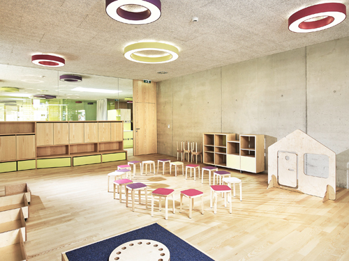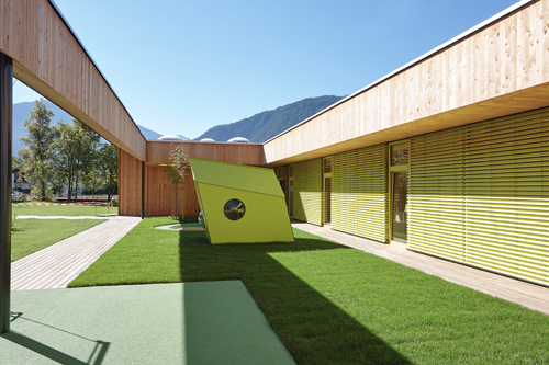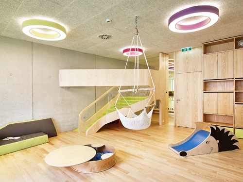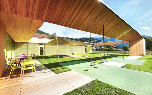 Die beiden, klar der jeweiligen Funktion zugeordneten Spielhöfe bieten Freibereiche, die gezielt altersabhängig bespielbar sind. Weit auskragende Dachbügel bilden zum einen die räumliche Fassung und Abgrenzung – auf eine Einzäunung konnte verzichtet werden –, und spenden zum anderen Schatten bzw. eignen sich zum Aufhängen der verschiedensten Spielgeräte.
