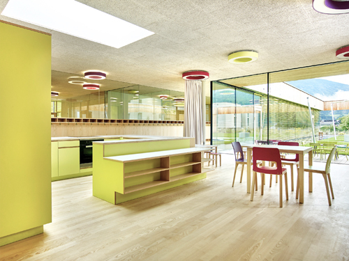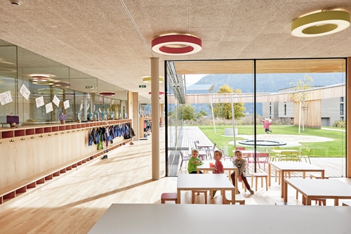 Auf dem dazwischen liegenden ehemaligen Appellplatz, der zuletzt als Parkplatz genutzt wurde, einen Neubau zu errichten, der zum einen die bestehenden Gebäude möglichst wenig beeinträchtigt und zum anderen den Kindern die nötige Intimität bietet, war keine leichte Aufgabe. Das Projekt der ARGE Tabernig-Zierl Architektur überzeugte die Wettbewerbsjury, indem es trotz schwieriger Ausgangssituation wertvollen architektonischen, räumlichen und funktionstechnischen Mehrwert generiert – und das bei hoher Wirtschaftlichkeit.