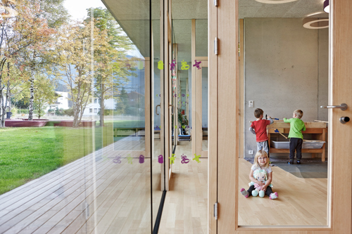 Die Architekten platzierten im westlichen Bereich des Bauplatzes einen längs orientierten, eingeschossigen Baukörper mit begrüntem Dach, in den – versetzt zueinander – zwei Höfe eingeschnitten sind. Über den mittig gelegenen Eingang kommt man in den gemeinsamen Foyer- und Essbereich und von hier aus wahlweise in den südlich gelegenen Kindergarten oder die im nördlichen Bereich untergebrachte Kinderkrippe. Sämtliche Gruppenräume sind nach Osten orientiert, die des Kindergartens erhalten zudem über den zugeordneten Spielhof zweiseitig Licht und Bezug zum Außenraum. Jeweils zwischen zwei Gruppenräumen liegende Teilungsräume und Nasszellen ergänzen das Raumangebot. Der Kinderkrippe vorgelagert befinden sich die Bewegungsräume, die über einen eigenen Zugang verfügen und damit außerhalb der Öffnungszeiten von Externen mitgenutzt werden können.