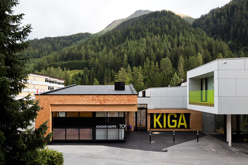 Um eine eigenständige Einheit für eine zweigruppige Kinderkrippe zu schaffen wurde der bestehende, von AllesWirdGut 2004 geplante Kindergarten in St. Anton am Arlberg um einen Zubau erweitert. Mit der Planung wurde Karl Gitterle betraut, der seit vielen Jahren eng mit AllesWirdGut zusammenarbeitet und schon am Bau des Kindergartens beteiligt war.Ostseitig an den Kindergarten angedockt wurde ein eingeschossiger Holzbaukörper errichtet, der sich formal am Bestand orientiert, in seiner Materialisierung aber klar davon absetzt. Ist das Erscheinungsbild des Kindergartens von seiner weißen Faserzementfassade geprägt, so erhielt der Zubau eine Hülle aus Lärchenschindeln.