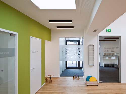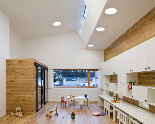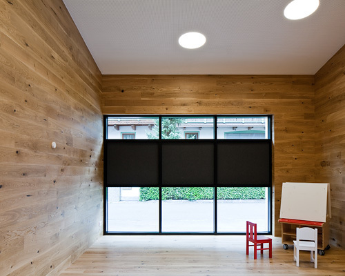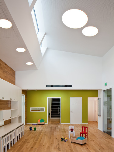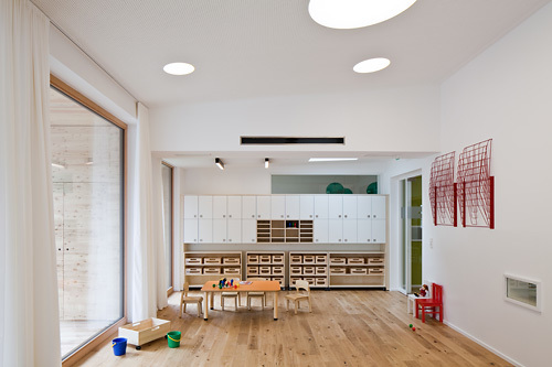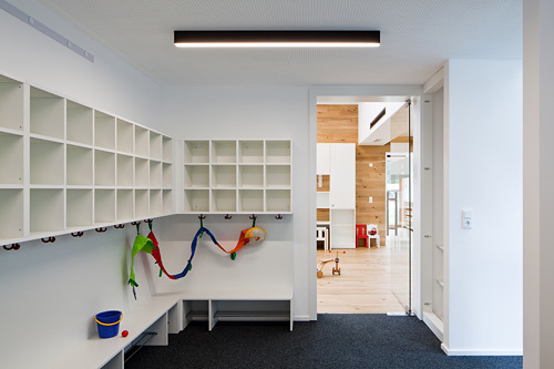 Über einen eigenen, nordseitig ausgerichteten Zugang werden die Räume der Kinderkrippe erschlossen, für die neben dem Zubau auch einer der Kindergartengruppenräume adaptiert wurde. Über die Garderobe erreicht man den zentral gelegenen Gemeinschaftsraum, von dem aus alle weiteren Flächen erschlossen sind. Große Fensterflächen bringen viel Licht in die Räume, die mit Holzböden und Wandverkleidungen aus Holz ausgestattet wurden. (Text: Claudia Wedekind)
