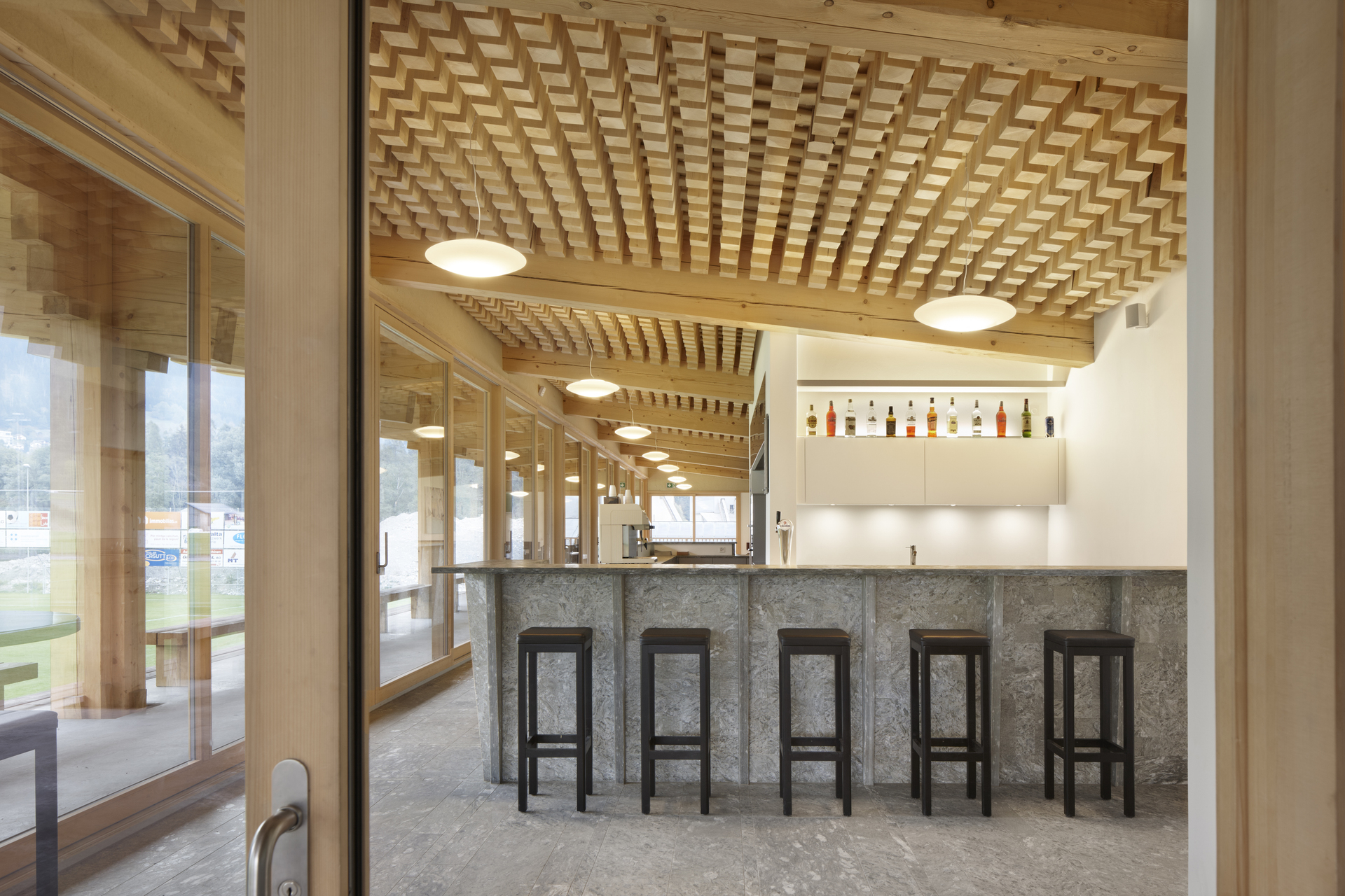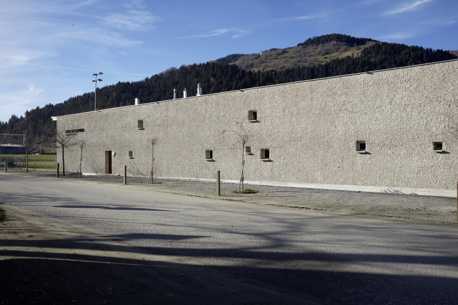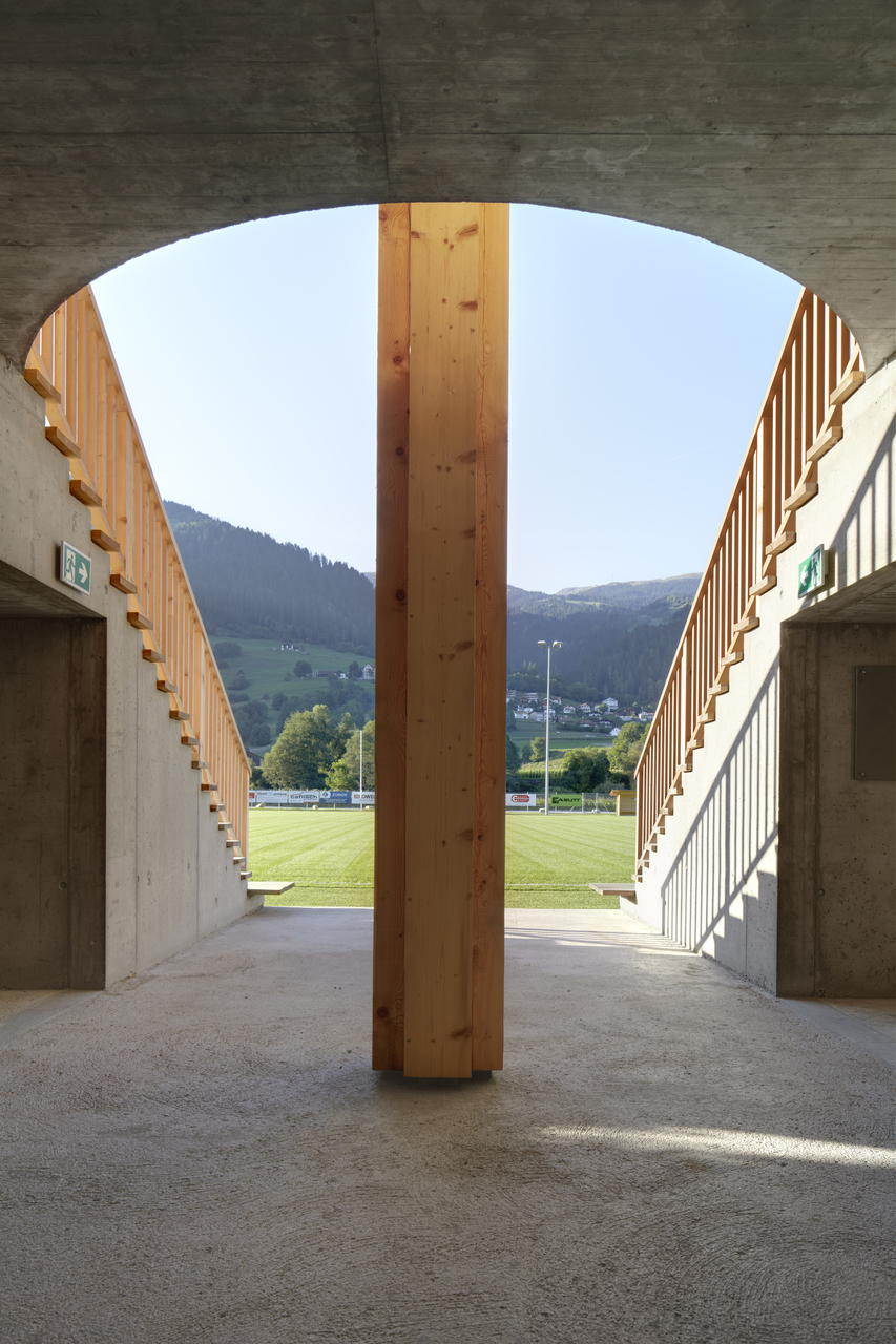 Das Gebäude ist in Massivbauweise aus Beton und Einsteinmauerwerk erstellt, die Dach- und Tribünenkonstruktion aus massivem Fichtenholz. Der Beton wie auch der Kies für den vor Ort angemachten Kalkputz konnten vom angrenzenden Kieswerk bezogen werden. Das Fichtenholz stammt aus Graubünden, der Stein für das Restaurant mit seiner Bar, die WC-Anlagen und Duschen aus Vals. (Text, leicht gekürzt: Architekten)