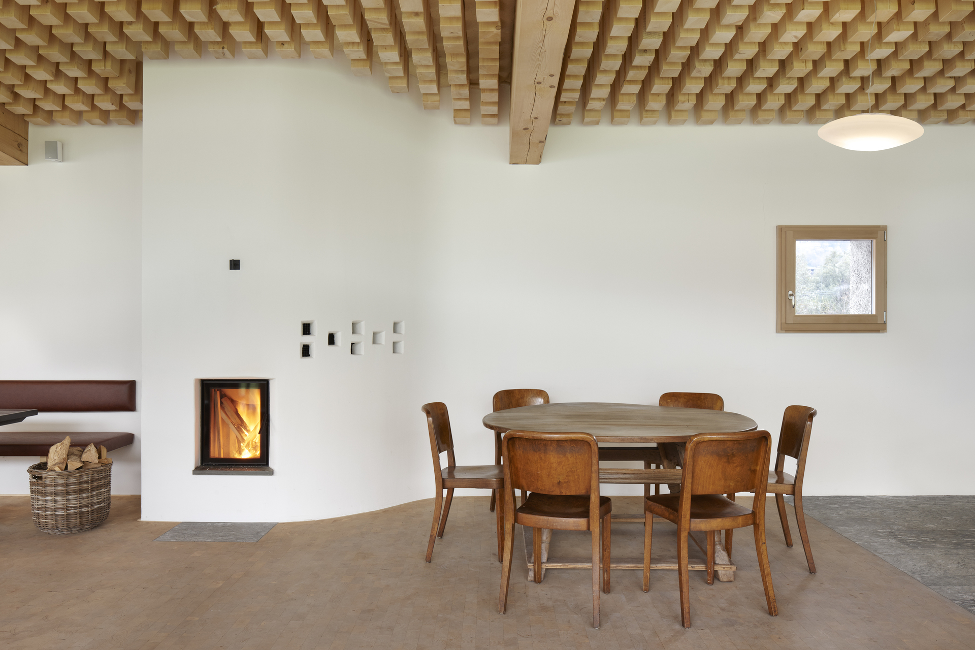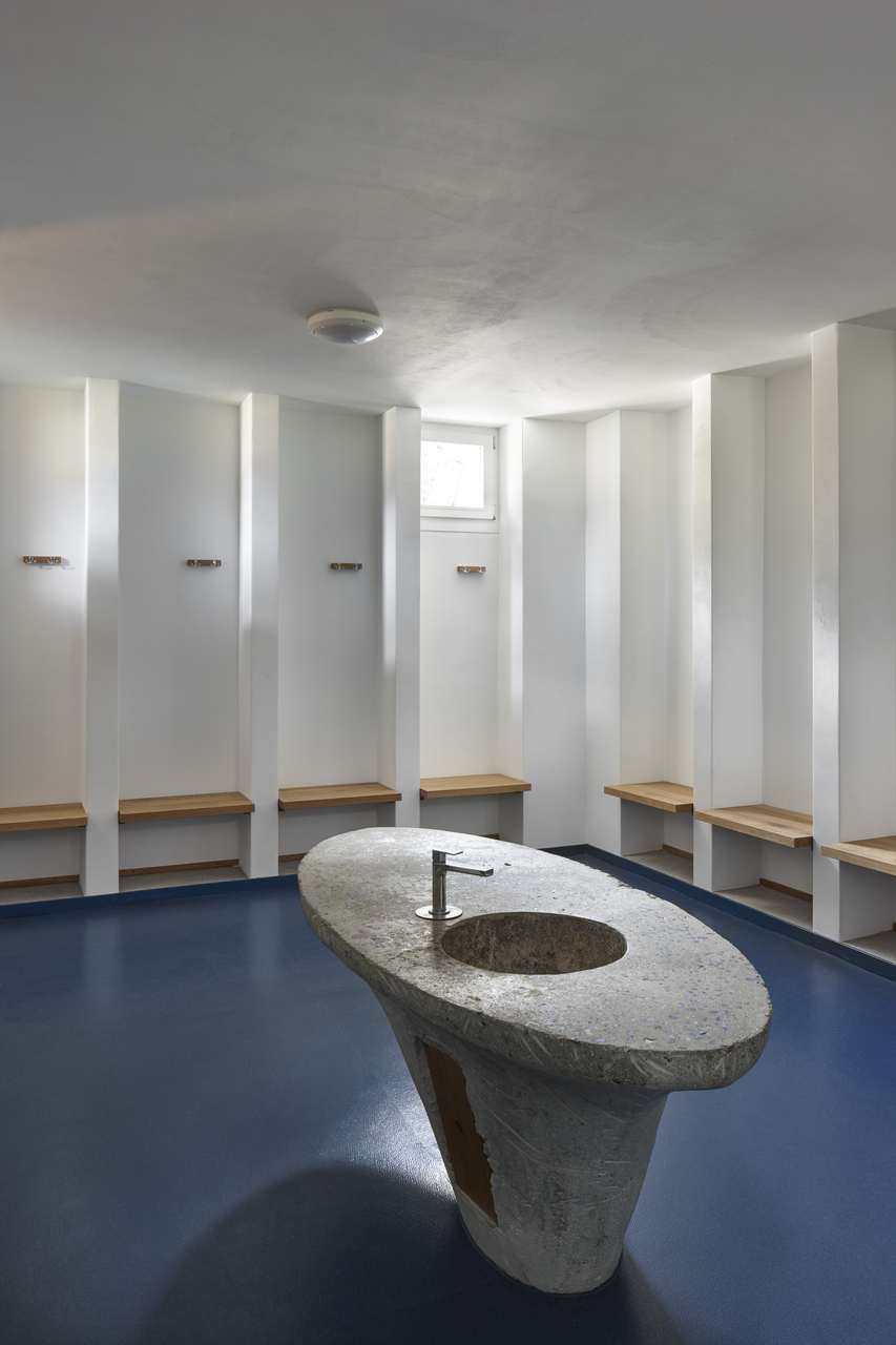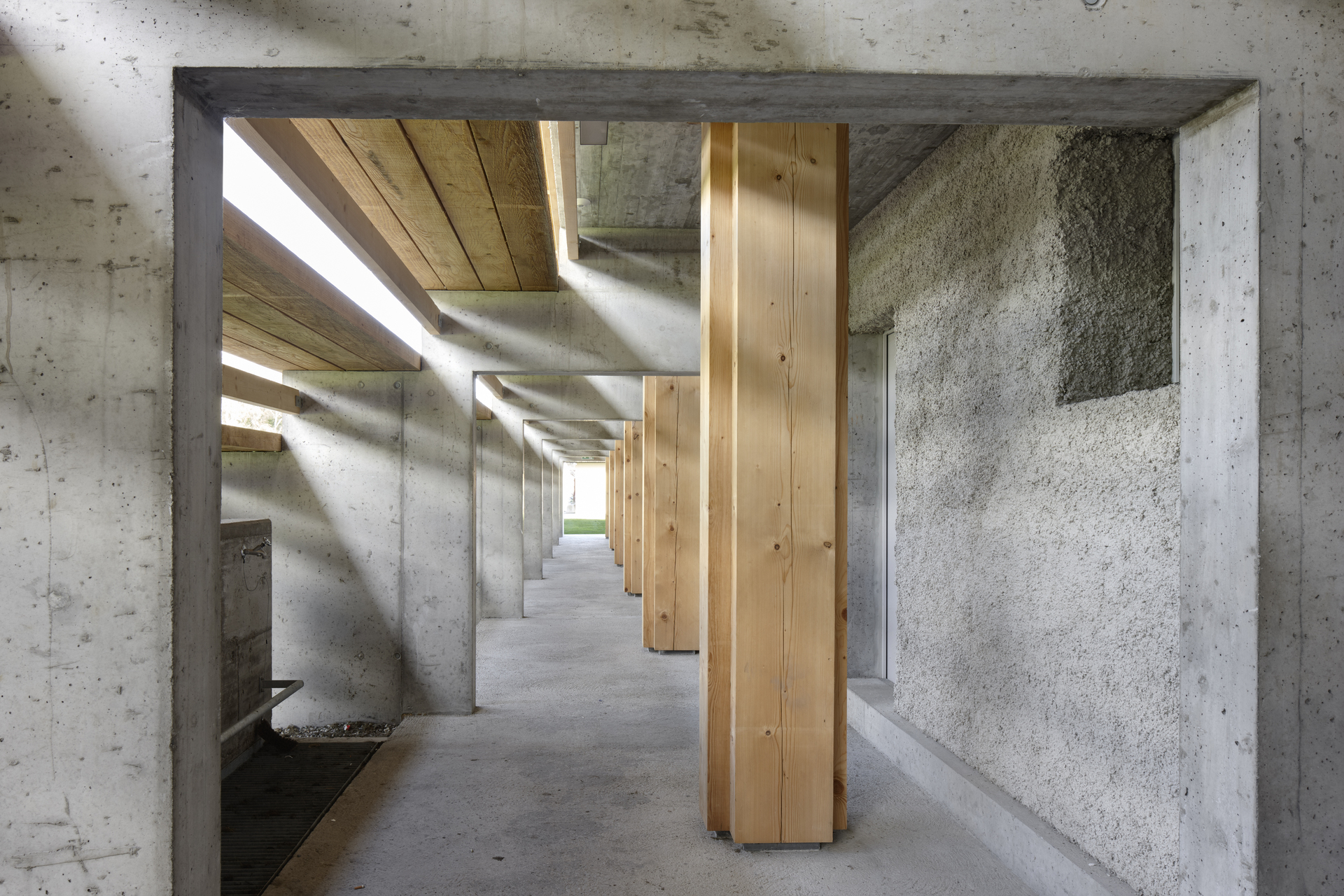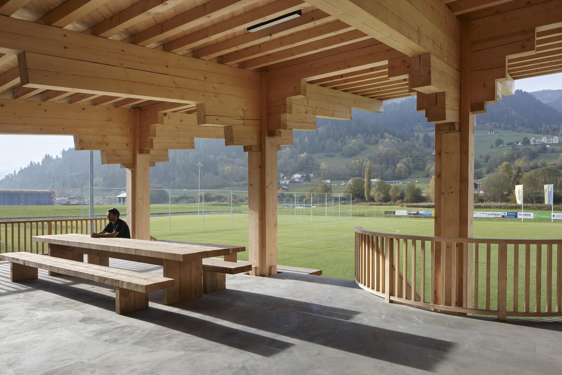 Das Gebäude ist in Massivbauweise aus Beton und Einsteinmauerwerk erstellt, die Dach- und Tribünenkonstruktion aus massivem Fichtenholz. Der Beton wie auch der Kies für den vor Ort angemachten Kalkputz konnten vom angrenzenden Kieswerk bezogen werden. Das Fichtenholz stammt aus Graubünden, der Stein für das Restaurant mit seiner Bar, die WC-Anlagen und Duschen aus Vals. (Text, leicht gekürzt: Architekten)