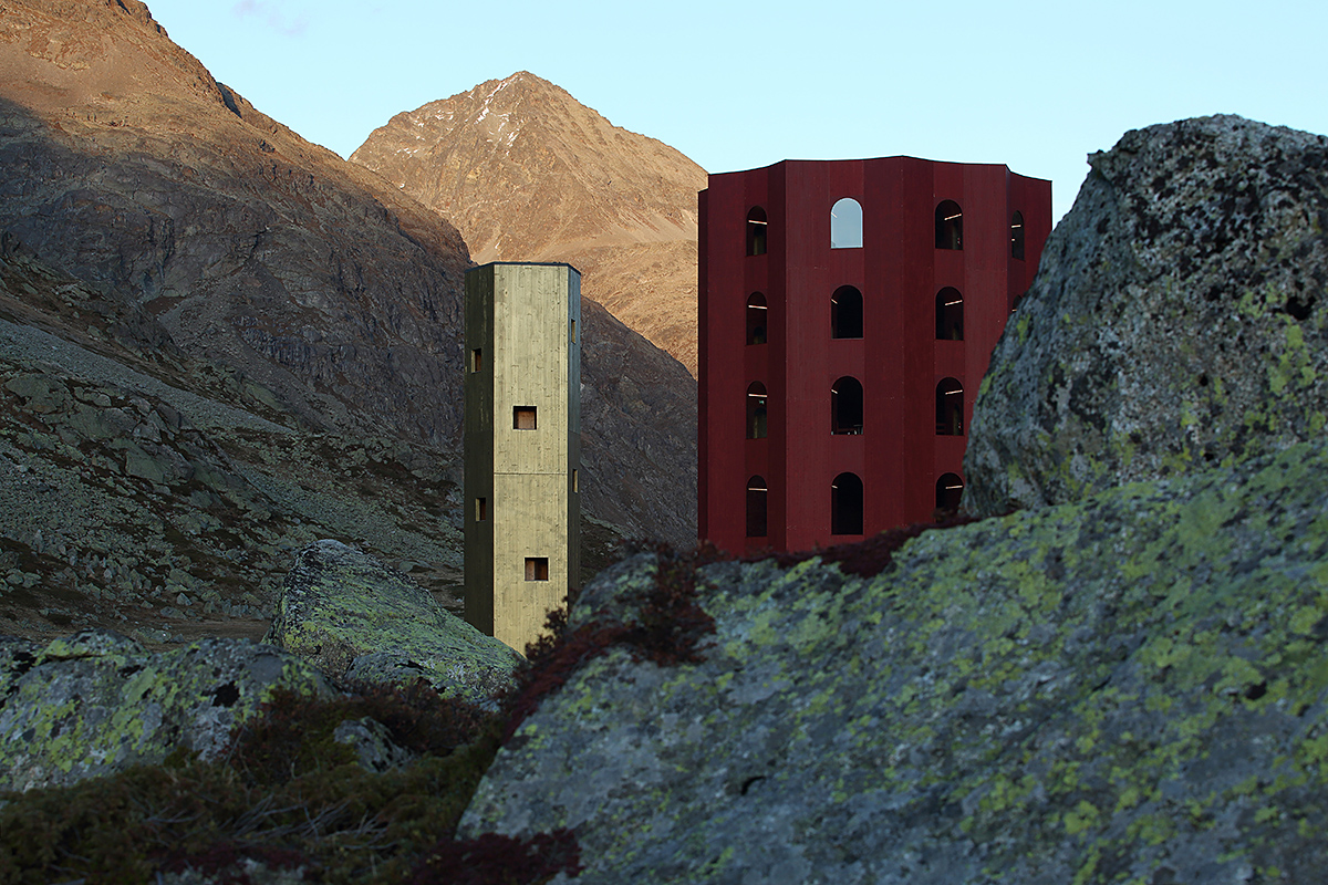 „Nichts ist ewig. Nicht auf der Bühne. Und schon gar nicht hier oben in den Bergen, wo der Winter brutal hart ist und der Wind mit bis zu 250 km/h über den Pass fegt“, sagt Netzer. „Der Turm wird so unvollendet bleiben wie jener in Babylon. Denn wenn man hier oben Theater macht, dann muss man auch akzeptieren, dass am Ende die Naturgewalten siegen werden.“ Schon bald, hofft der Theatermacher, wird die ochsenblutrote Lasur die erste Patina angelegt haben. Und tatsächlich ist die Konstruktion nicht für die Ewigkeit bestimmt: Der Graubündner Bauingenieur Walter Bieler baute nach den Plänen Netzers eine einschalige Konstruktion aus zwölf Zentimeter dickem Brettschichtholz, die mittels 28.000 Schrauben zusammengehalten wird. Die einzelnen Module wurden mittels Schwertransporter auf den Pass hochgefahren. Die den Himmel und das Gesteinsmassiv reflektierenden Glasscheiben wurden per Autokran an Ort und Stelle eingehängt. Der Rest ist ein Langzeitprovisorium.