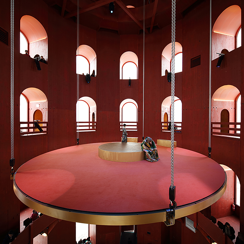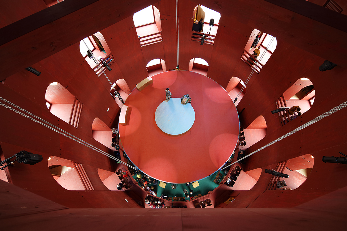 Mit einem Knarren öffnet sich die Tür. Der tiefrote Pinselstrich ist in der Holzoberfläche noch deutlich zu erkennen. Ein wenig braucht das Auge, um sich an die Enge des Innenraums zu gewöhnen. Nach wenigen Sekunden offenbart sich ein zehneckiges Panoptikum mit Nischen und Bogenfenstern hinaus in die Welt. In der Mitte ist ein großes, leeres Nichts, in dem eine kreisrunde Plattform von der Decke hängt. Während der Vorstellungen kann die mobile Bühne mittels Kettenzugs wie ein Lift auf und ab fahren. Die Ähnlichkeit zum elisabethanischen Globe Theatre in London ist nicht von der Hand zu weisen. Bis zu 220 Personen fasst der Saal.
