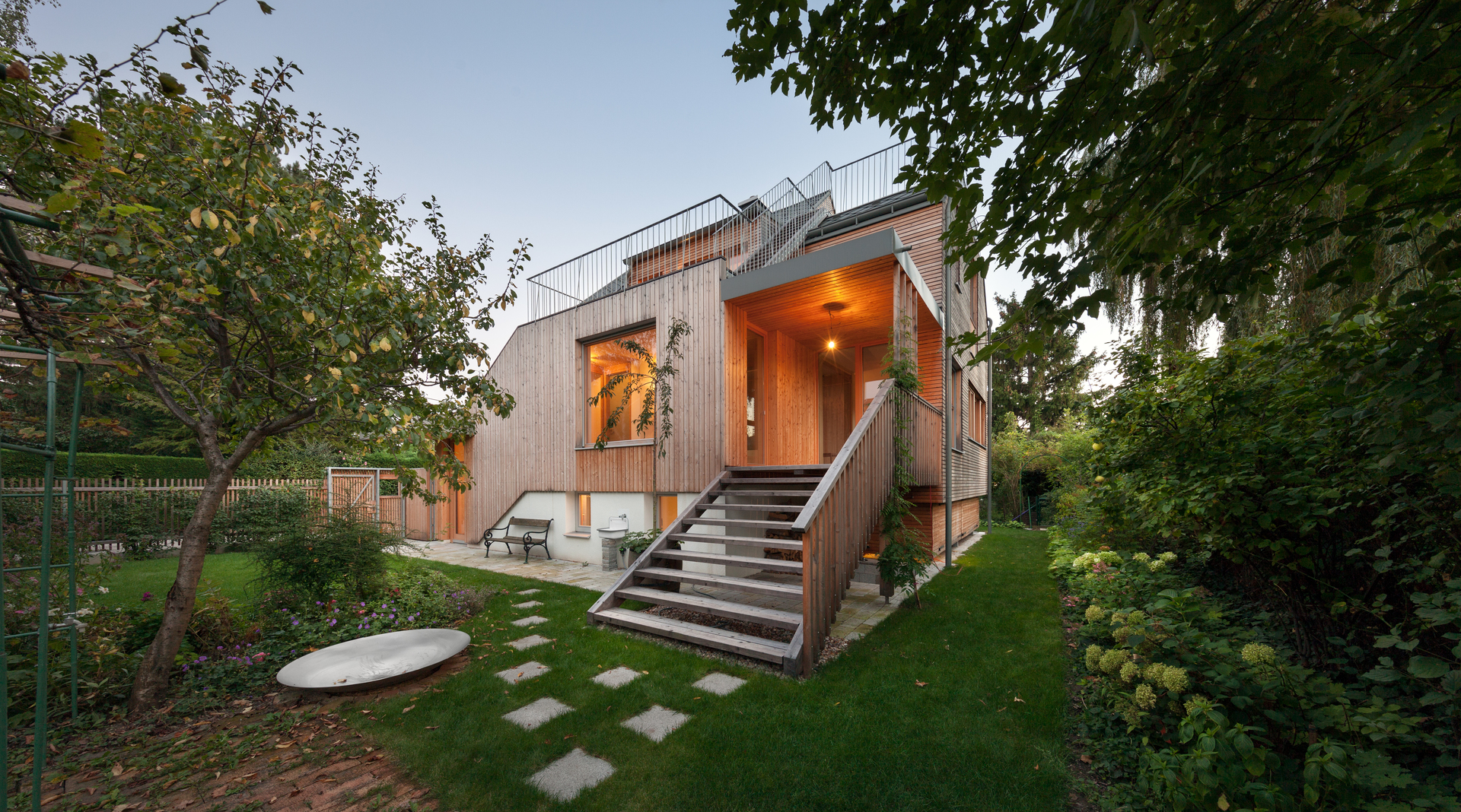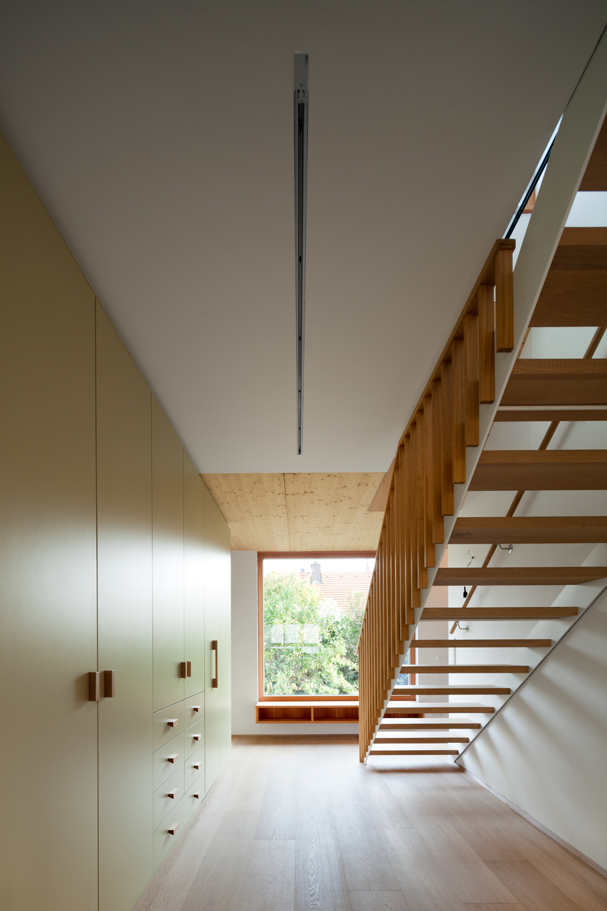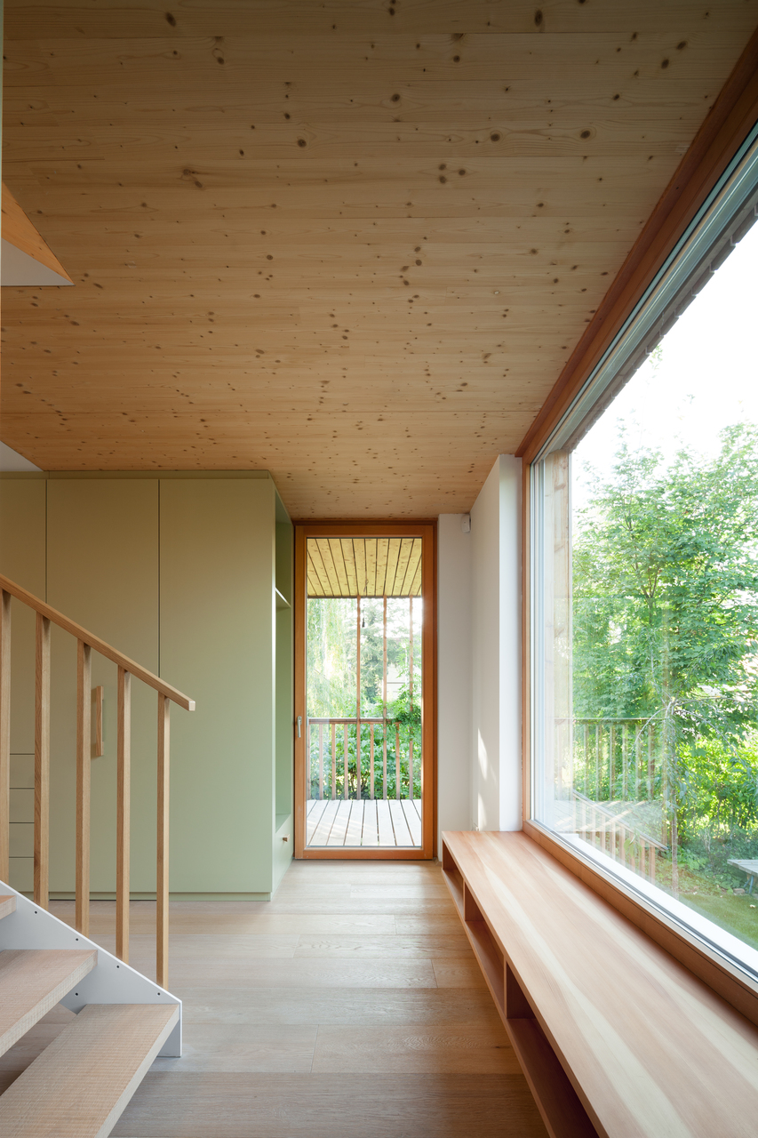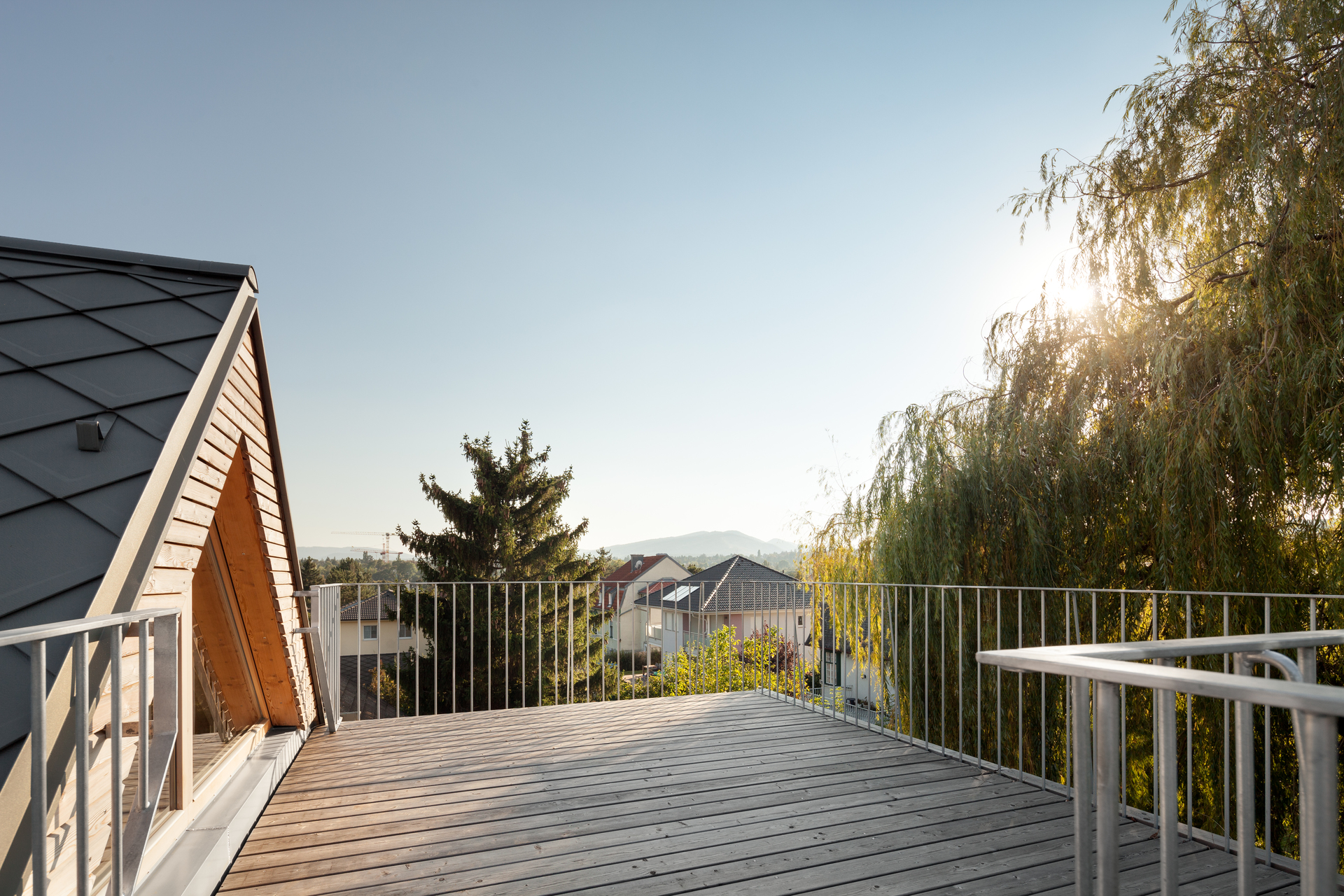 Unterhalb des westseitigen Zubaus befindet sich ein großer, von außen zugänglicher, geschützter Abstellbereich. Das Dach des westseitigen Zubaus ist teilweise als Flachdach ausgebildet. Dadurch konnte eine 2. sehr hoch liegende Terrasse mit Fernblick sowie beim Übergang zum Steildach ein großes Giebelfenster geschaffen werden, welches den Gang und den Stiegenbereich belichtet. Im Bereich des Steildaches wurden in den beiden ostseitigen Schlafzimmern Galerieebenen eingezogen. (Text: Architekt)