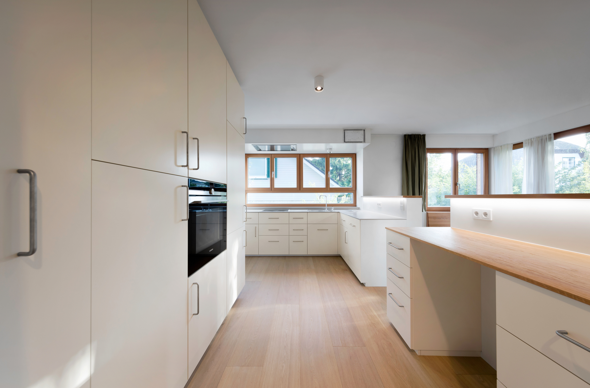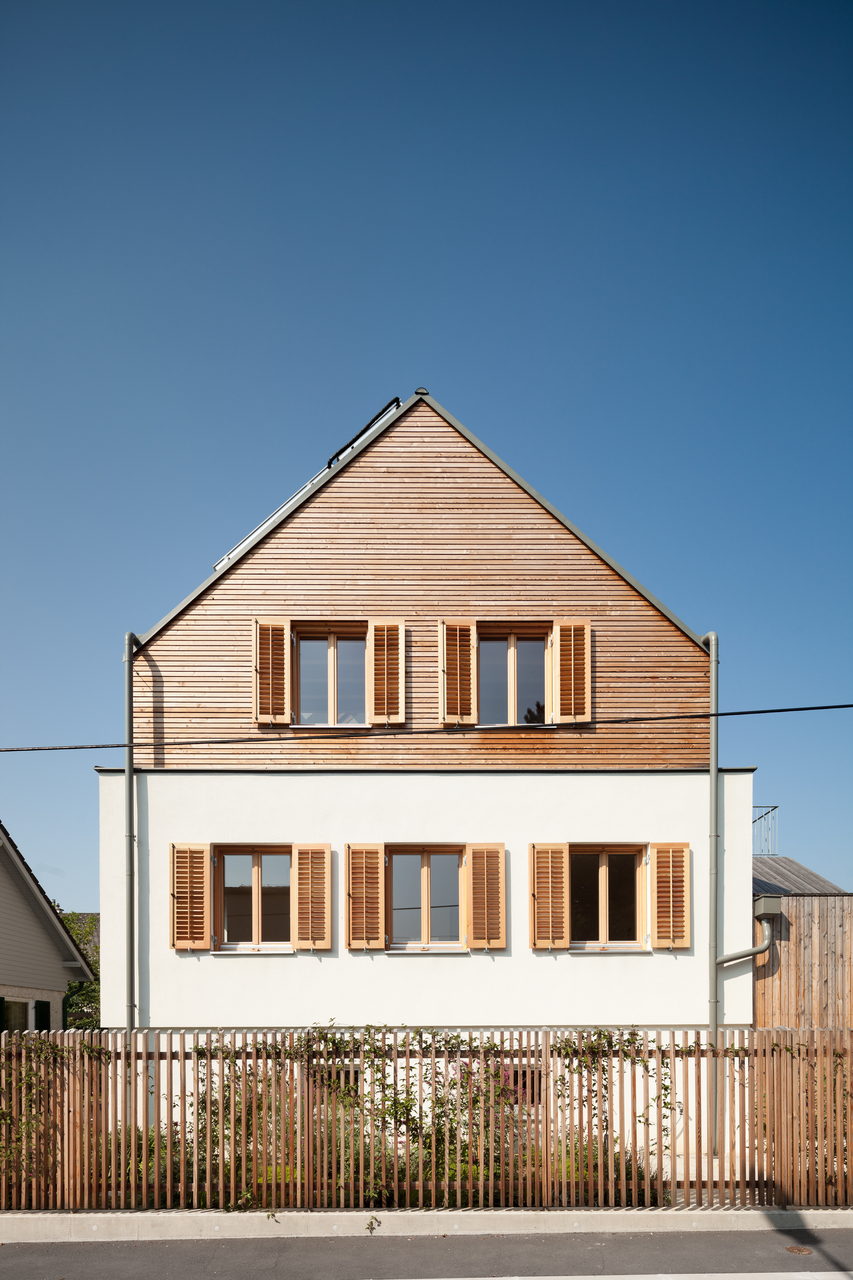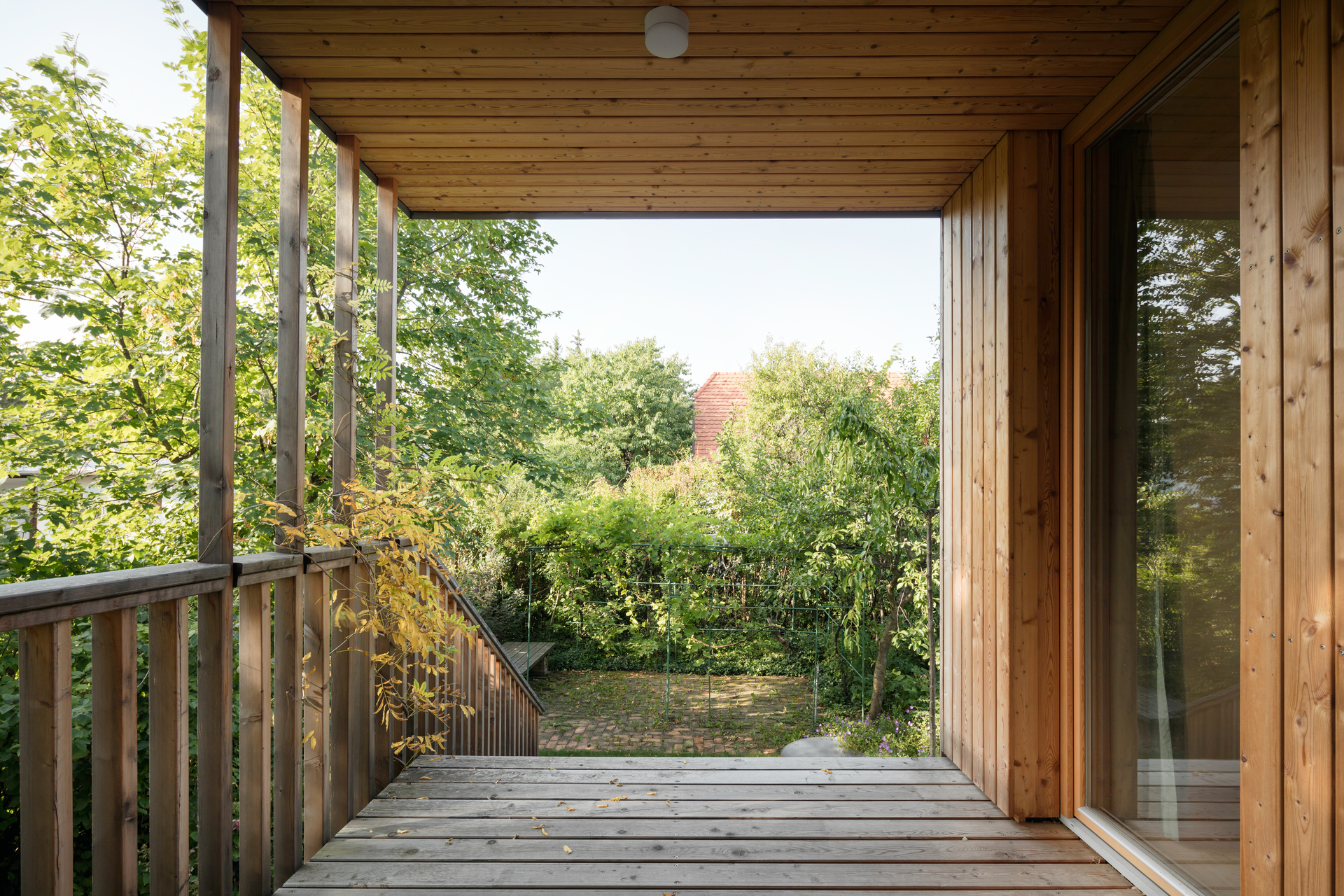 Unterhalb des westseitigen Zubaus befindet sich ein großer, von außen zugänglicher, geschützter Abstellbereich. Das Dach des westseitigen Zubaus ist teilweise als Flachdach ausgebildet. Dadurch konnte eine 2. sehr hoch liegende Terrasse mit Fernblick sowie beim Übergang zum Steildach ein großes Giebelfenster geschaffen werden, welches den Gang und den Stiegenbereich belichtet. Im Bereich des Steildaches wurden in den beiden ostseitigen Schlafzimmern Galerieebenen eingezogen. (Text: Architekt)