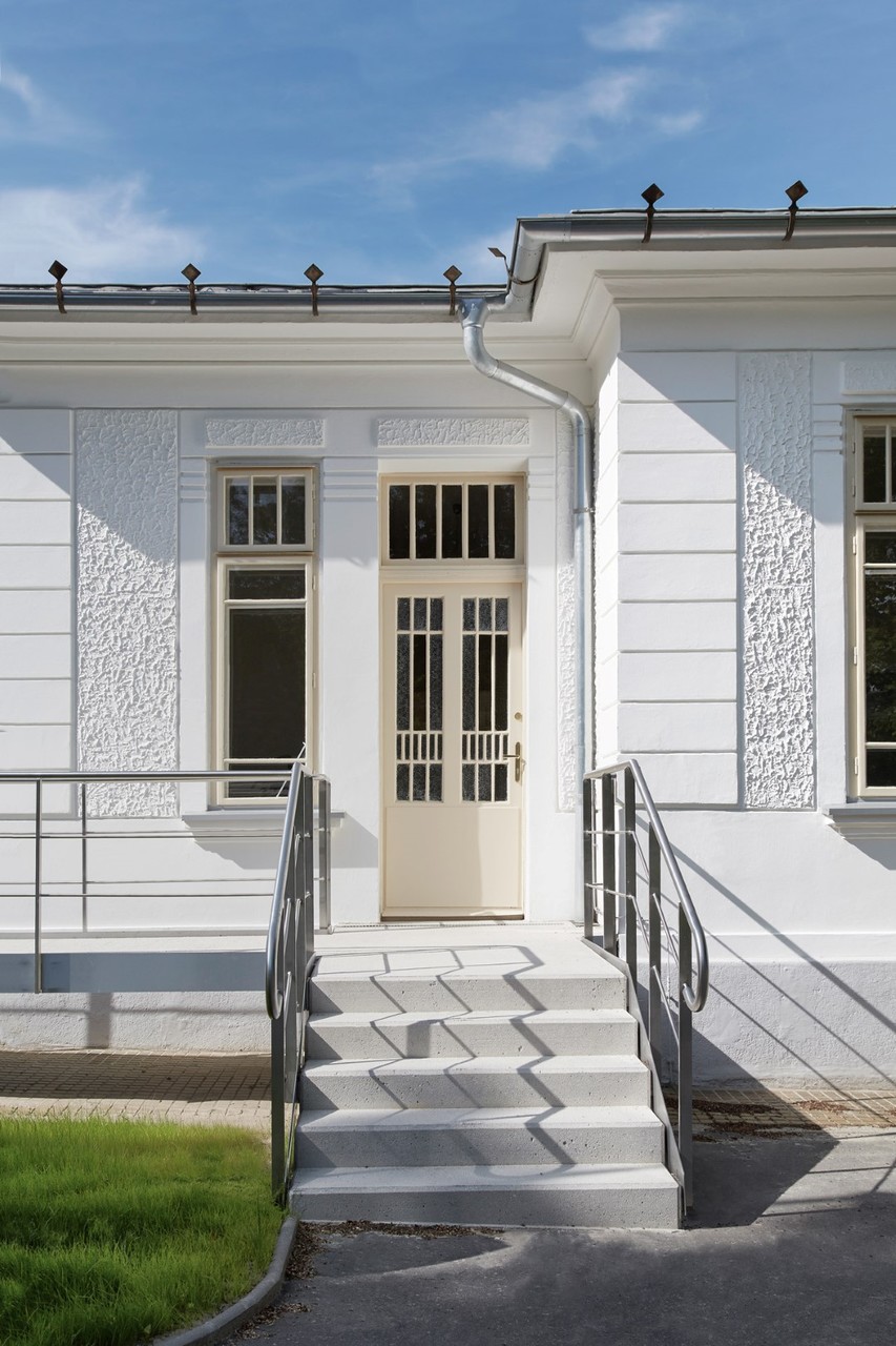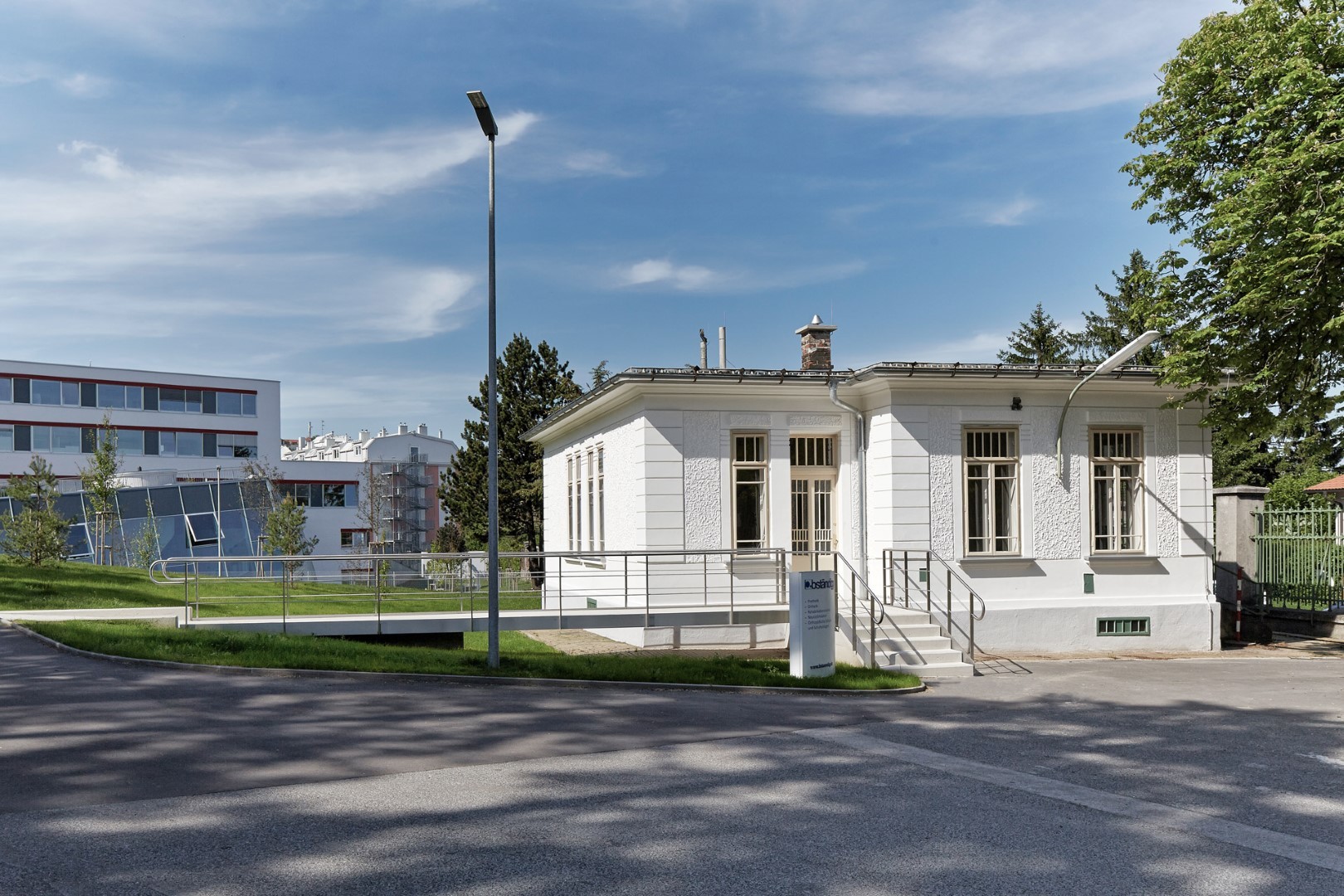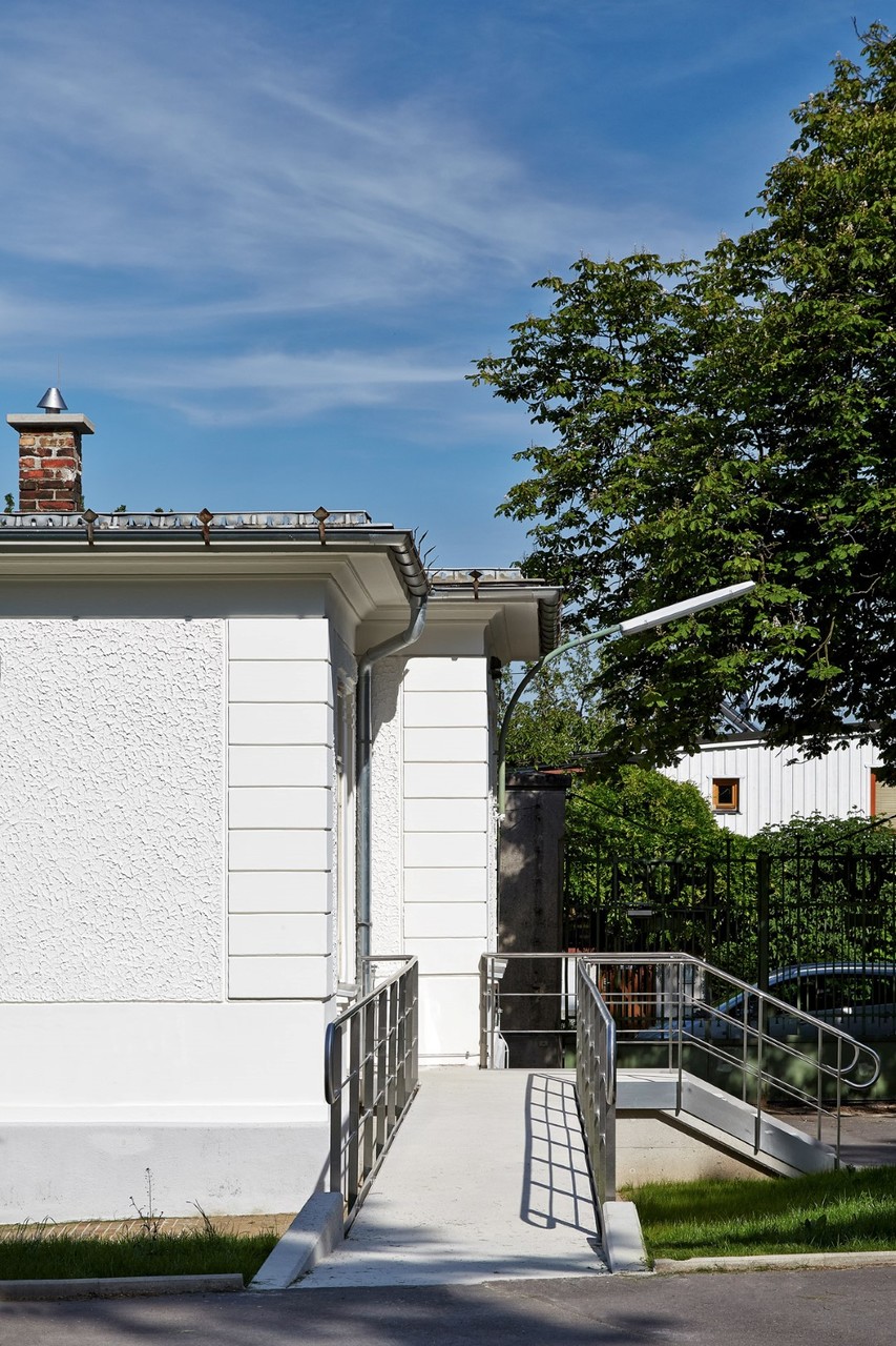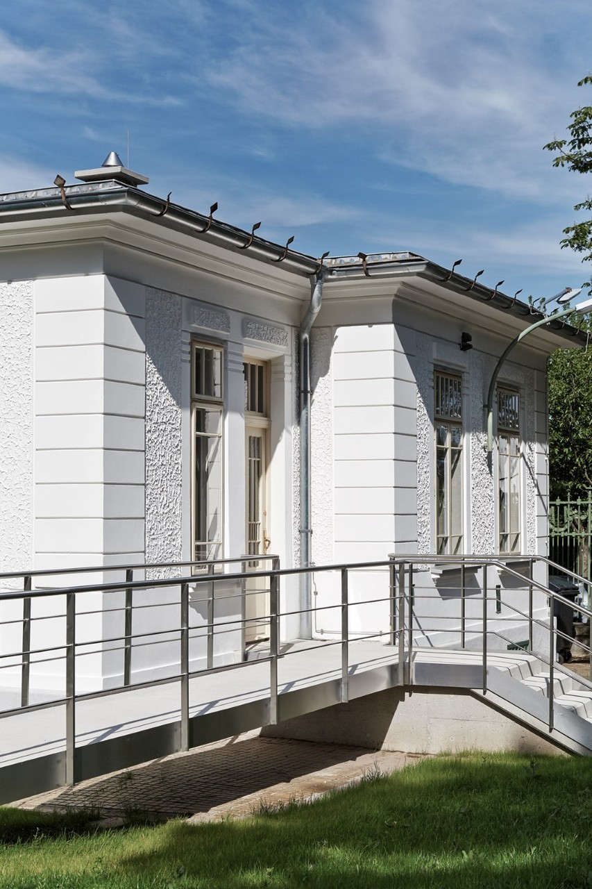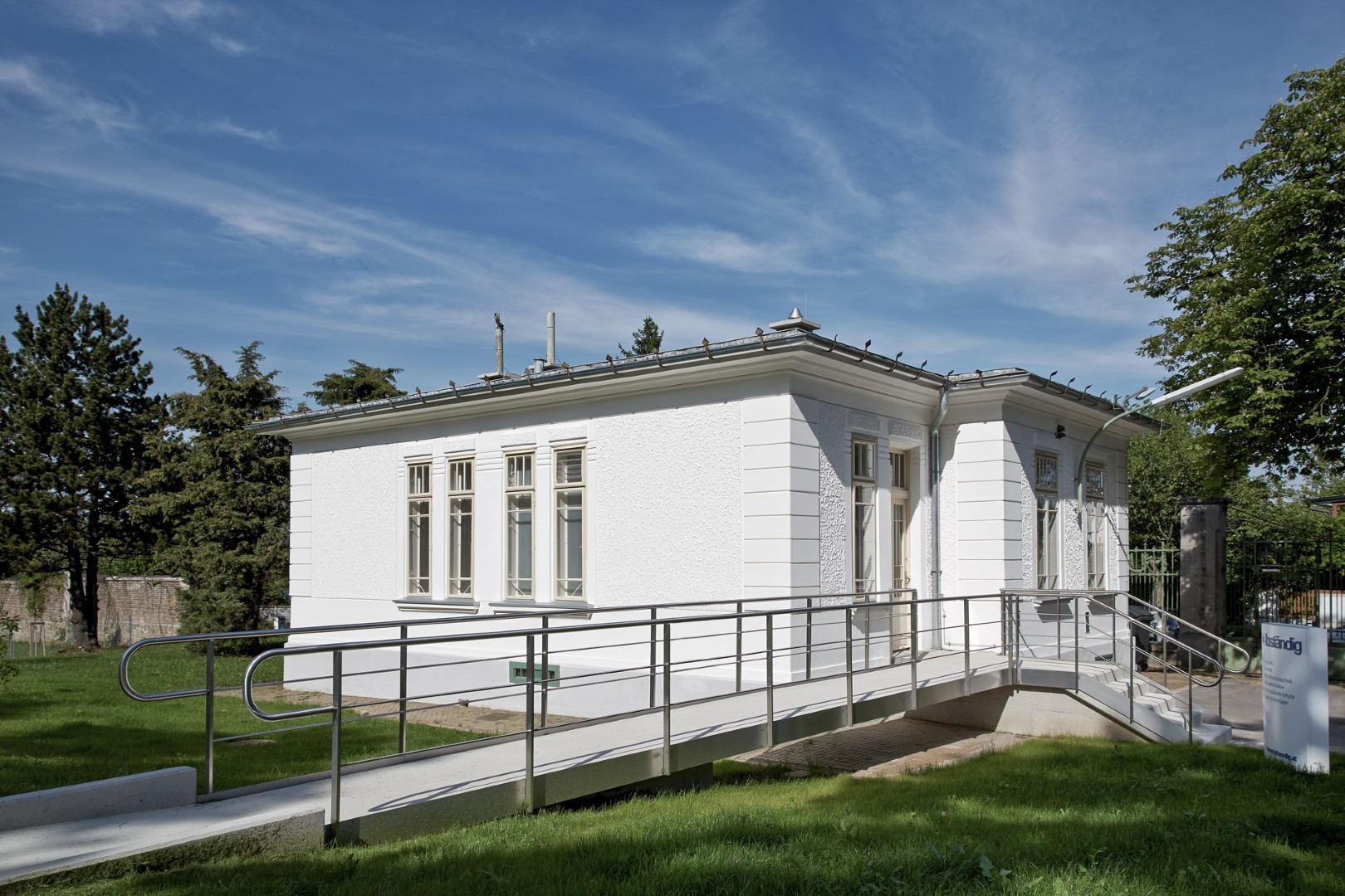 Ein denkmalgeschützter Pavillon von Otto Wagner auf dem Gelände der Baumgartner Höhe musste um einen neuen behindertengerechten Zugang ergänzt werden. Das ansteigende Gelände konnte in der Form genutzt werden, dass der Zugang zum Pavillon statt über eine Rampe über eine ebene Brücke sowie über einige Stufen erfolgen kann.Es wurden nur zwei Materialien verwendet: sandgestrahlter Sichtbeton für die Stufen und die Brücke, Edelstahl für das Geländer. Der Zubau präsentiert sich selbstbewusst, ohne dabei den Altbestand zu dominieren. (Text: Architekt)