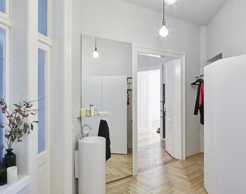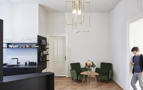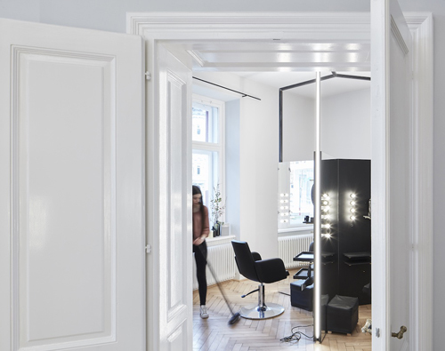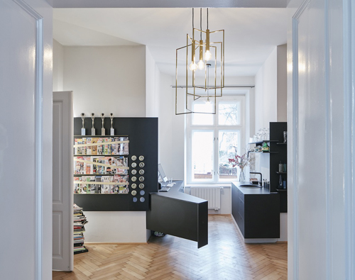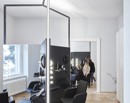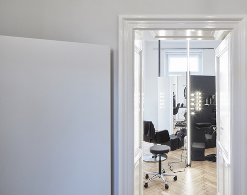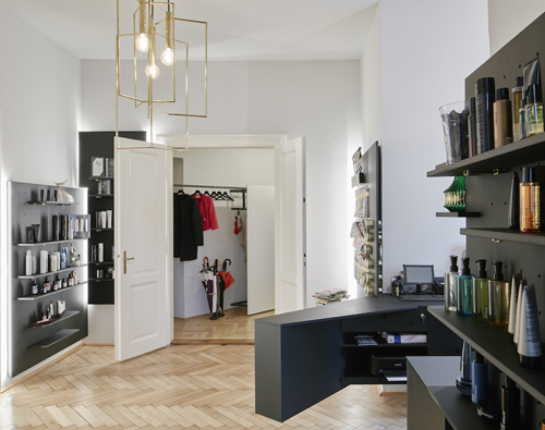 Die Schneideplätze sind als frei im Raum stehende, sternförmige Solitärmöbel konzipiert, in denen sich jeweils drei Arbeitsplätze mit der gesamten dafür notwendigen Infrastruktur befinden. Zusätzliches „Werkzeug“ wie Hauben oder Schneidemäntel verschwinden diskret hinter Paravents. Für den Eingangsbereich wurde ein Luster aus gelötetem Messing entwickelt, der formal die Sternform der Arbeitsplätze aufnimmt. (Text: Claudia Wedekind nach einem Text der Architekten)
