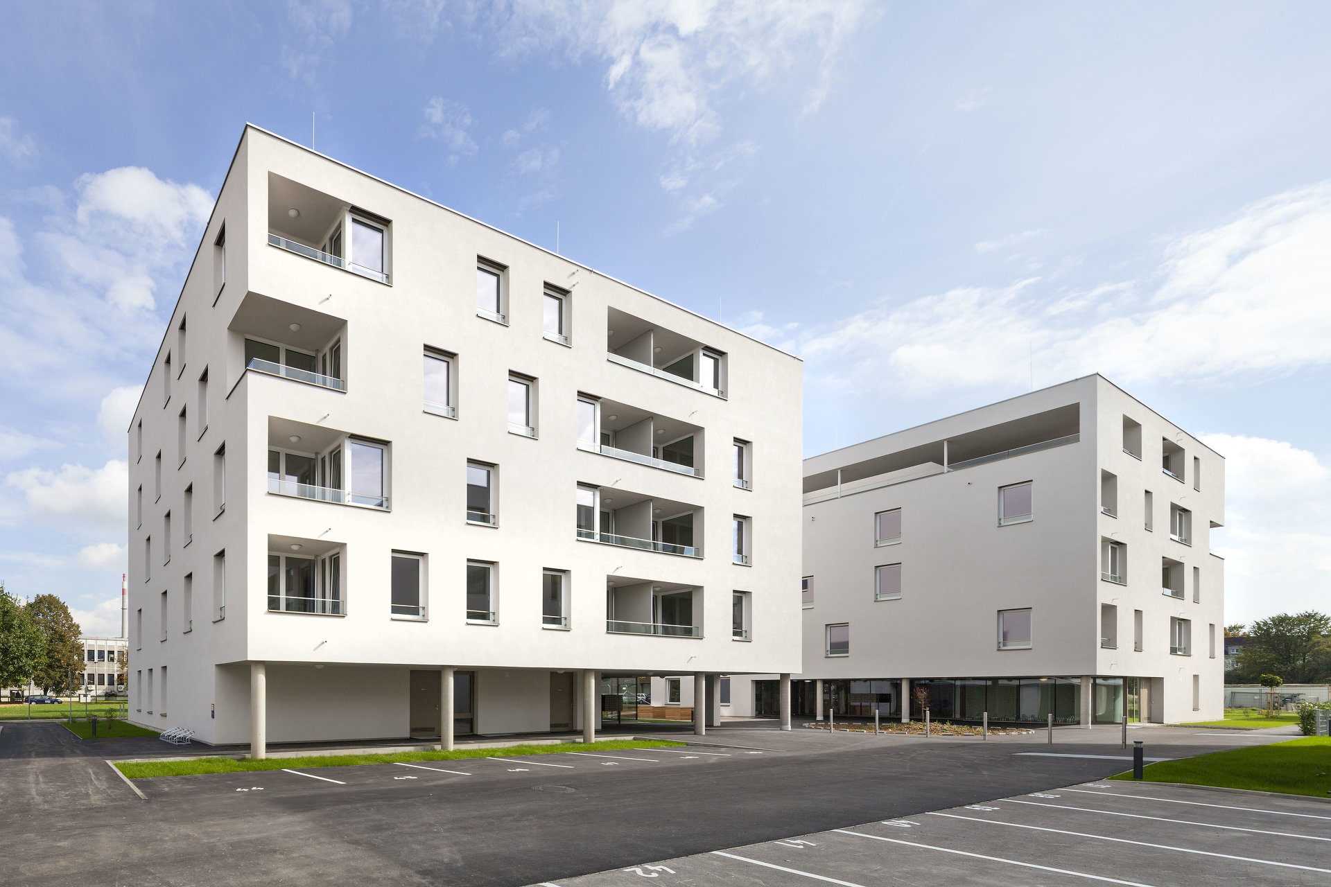 In den zwei annähernd gleich großen Punkthäusern gibt es je 51 Wohneinheiten mit zwei unterschiedlichen Wohnungstypen. Eine klare Strukturierung der Grundrisse und die vorwiegende Orientierung nach zwei Himmelsrichtungen sorgen für gute Belichtung und Querdurchlüftung. Die hellen, übersichtlichen Stiegenhäuser können als Begegnungs- und Kommunikationsbereiche genutzt werden. Sitzplätzchen, Zimmerpflanzen und sonstige individuelle Gestaltung schaffen eine vertraute Atmosphäre.