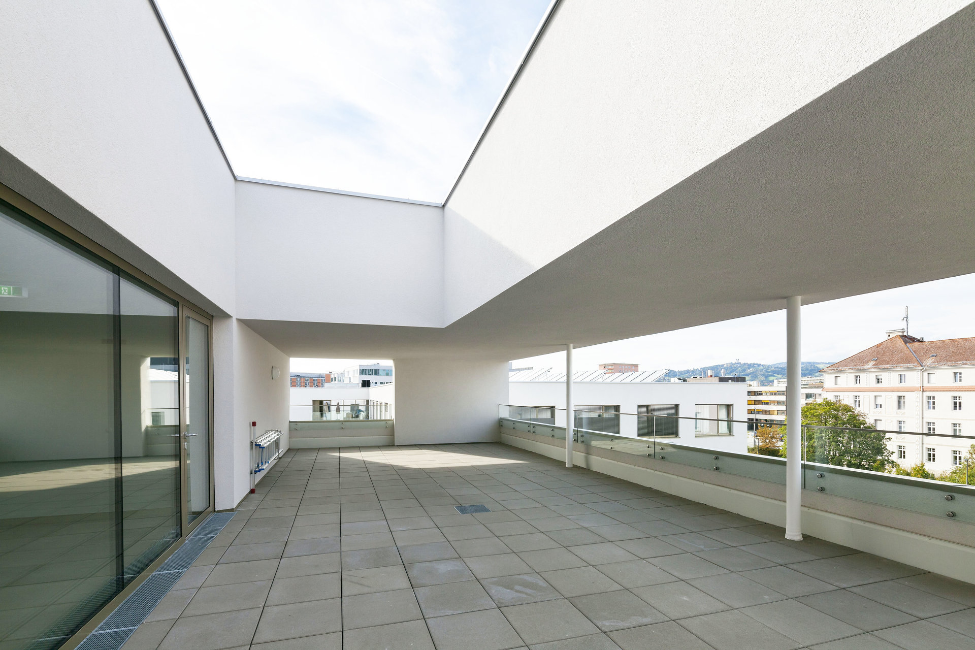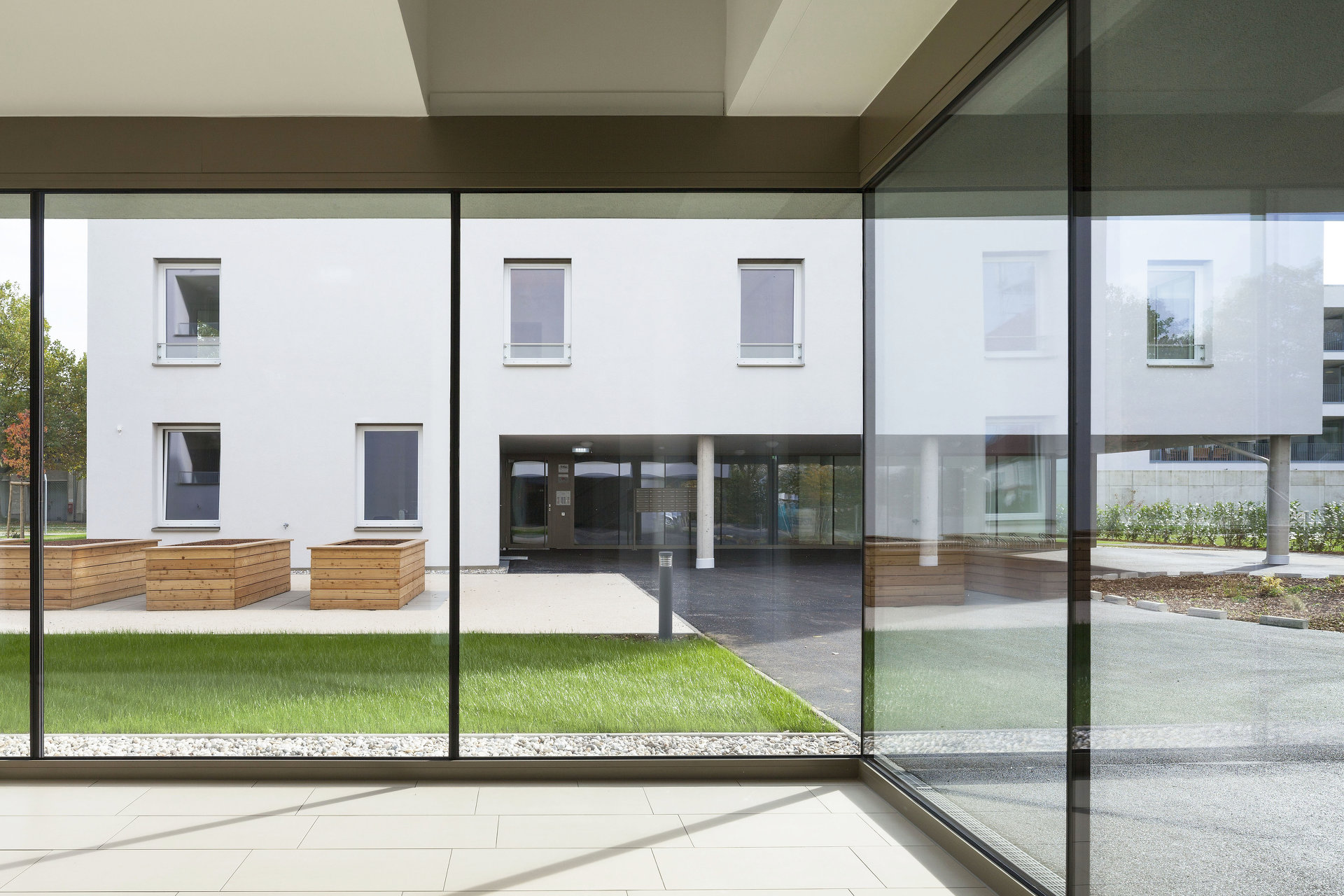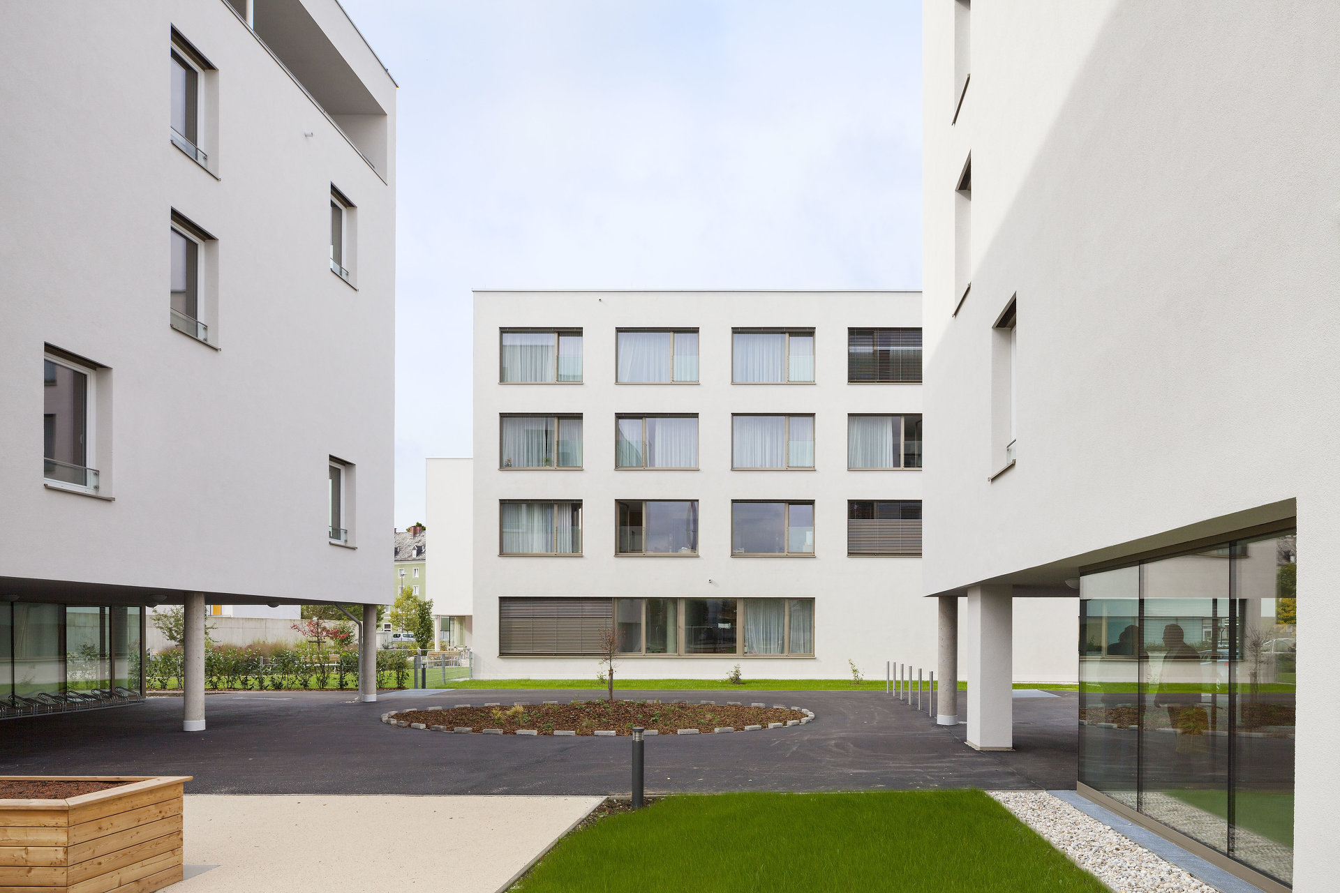 Die beiden Wohnhäuser werden über einen gemeinsamen Vorplatz erschlossen. Durch Gebäudeeinschnitte bei den Hauseingängen entstehen gedeckte Freibereiche, die den Vorplatz fassen und einen fließenden Übergang zwischen Innen und Außen schaffen. Mit den lichtdurchfluteten Eingangsbereichen bildet der Platz eine wichtige Drehscheibe für soziale Kontakte. Der anschließende Gemeinschaftsgarten mit Hochbeeten ist für die Bewohner:innen ein wohnungsnaher, kommunikativer Grünraum in dem sie auch aktiv werden können. Mit Ausnahme der Gartenterrassen der Erdgeschoßwohnungen ist der gesamte Freibereich für eine gemeinsame Nutzung offen. Ein „Stüberl“ am Platz und attraktive Gemeinschaftsterrassen am Dach ergänzen das Angebot für die Gemeinschaft.