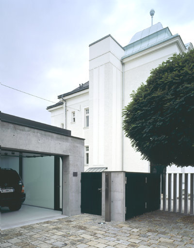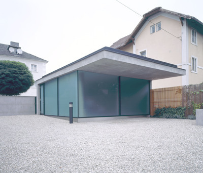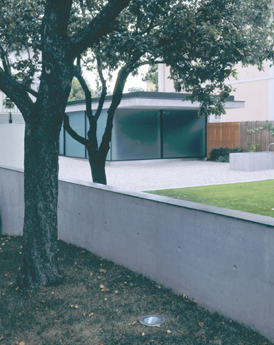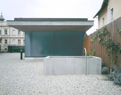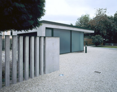 Der Garten gliedert sich nun in mehrere Ruhezonen: An den Eingangshof mit dem Autopavillon grenzt eine bekieste Fläche mit einem Wasserbecken aus Sichtbeton (auf die Achse des Erkers gesetzt), ein Wandelgarten mit Sitzbank bzw. der Privatgarten mit Terrasse. Präzise Kanten, bündige Oberflächen, eine ruhige Geometrie – die Grundstücksfläche ist subtil in verschiedene „Viertel“ mit unterschiedlichen Bepflanzungen, Zaun- und Mauersegmenten sowie Beleuchtungspunkten gegliedert. Den klar konturierten Autopavillon selbst umschließen an zwei Seiten geschoßhohe opake Glasflächen, die nachts von innen angestrahlt werden können. Ohne der bestehenden Villa zu Leibe zu rücken, ist mit sorgfältigen Massnahmen eine Neuordnung des Grundstücke geglückt, von der letztlich auch das Bestandshaus nur profitiert. (Text: Gabriele Kaiser, 20.11.2003)