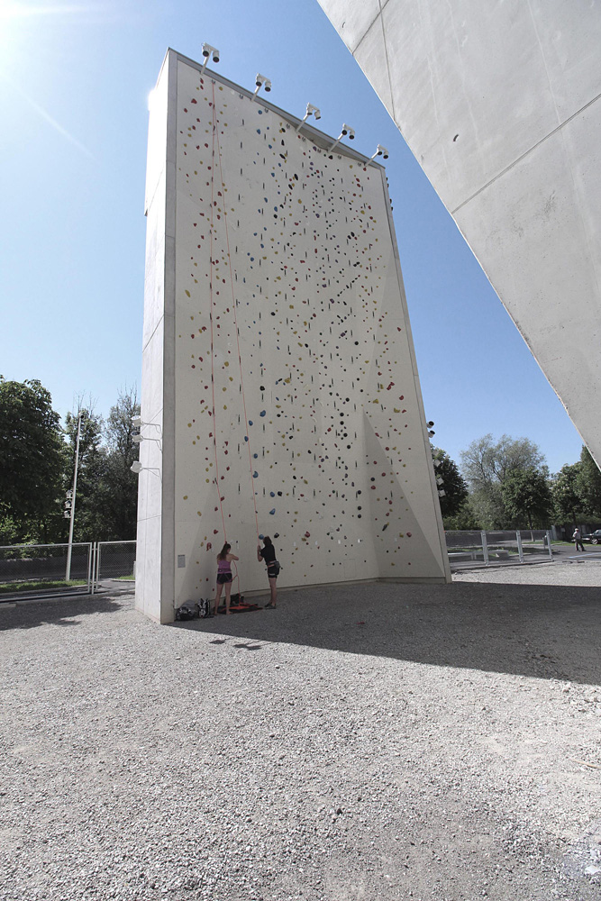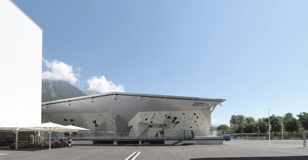Das aus einem Wettbewerb hervorgegangene Projekt von Thomas Schnizer besteht aus einem an die Ing.-Etzel-Straße gestellten Kubus, der zusammen mit drei freigestellten Kletterwänden und dem Bestand ein spannendes Ensemble bildet und dazwischen gut nutzbare Freiräume, insbesondere auch für Großveranstaltungen, schafft.