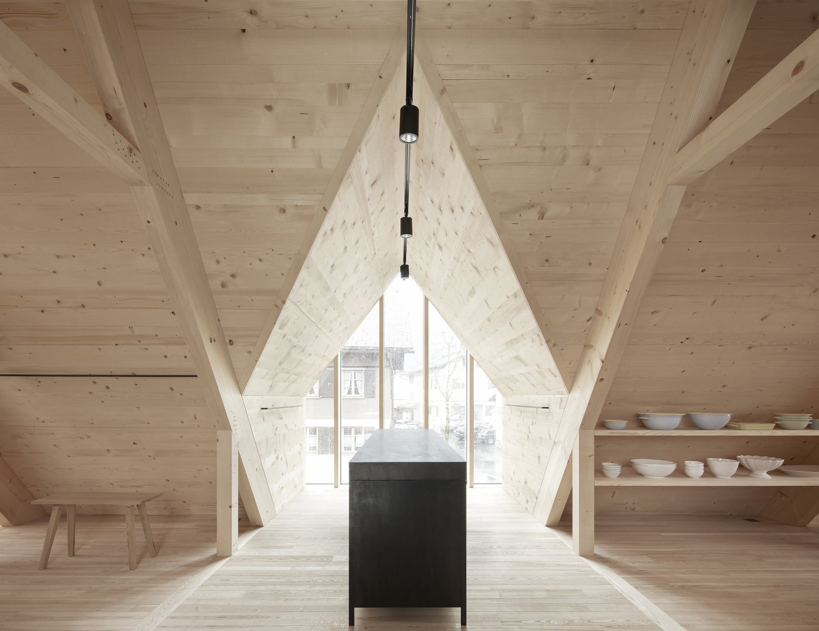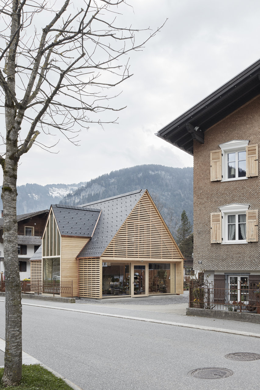 Die ortsansässigen Innauer-Matt Architekten konzipierten dafür ein Gebäude, das die typische Kreuzgiebelform Bregenzerwälder Handwerkerhäuser aufnimmt, das allerdings in Dimension, Materialisierung und Gestaltung optimal angepasst ist für die Zwecke des kleinen Schau- und Verkaufshauses. Unmittelbar an der Straße positioniert, bietet sich der Quergiebel in voller Höhe als Schaufensterfläche über beide Geschoße an. Im rückwärtigen Giebelelement wurde das Treppenhaus untergebracht. Wie Kassentresen und Küchenblock wurde die Treppe in Schwarzstahl ausgeführt. Ansonsten bestimmt das sägeraue, unbehandelte Holz von Konstruktion und Innenausbau das Bild, im Obergeschoß zudem der Boden aus Braunkernesche.