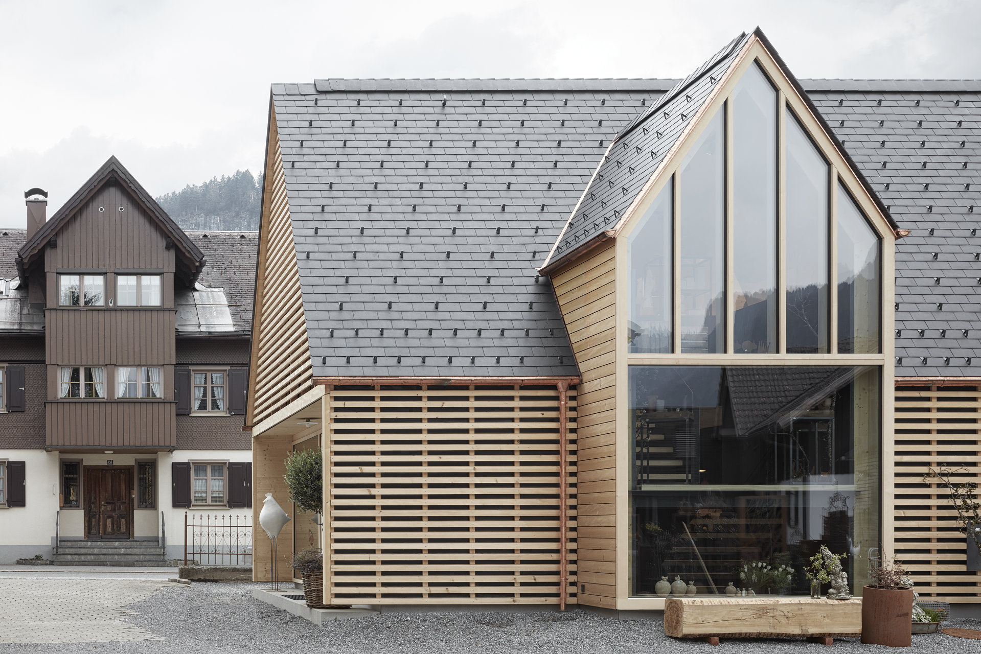 Der Haupteingang liegt dem Eingang zu den Schauräumen in der ehemaligen Werkstatt gegenüber. Zwischen Stammhaus und Erweiterungsbau entstand ein feiner, kleiner Platz. Horizontal gesetzte Weißtannenlatten bilden einen leichten, lichtdurchlässigen Fassadenschirm. Bemerkenswert ist der hohe Vorfertigungsgrad des Hauses: Das Dachgeschoß wurde in einem wenige Meter entfernten Betrieb gezimmert und im Ganzen auf das Erdgeschoß gesetzt. (Text: Tobias Hagleitner)
