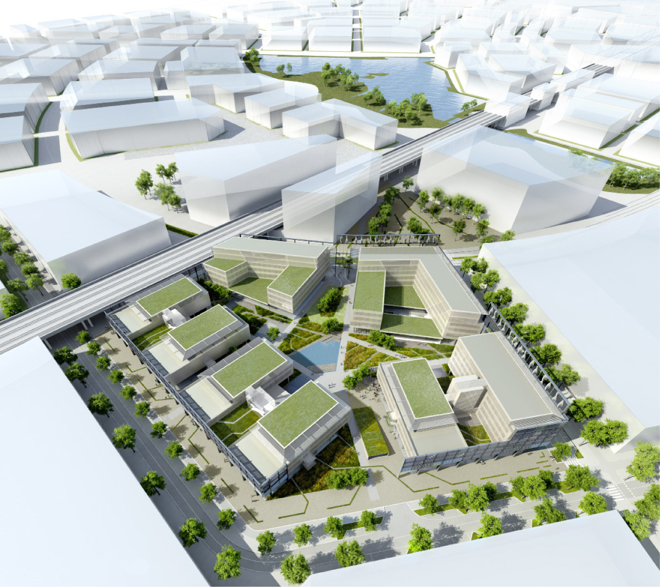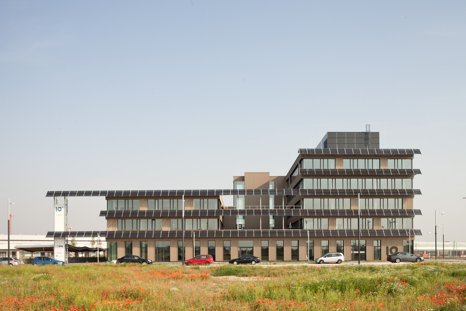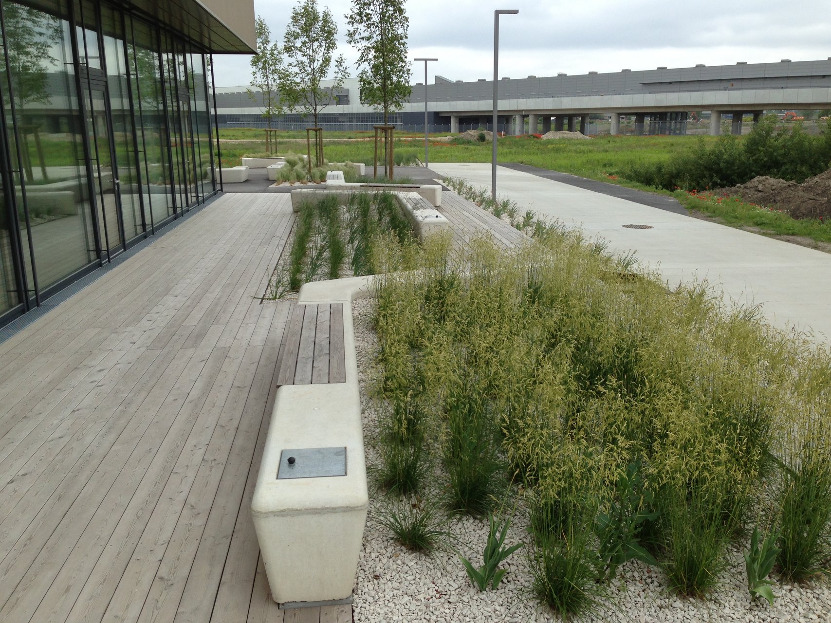 Die Randlage des Technologiezentrum aspern IQ zum zentralen See und die Nähe zu den Donauauen bildet das grundlegende Gestaltungsthema für den Freiraum- Masterplan. Ein übergeordnetes Wegenetz erschließt den Campus für Fußgänger und Radfahrer und gewährleistet eine übersichtliche Durchwegung. Das Wegesystem des Freiraums wird in vier Hierarchien eingeteilt. Befestigte Hauptwege und Ringerschließung, Holzstege für die Erschließung der abwechslungsreichen Rückzugsbereiche und ein untergeordnetes Netz aus Schotterwegen. Die Eingänge zu den Gebäuden sind von den Hauptwegen einsehbar und erleichtern damit die Orientierung. Zusätzlich schieben sich vor den Eingängen Ortbetonfelder wie Teppiche in den Freiraum. Diese großzügigen Entrees sind gleichzeitig Treffpunkte und Kommunikationsorte für die Mitarbeiter und Gäste.Mitte 2012 wurde als erstes der Bauteil 1 des Techno-logiezentrums aspern IQ fertiggestellt, für dessen Energiefassade idealice eine neuartige Gestaltung mit Schilf entwickelte. Die Fassade erhält durch das Schilf eine weiche, grüne Hülle mit kinetischen und akustischen Effekten und stellt eine konsequente Weiterführung der Thematik „Seeufer“ dar. Als Basis für die pflegeleichte Fassadenbegrünung dient eine lineare vorgesetzte Unterkonstruktion mit Pflanztrögen.