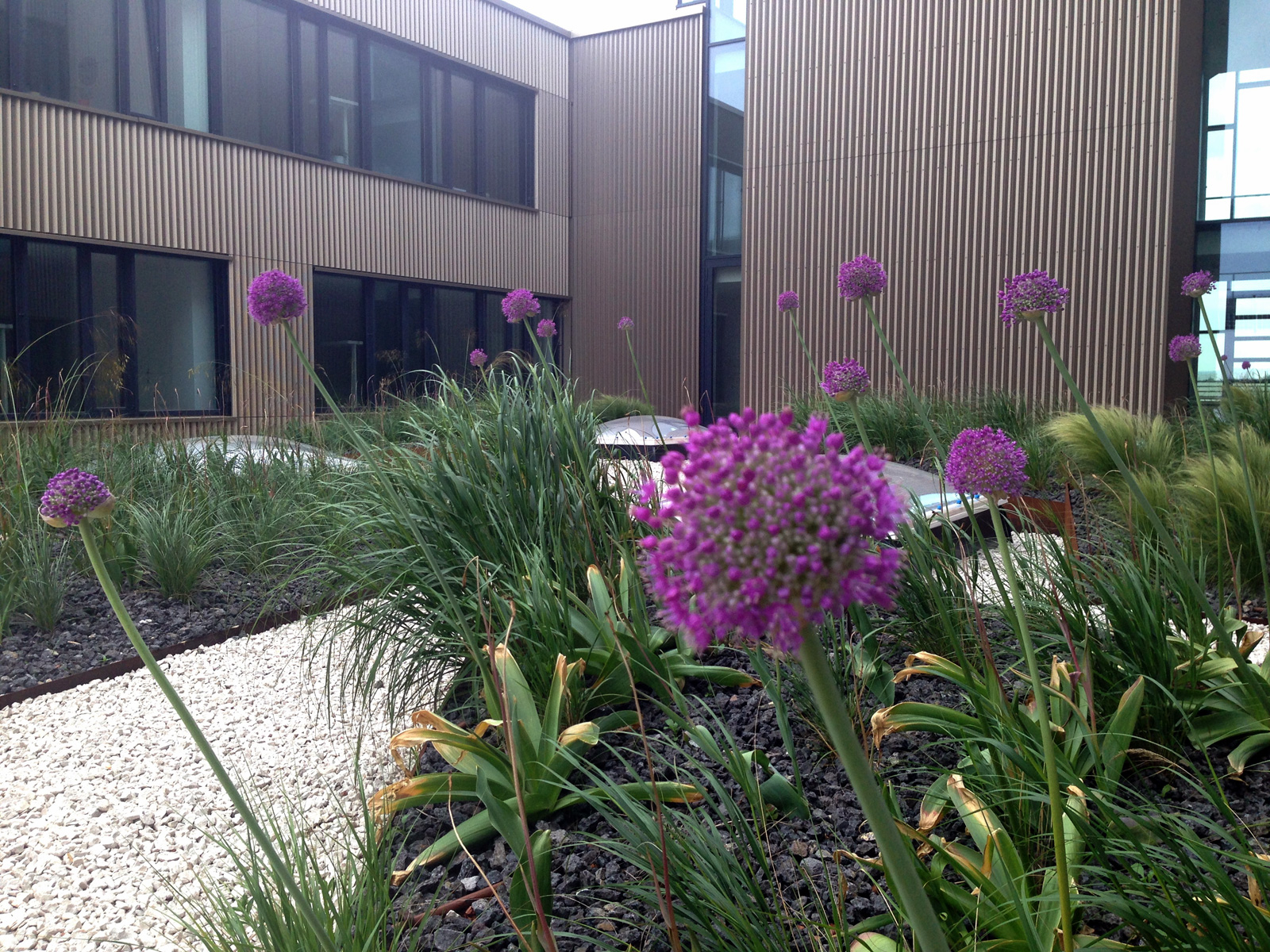 Den unterschiedlichen Nutzergruppen werden zusätzlich differenzierte Aufenthaltsbereiche angeboten. Die Mitarbeiter:innen erholen sich beispielsweise auf der Holzterrasse am Dach, im Restaurant mit Schanigarten oder in Rückzugsnischen vor dem Seminarbereich. Eine großzügige Durchgrünung des gesamten Freiraums schafft eine angenehme Atmosphäre. Großflächige Ziergräserfelder verstärken in Anlehnung an den Schilfgürtel das Stimmungsbild des Seeufers. Die Gräser erreichen maximal eine Höhe von einem Meter und gewährleisten damit stets die Überschaubarkeit. (Text: Landschaftarchitektin)
