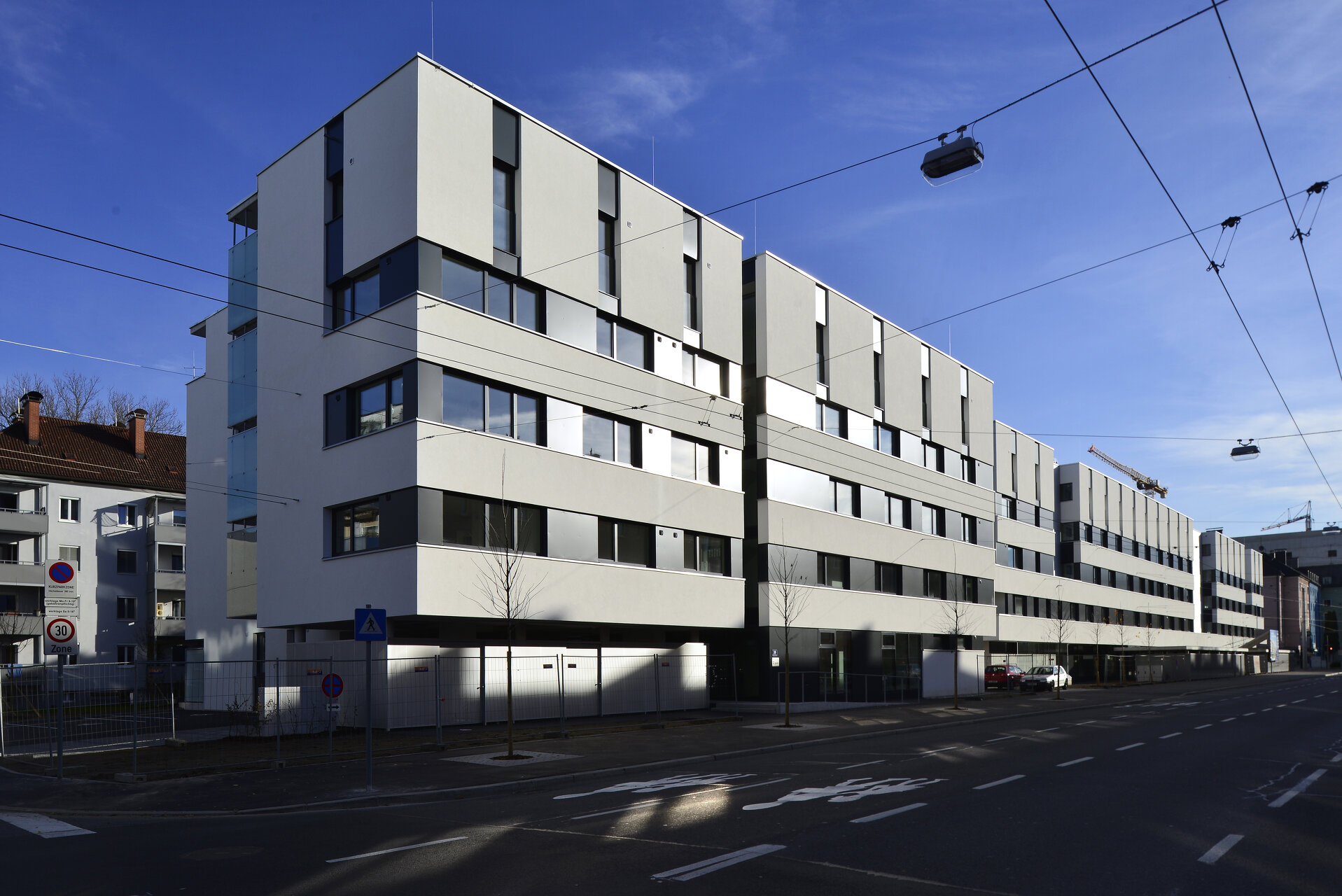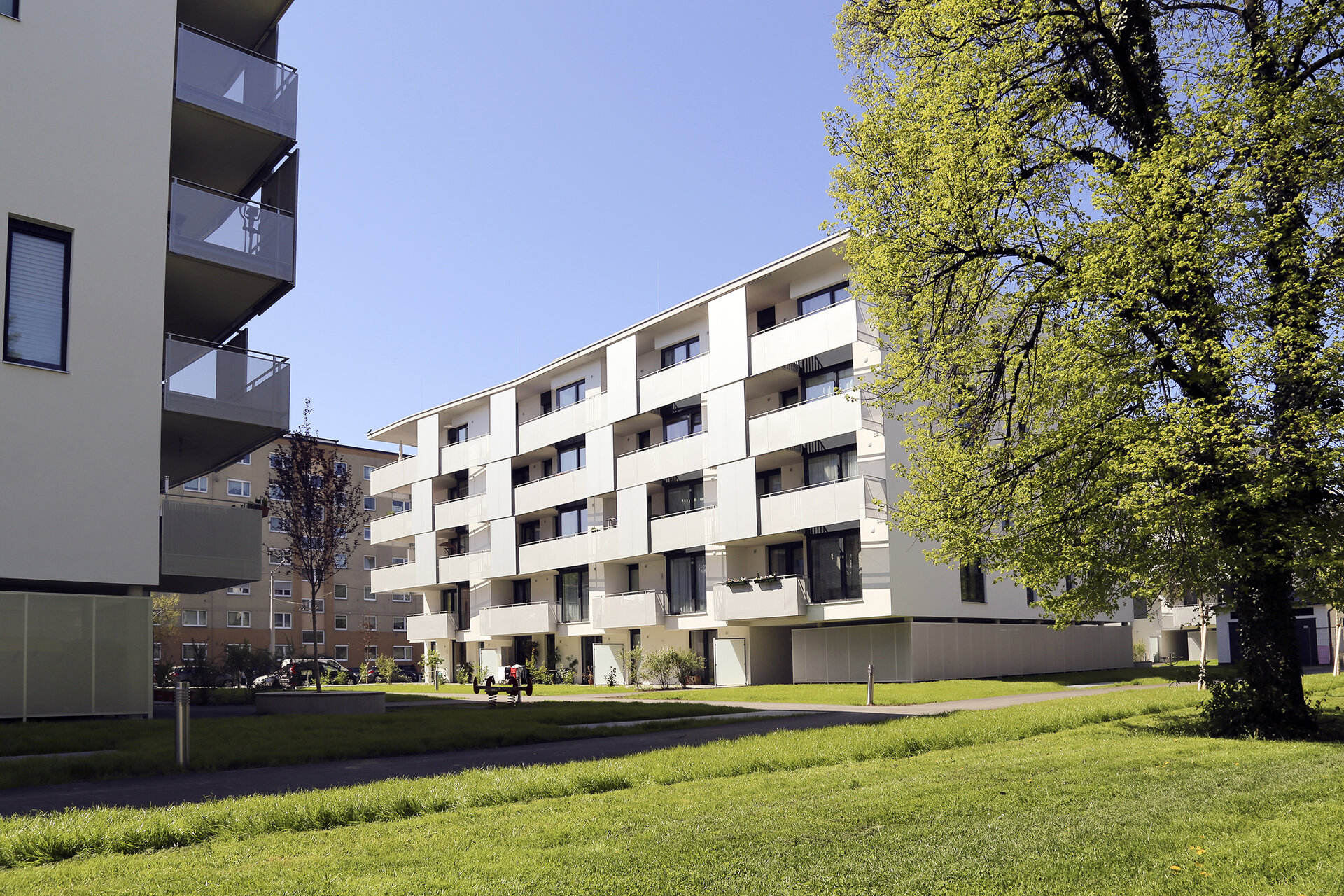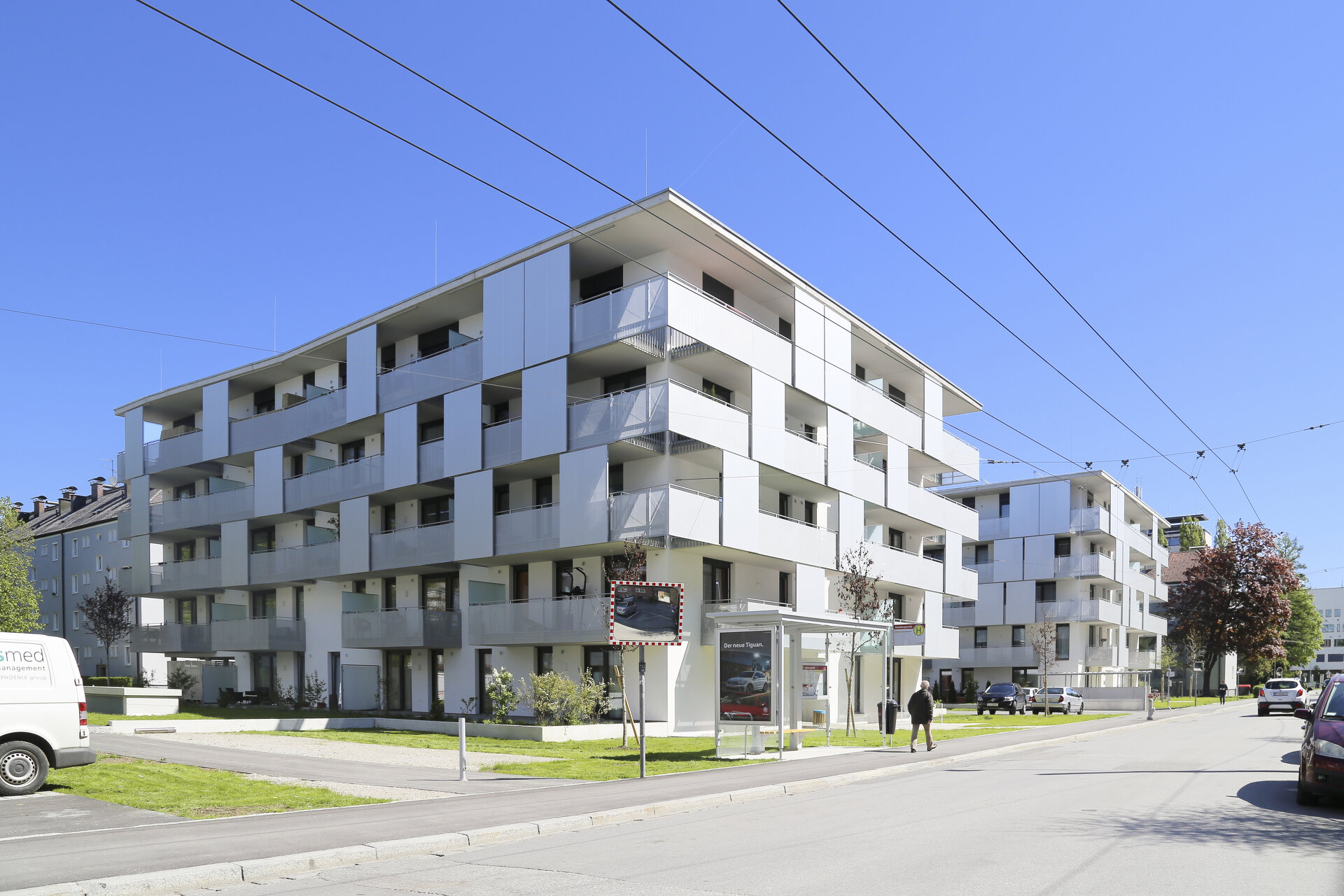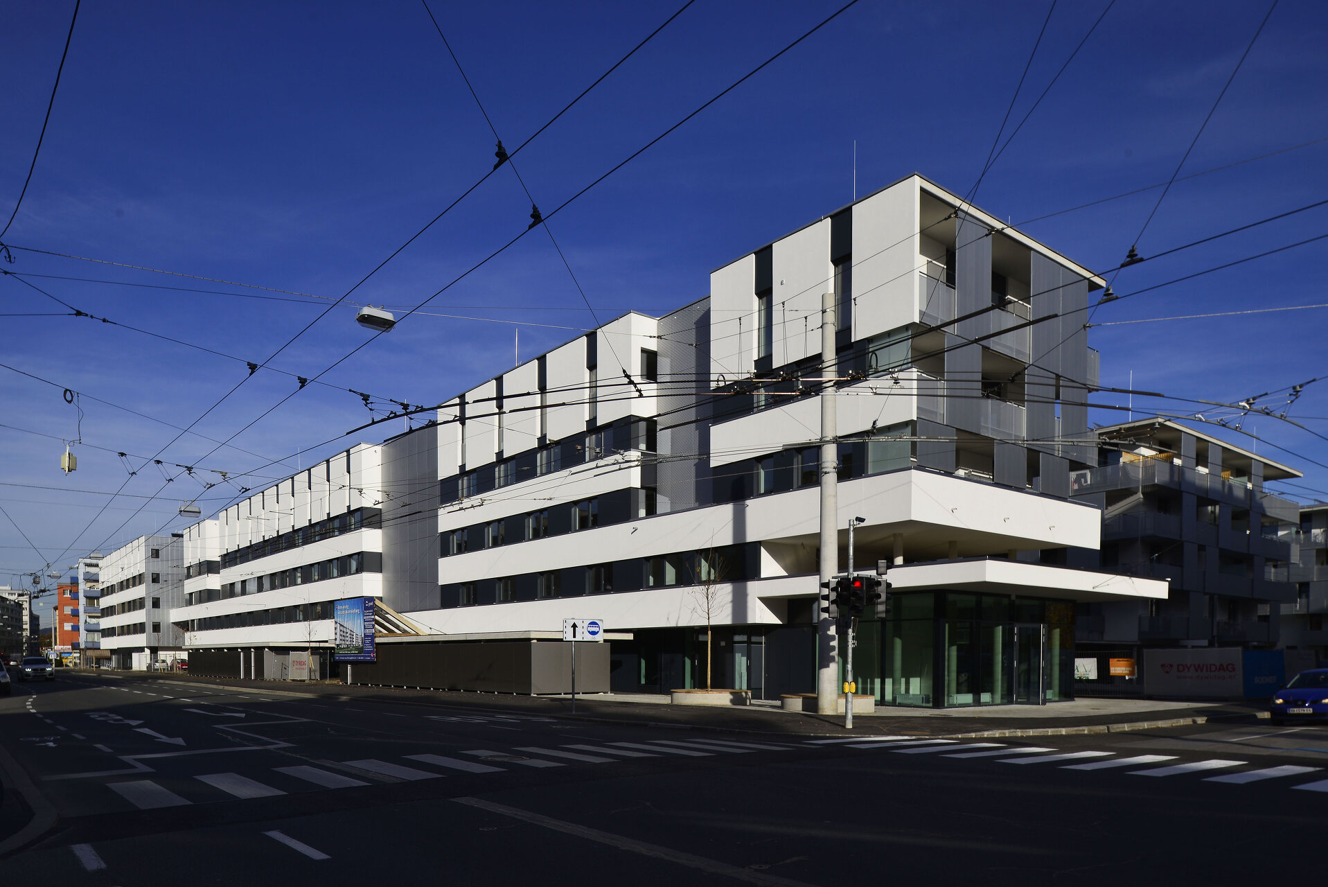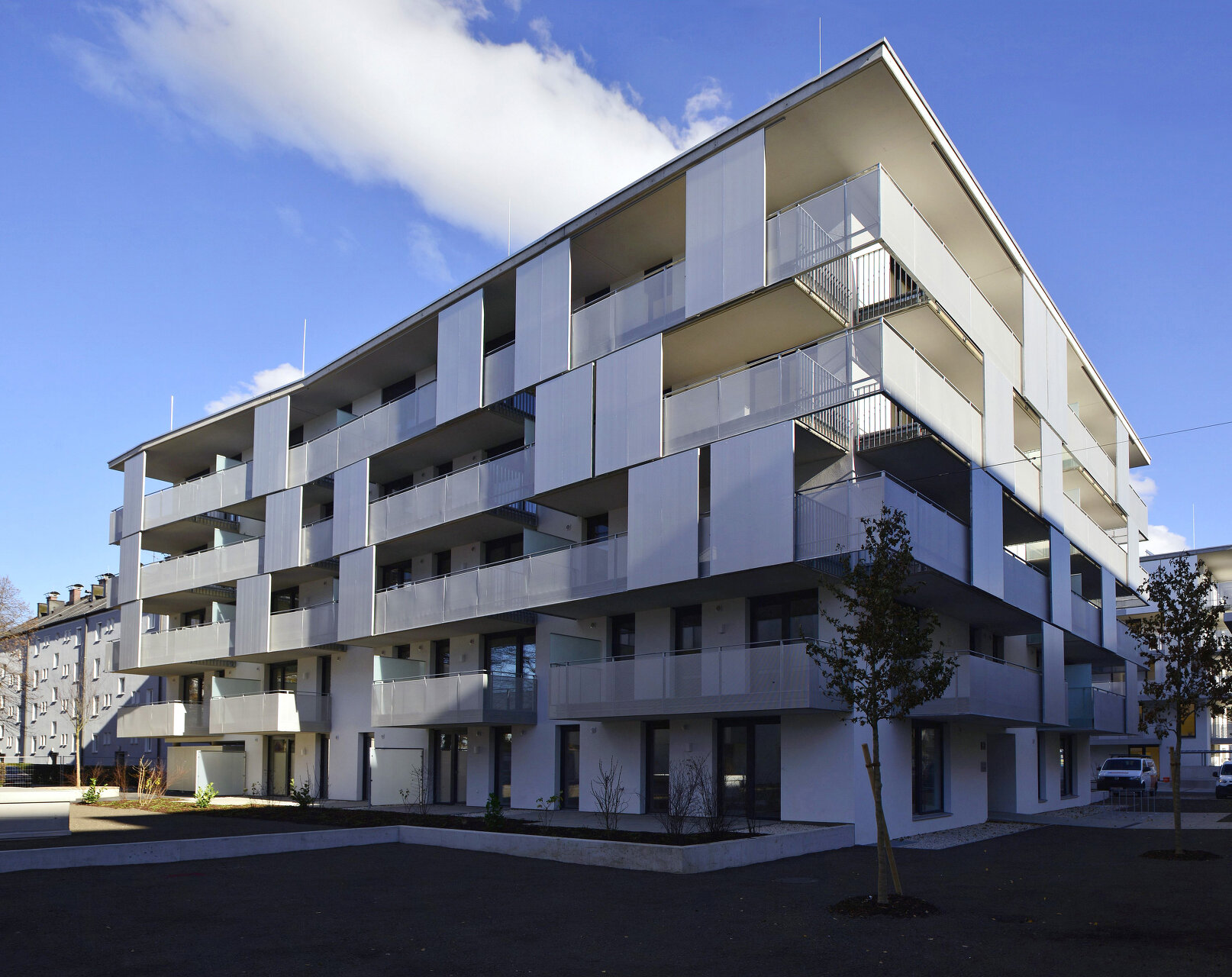 Die Wohnungen in den fünfgeschoßigen Baukörpern sind barrierefrei geplant und mit vorgelagerten und transluzenten Schiebepaneelen lärm- sowie sichtgeschützten Balkonen und Terrassenbereichen konzipiert.