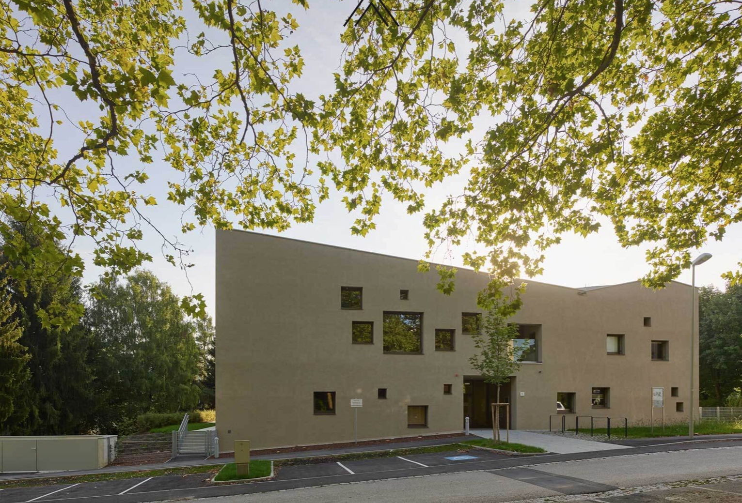 Die Kompaktheit des quadratischen Grundrisses fordert eine Auseinandersetzung mit dem Thema Dach und der Gesamthaften Erscheinung des Baukörpers. Über die Diagonale des Volumens spannt sich eine gefaltete Dachkonfiguration die dem Inneren eine spannende dritte räumliche Dimension verleiht und in jedem Raum den Bezug zum Ganzen herstellt. Das Aufeinandertreffen von Dach und Fassade ist ein Abbild der räumlichen Komplexität und verleiht einer sonst gelangweilten Horizontalität einen städtebaulichen Anspruch. Die Fassade des Baukörpers ist übersät mit einer Vielzahl von quadratischen Öffnungen die mit den unterschiedlichen Blickwinkeln aus dem Raum heraus den Bezug zur Umgebung herstellen. Die homogene Fassadenoberfläche bietet die beruhigte Basis für diese differenzierte Anordnung der Fenster und Öffnungen entsprechend eines Kindergerechten Maßstabes. (Text: Architekten)