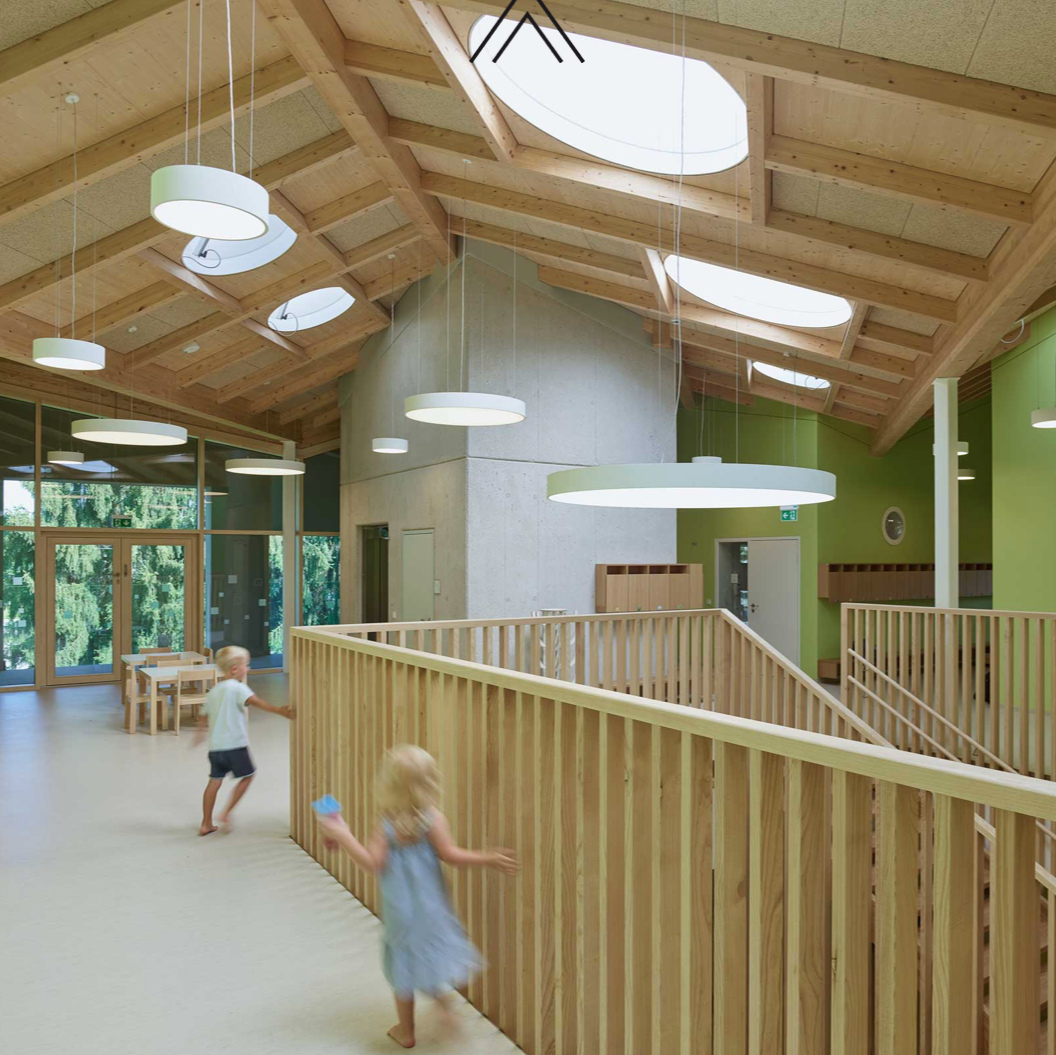 Die Grundintention für den Entwurf des neuen Kinderbetreuungszentrums ist das Schaffen eines kompakten Volumens, das alle Funktionen gleichwertig beinhaltet und in seinem Inneren durch eine „Marktplatzähnliche“ Struktur ein hohes Maß an Übersicht Klarheit und guter Organisation der Nutzungen ermöglicht. Der großzügige Innenraum ist an allen vier Seiten durch die Eingänge bzw. Gartenzugänge an die umliegenden Freiflächen angeschlossen der Grundriss bietet eine optimale Durchwegung für die Kinder und deren Bewegungsdrang. Die beiden Einrichtungen Kindergarten und Eltern-Kind-Zentrum haben Ihre getrennten Eingänge an den zur Schiffmannstrasse ausgerichteten Seiten. Die Gruppenräume im Kindergarten sind vorwiegend gartenseitig orientiert, die Garderoben haben im Anschluss immer einen Freibereich zum Garten oder zu einer Loggia.