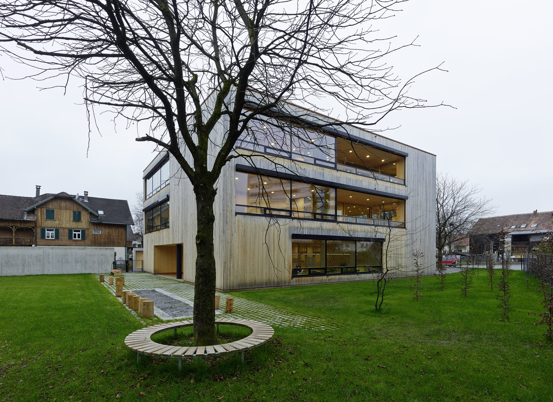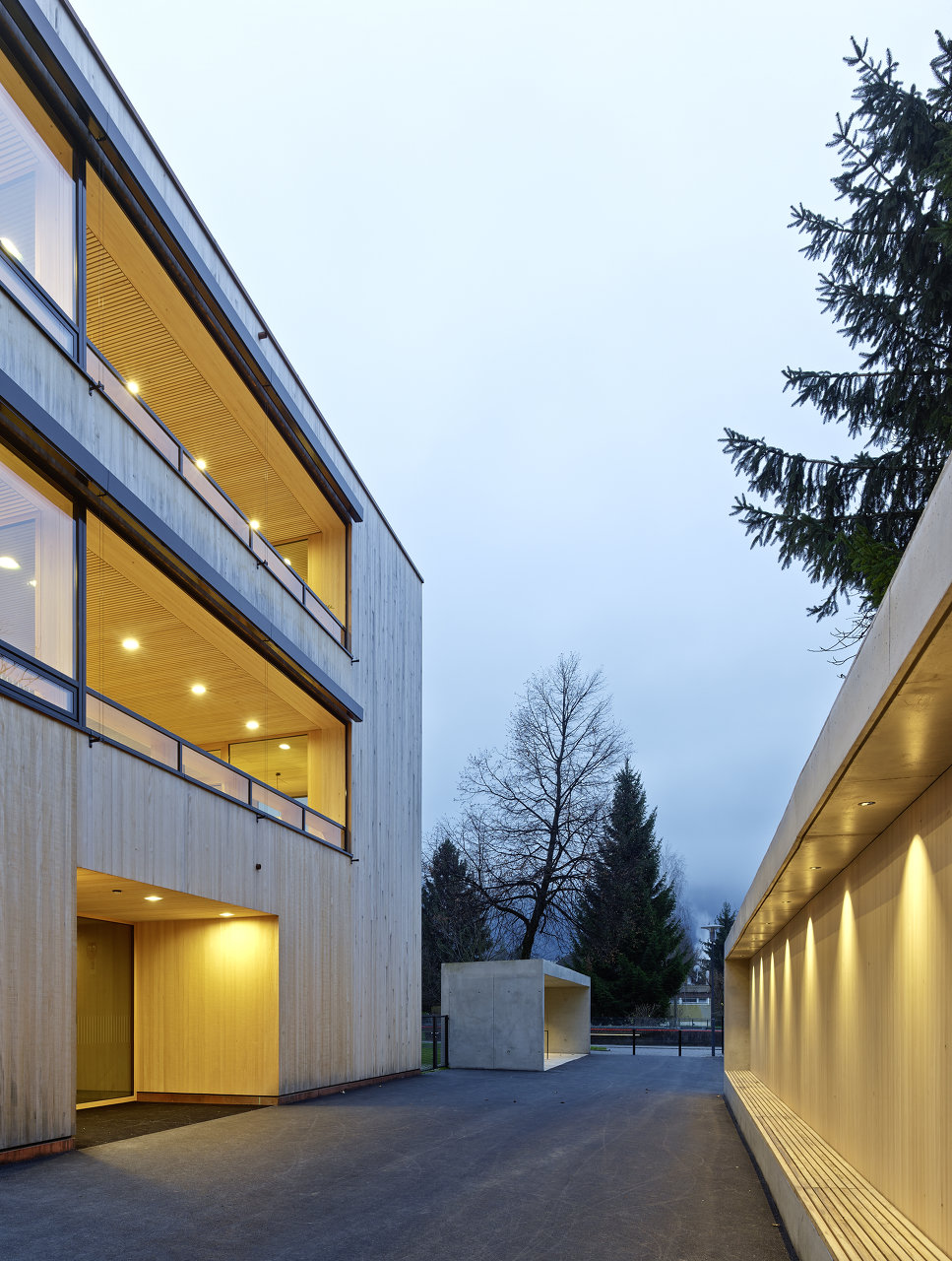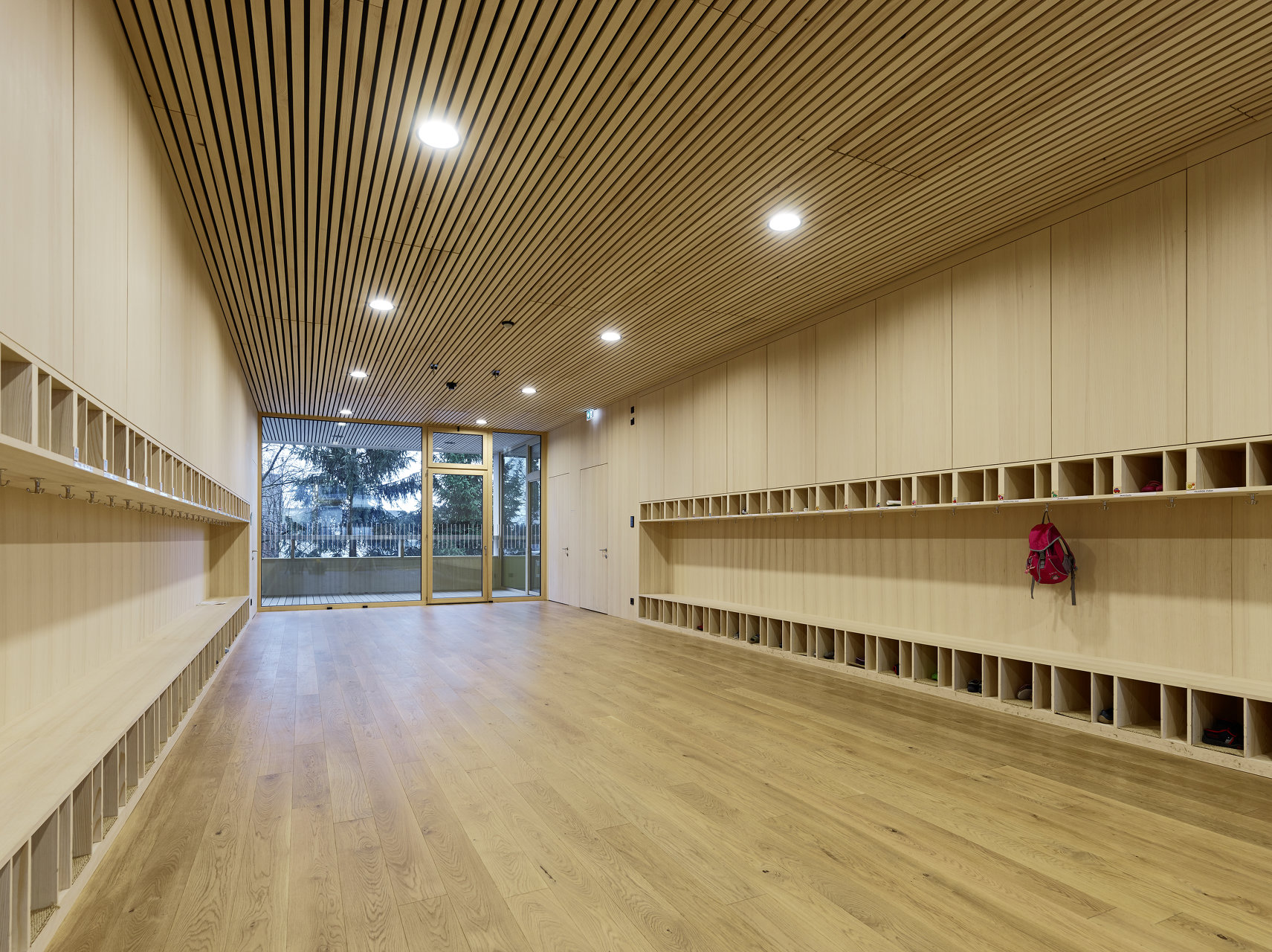Die Innenräume wurden an Boden, Wand und Decke überwiegend mit Holzbrettern aus regionalen Wäldern ausgekleidet. Die Fensterelemente erhielten kleinmaßstäbliche, auf die Größe der Kinder abgestimmte Fensterflügel. Nach den strengen Kriterien des „Kommunalen Gebäudeausweis“ des Land Vorarlberg errichtet, wurde besonderes Augenmerk auf die energietechnische und bauökologische Qualität des Gebäudes gelegt. (Text: Tobias Hagleitner nach einem Text der Architekten)