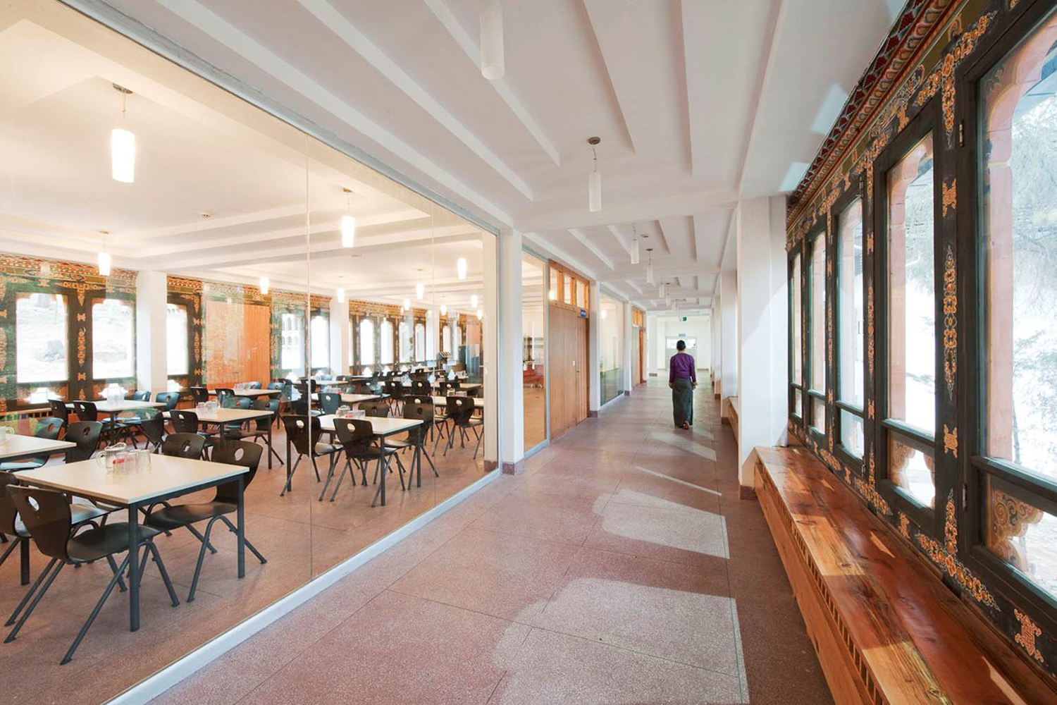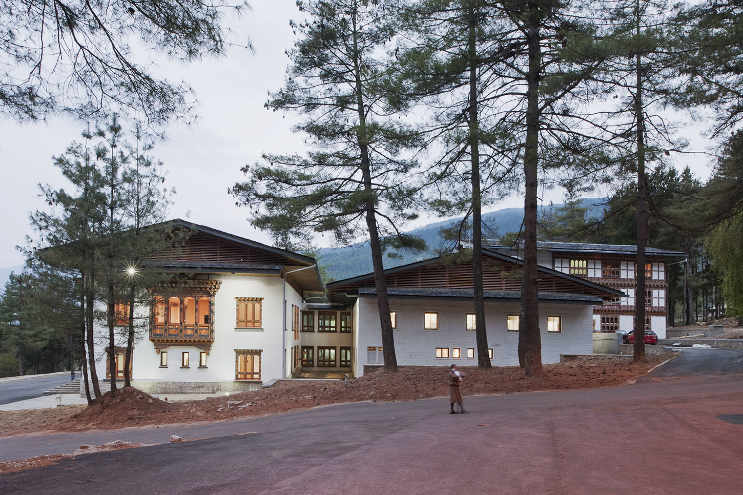 Hotel und Tourismusschule liegen in einem parkähnlichen Gelände im Wohnviertel Mothithang am westlichen Rande der Stadt Thimpu. Das 4000 m² große ehemalige Old Mothithang Hotel von 1974 wurde funktionell und technisch adaptiert, um darin die notwendigen Einrichtungen einer Tourismusschule wie Studentenheim, Küche, Speisesaal, Trainingsbar und Kantine sowie Klassenräume unterzubringen. Neuerrichtet wurde die mit der Schule in baulicher Verbindung stehende Veranstaltungshalle sowie das Traininghotel, das auf einer Anhöhe etwas abseits der Schule liegt.Die technische Umsetzung musste an die in Bhutan beschränkt verfügbaren Baumaterialien, die schwierigen Transportwege und an die bescheidenen handwerklichen und gebäudetechnischen Standards angepasst werden. Die Planung des prototypischen Gebäudes erfolgte möglichst unabhängig von der Funktion des Gebäudes, um auch auf andere Bauwerke anwendbar zu sein.