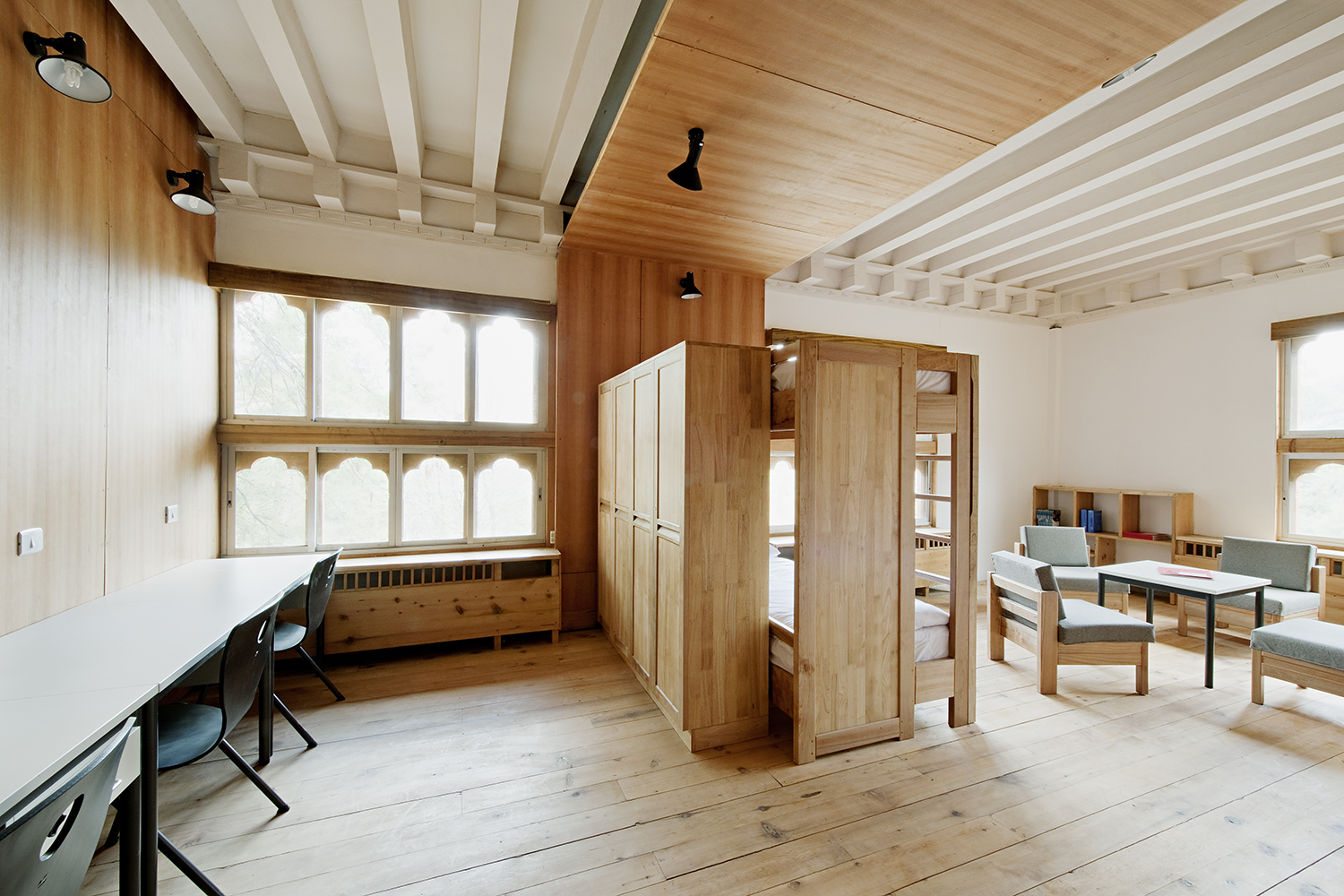 An einen relativ kompakten Kern mit Aufzug und Hauptstiege im Zentrum des blockartigen Baukörpers wurden die Zimmer als „Rucksäcke“ herumgruppiert. Die beiden übereinanderliegenden Zimmergeschosse kragen leicht über das Erdgeschoss, in welchem die allgemeinen Hotelbereiche wie Restaurant, Lobby, Rezeption und Lounge angesiedelt sind. (Text: Architektin)
