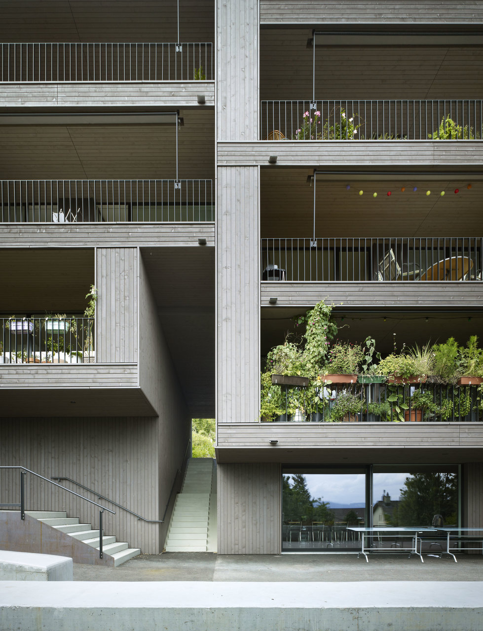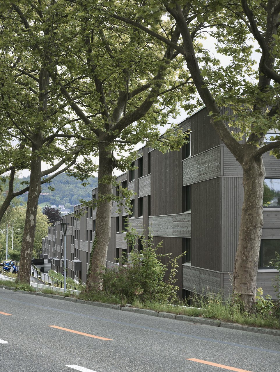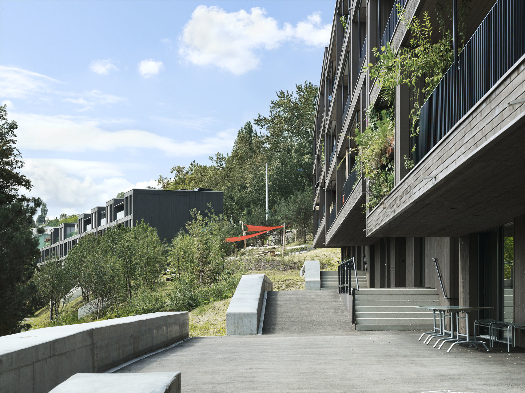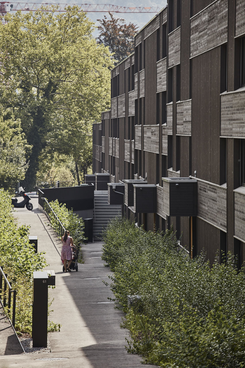 Beide Gebäude sind leicht abgetreppt und erhalten ihre Form durch den topografischen Verlauf, die Erschliessung und die Strasse. Der Genossenschaftsteil wird parallel zum Anstieg der Strasse gestaffelt. Die untere Hangetage erhält gemeinschaftliche Bereiche wie Hobbyräume, Farradabstellplätze und Kinderkrippen sowie eine vorgelagerte, gedeckte Zone für die Begegnungen der Bewohner. In der inneren Organisation ermöglichen Abstufung und horizontale Verschiebung unterschiedliche Wohntypen. Sämtliche Schlafzimmer sind südseitig orientiert und erhalten Zugang zur durchlaufenden Balkonschicht. Der viergeschossige Eigentumsteil wird linear auf der Anhöhe entwickelt und horizontal über Brücken erschlossen. Zentrales räumliches Element ist der beidseitig orientierte Wohn-Ess-Raum. Dieser wird gegen Norden überhoch ausgebildet und schliesst gegen Süden mit einer Loggia ab. Die dunkel gestrichene, sägerohe Holzfassade tritt als Geflecht mit vertikalen und horizontalen Elementen in Erscheinung, die ein variantenreiches Wechselspiel prägt. Dieses Geflecht lässt das Ensemble, das aus vielen einzelnen Häusern besteht, dennoch als eine Ganzheit erscheinen. Gleichzeitig verleiht die gewebte Fassade dieser Einheit Leichtigkeit. Die Erstellung in Holzbauweise mit einer inneren tragenden Betonstruktur gewährleistet bei einem kompakten Wandaufbau einen hochwertigen Wärmeschutz. (Text: Architekten)